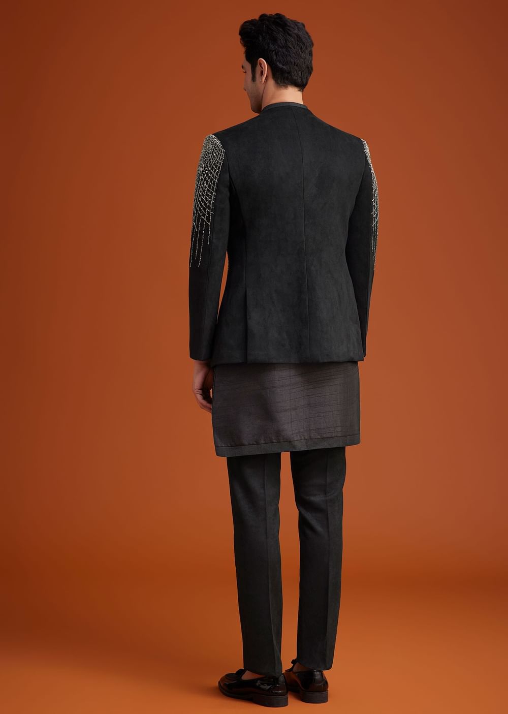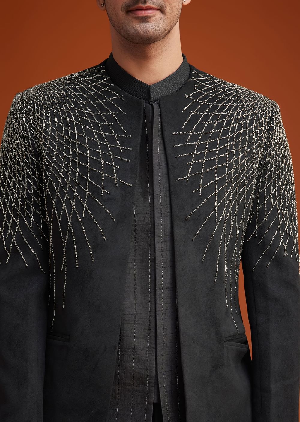 - This striking black Indo jacket is designed with a structured silhouette, blending tradition with modern craftsmanship.