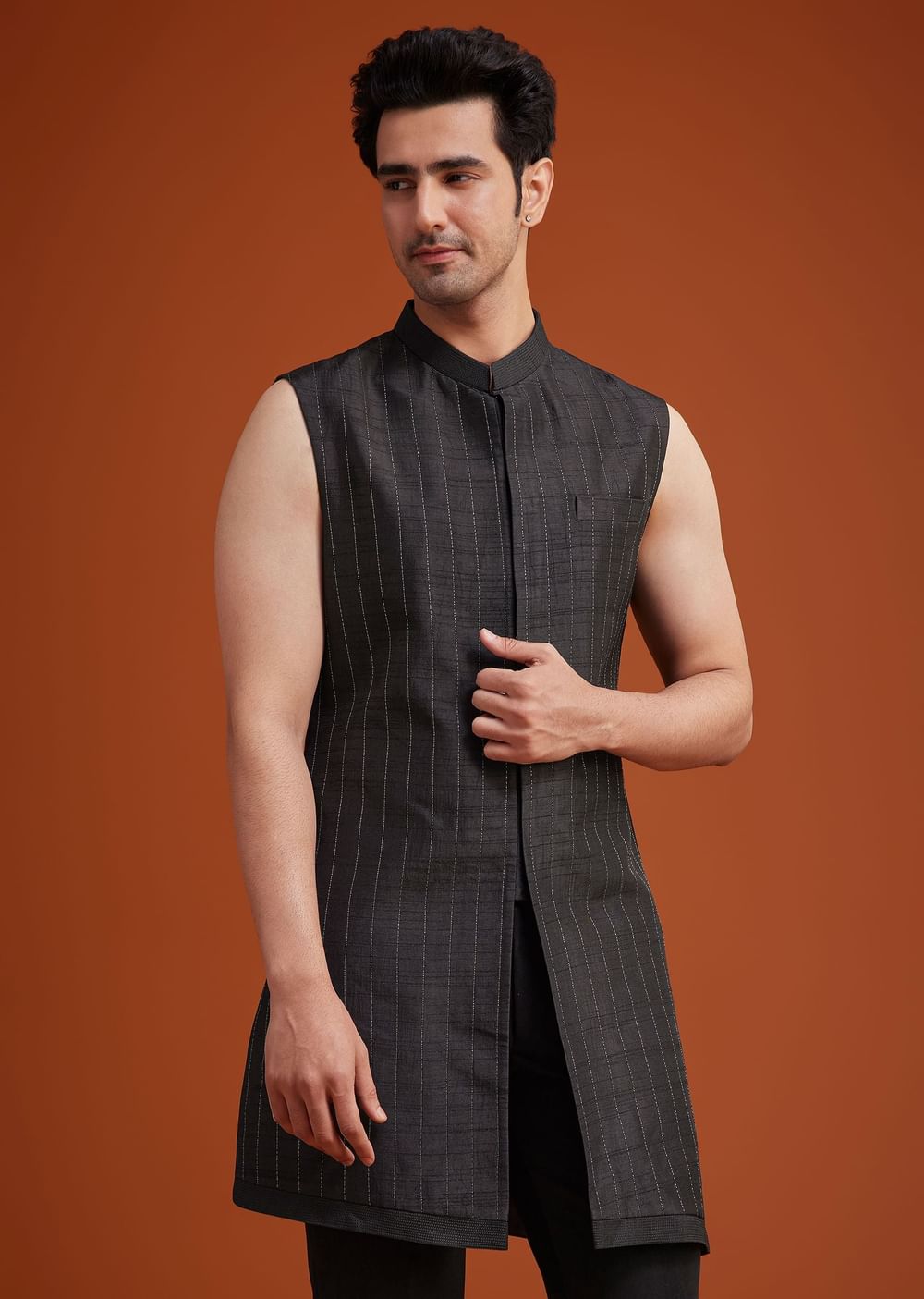- Layered over a long, asymmetrical kurta, the ensemble creates a dynamic fusion of elegance and contemporary styling.