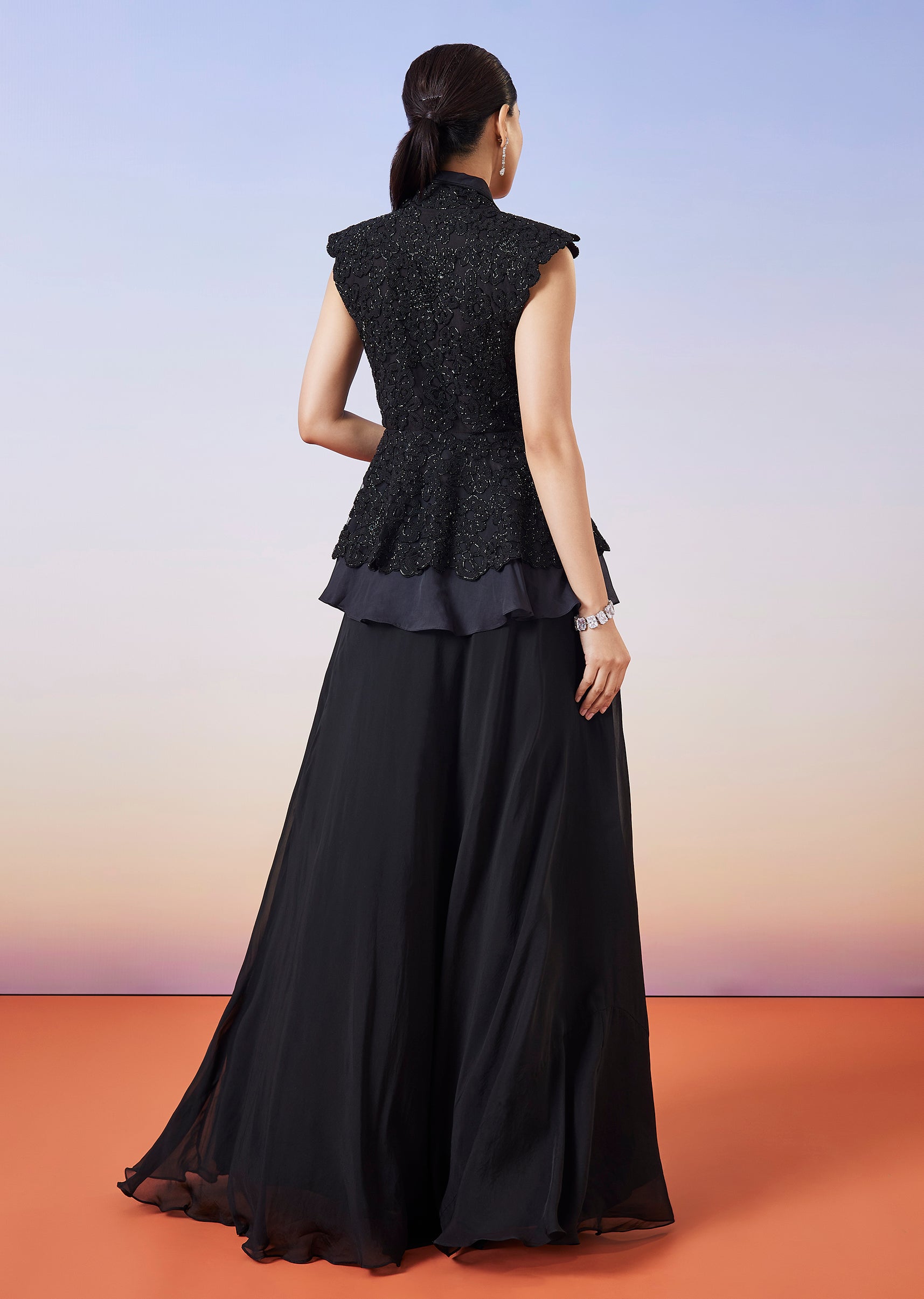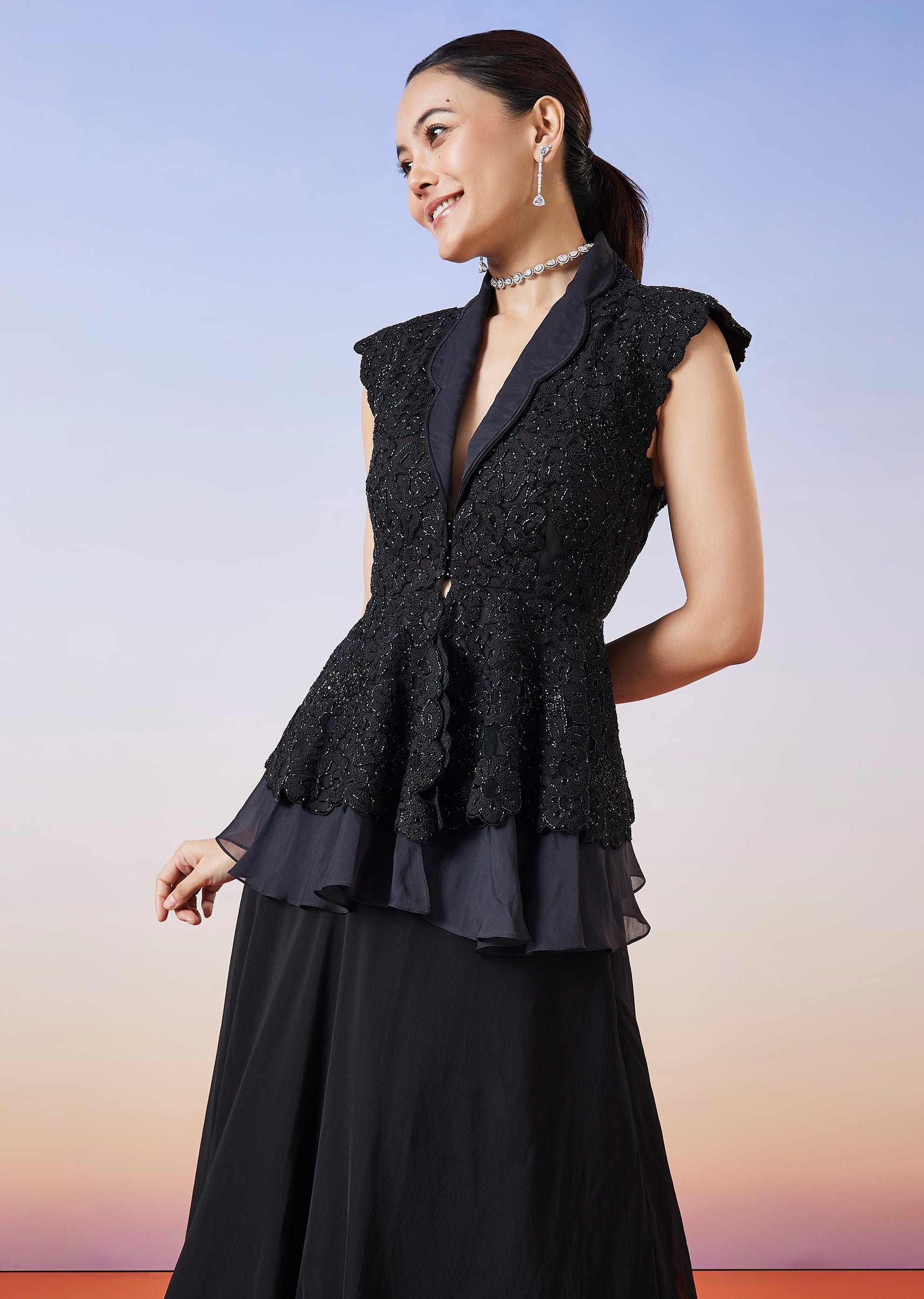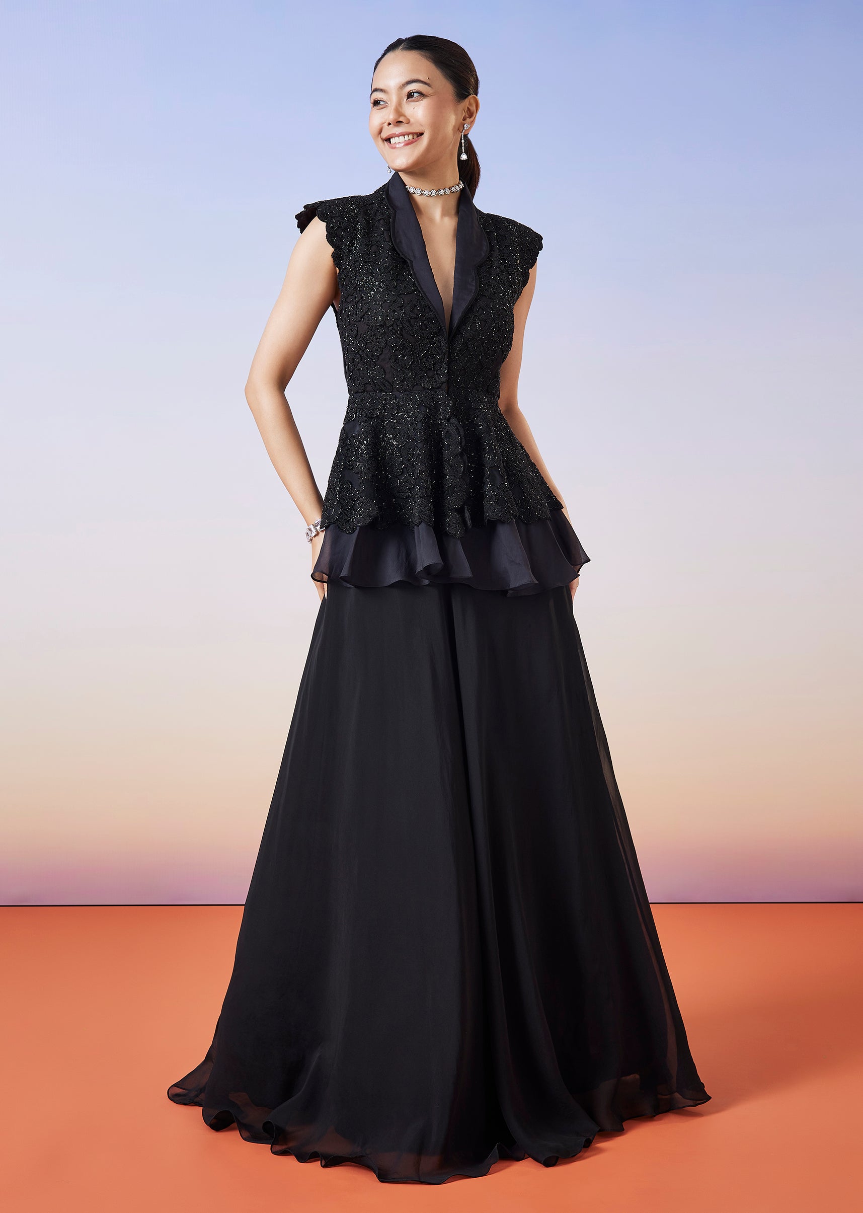 Black Organza Peplum Jacket Crop Skirt Lehenga