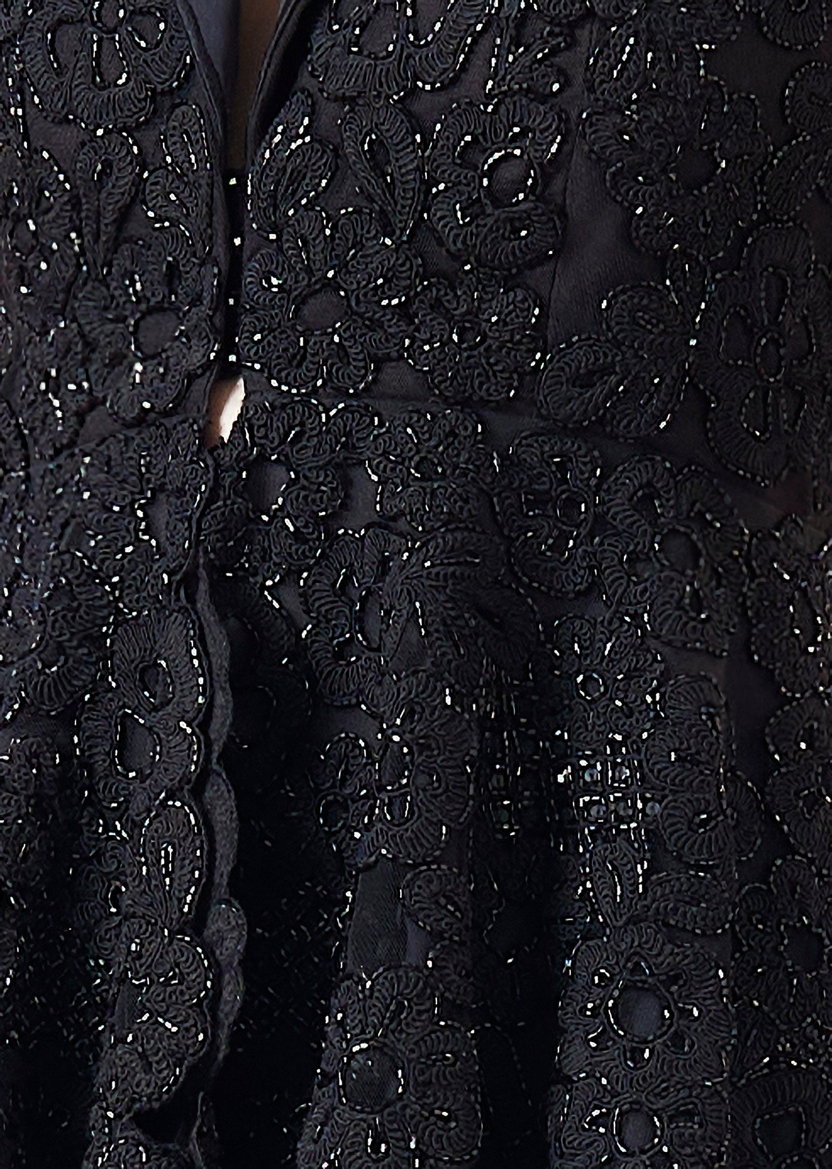 Crafted in organza with a net skirt, this black lehenga features a hand-crafted cut dana and sequins peplum jacket with a sharp shirt collar and front hook-eye closure — a bold, fashion-forward silhouette. The A-line flared skirt creates a structured, striking look that commands attention at reception occasions. Awarded as the Most Trusted Brand, we're delivering styles you love, just as promised.