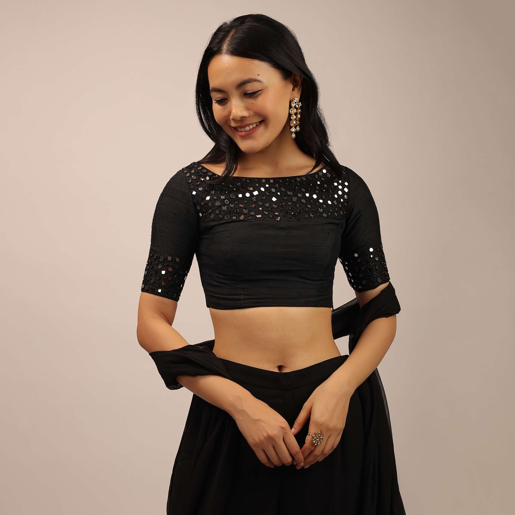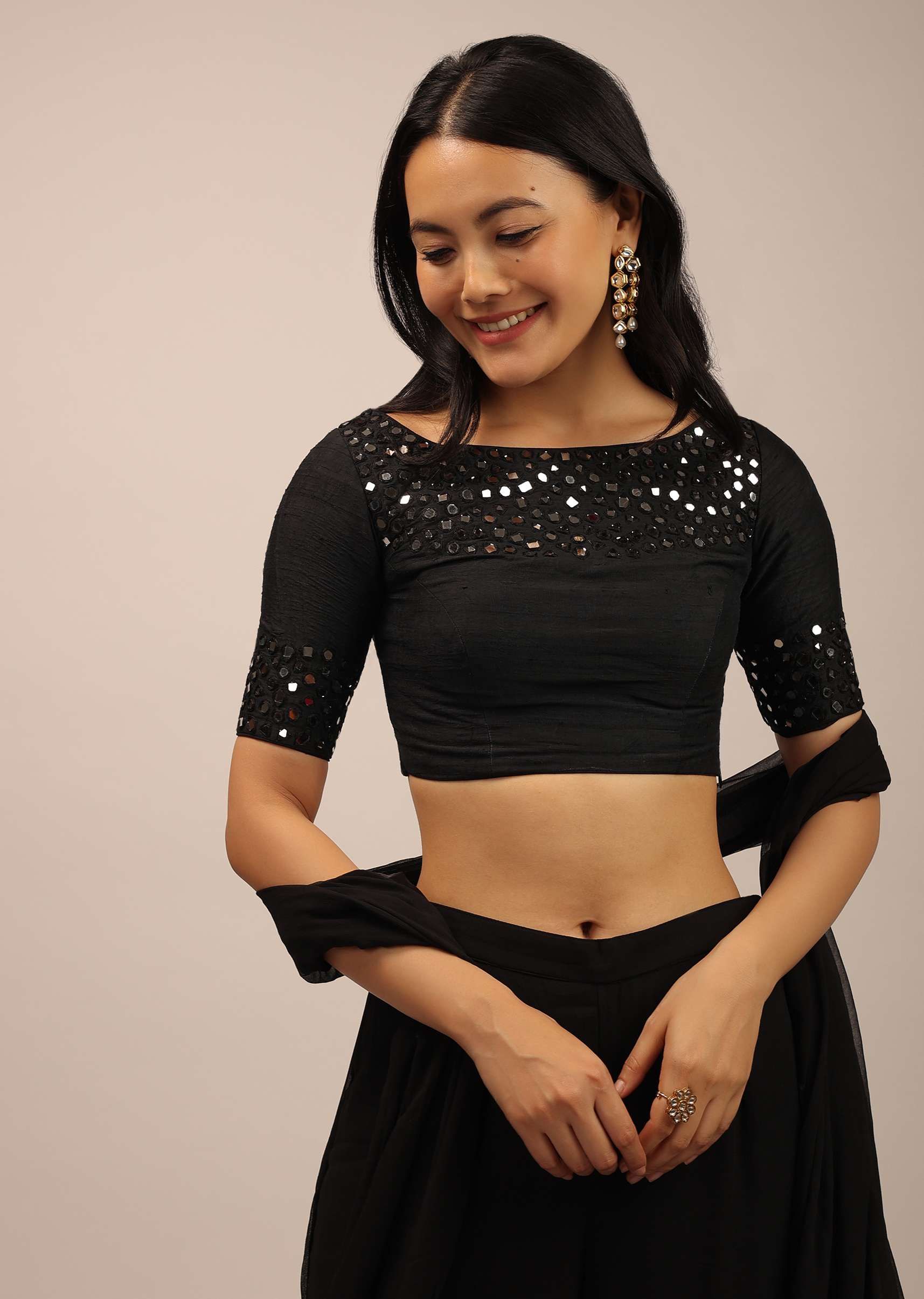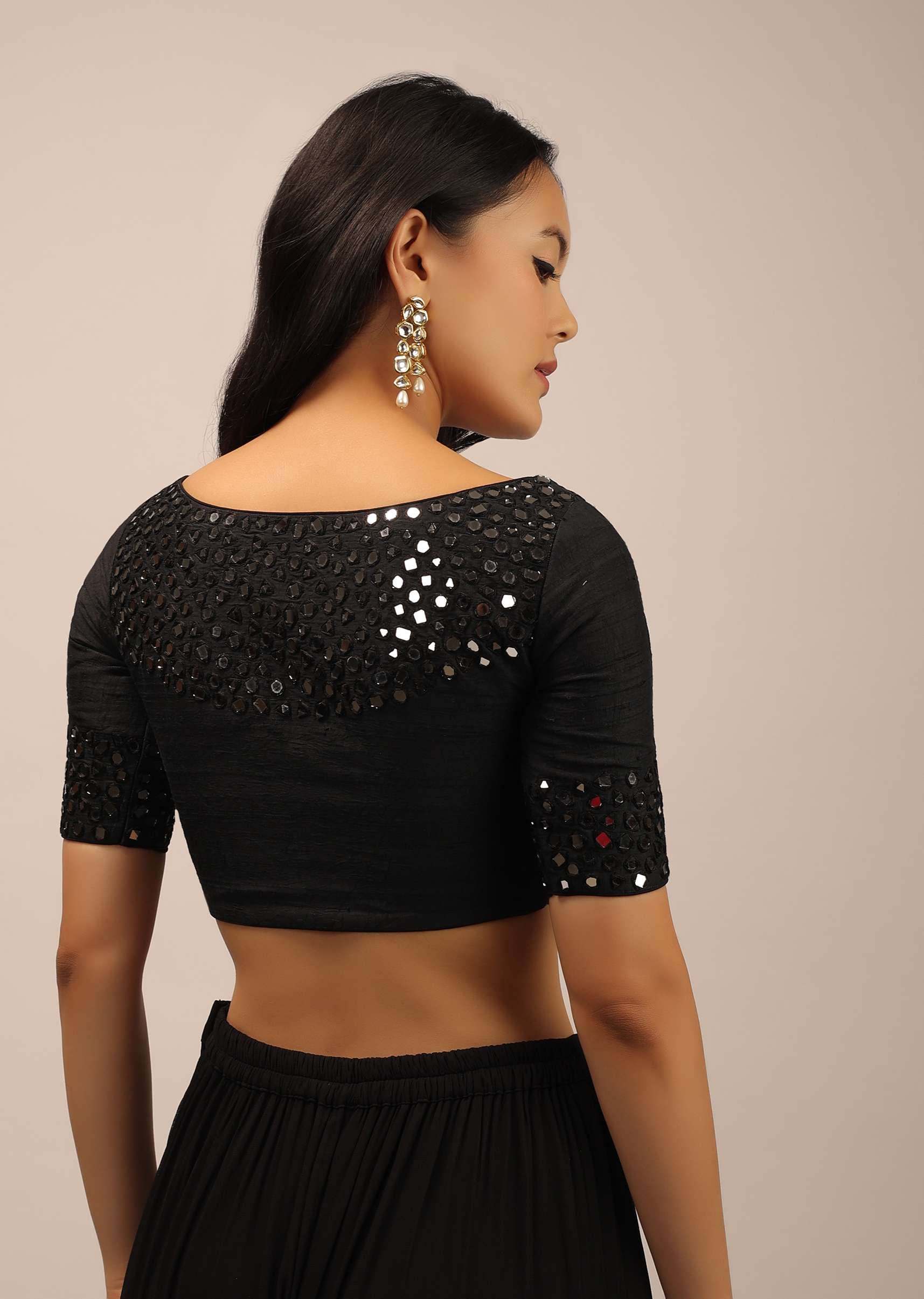 Black blouse with mirror work on the yoke and sleeves. The top is made with raw silk and has a side zip closure and padding. It is designed with half sleeves and a closed back with embroidery detailing. Awarded As The Most Trusted Brand We'Re Delivering Styles You Love Just As Promised.