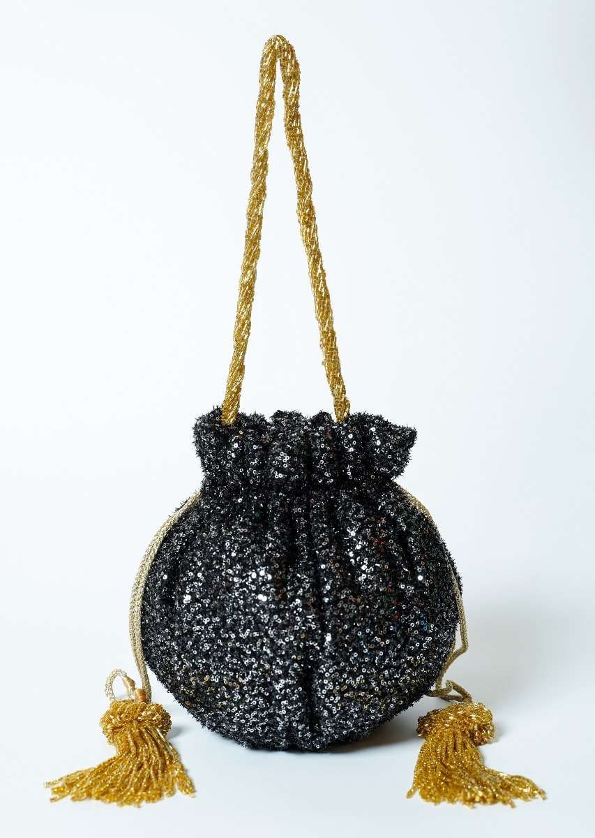Black potli bag in sequins fabric with cut dana handle. It comes with cut dana tassels to cinch the top. Awarded As The Most Trusted Brand We'Re Delivering Styles You Love Just As Promised.