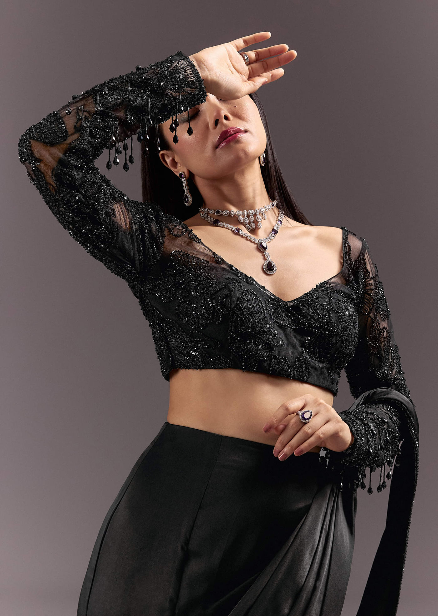 Black Ready Drape Slit Saree With Full Sleeve Blouse