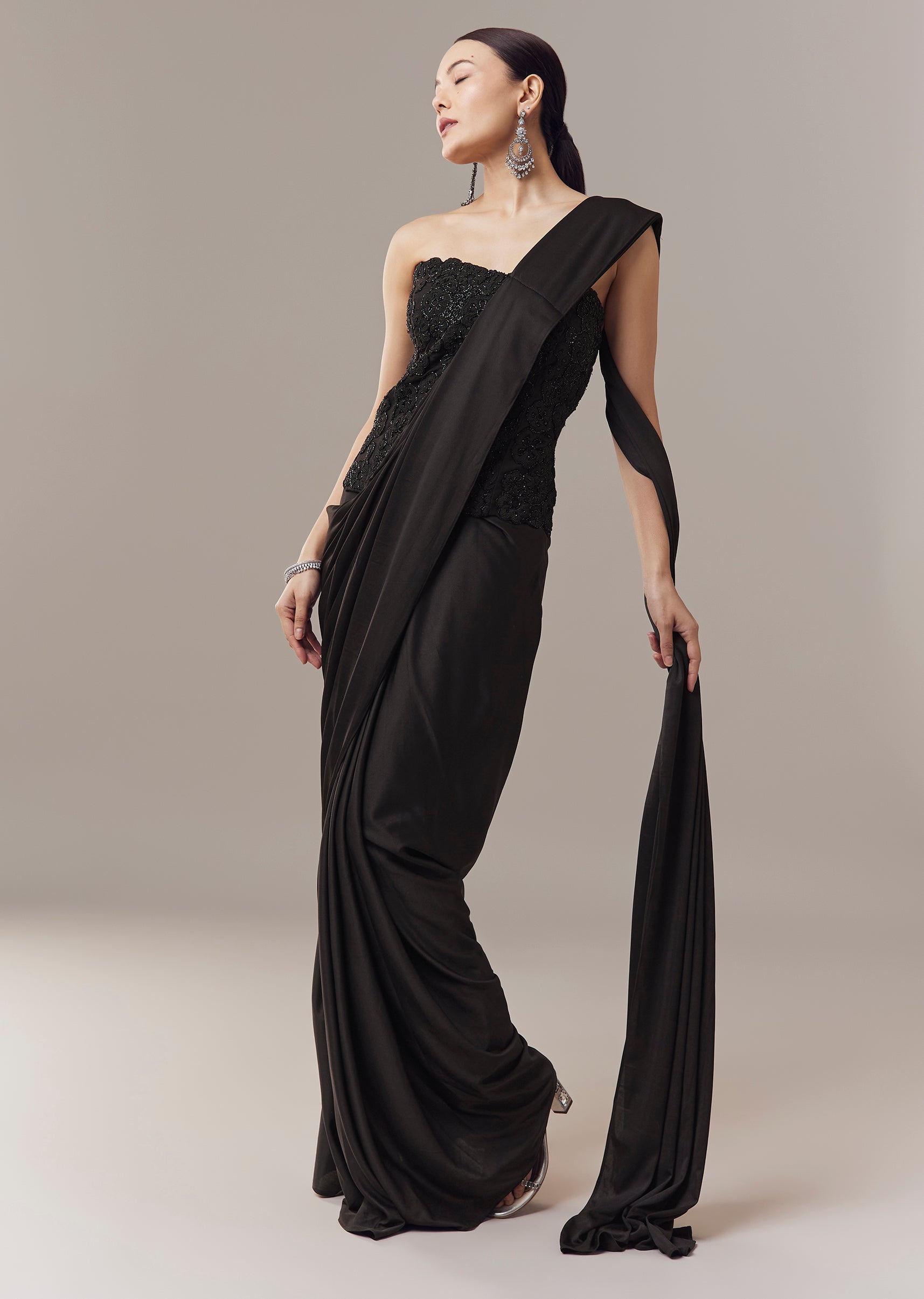 Chic and festive, this black ready pleated saree is crafted in soft lycra fabric for a comfortable and elegant fit. The corset blouse features intricate thread and cut dana embroidery... More Product Details