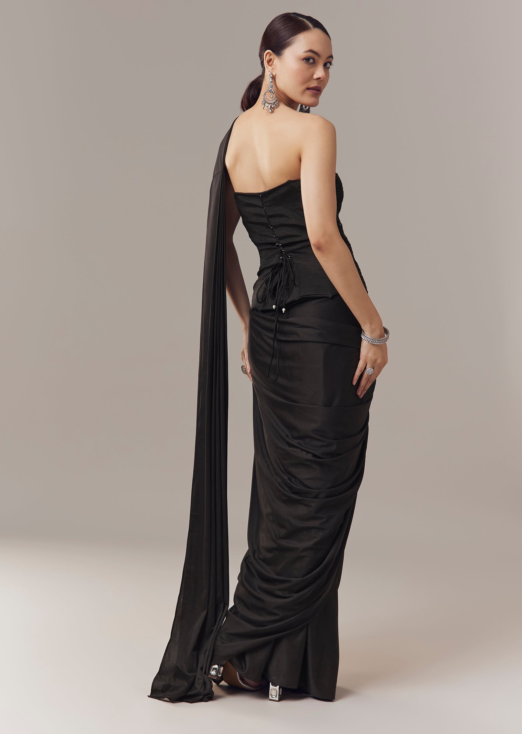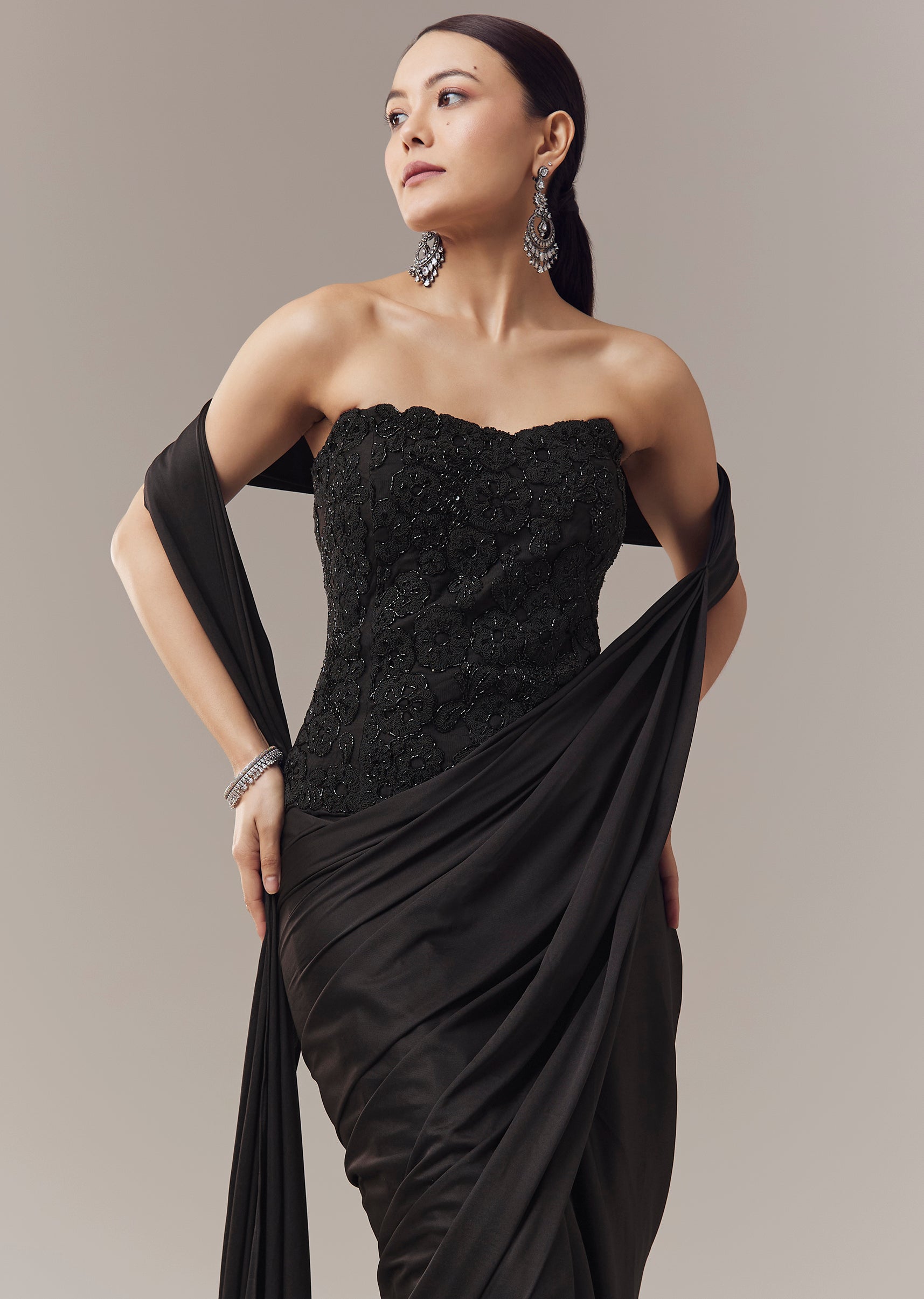 Black Ready Pleated Corset Saree With Thread And Cut Dana Work