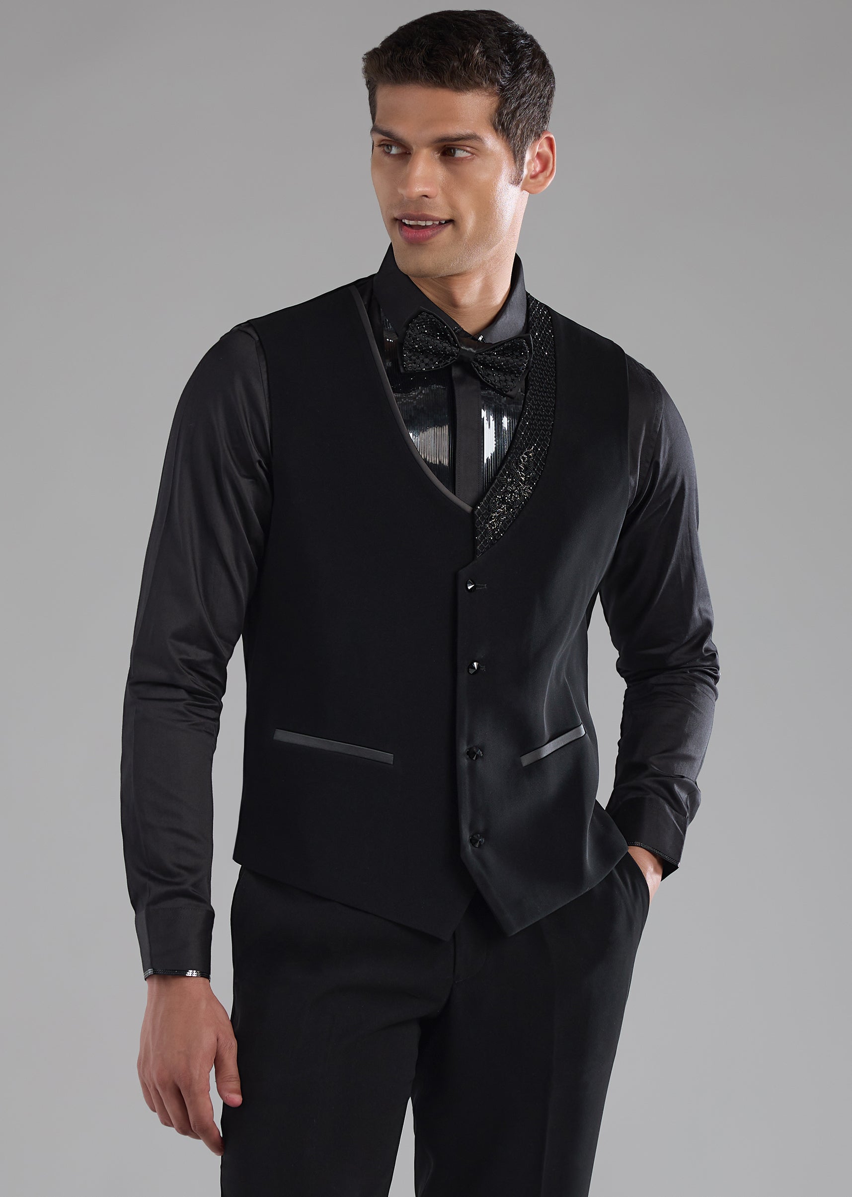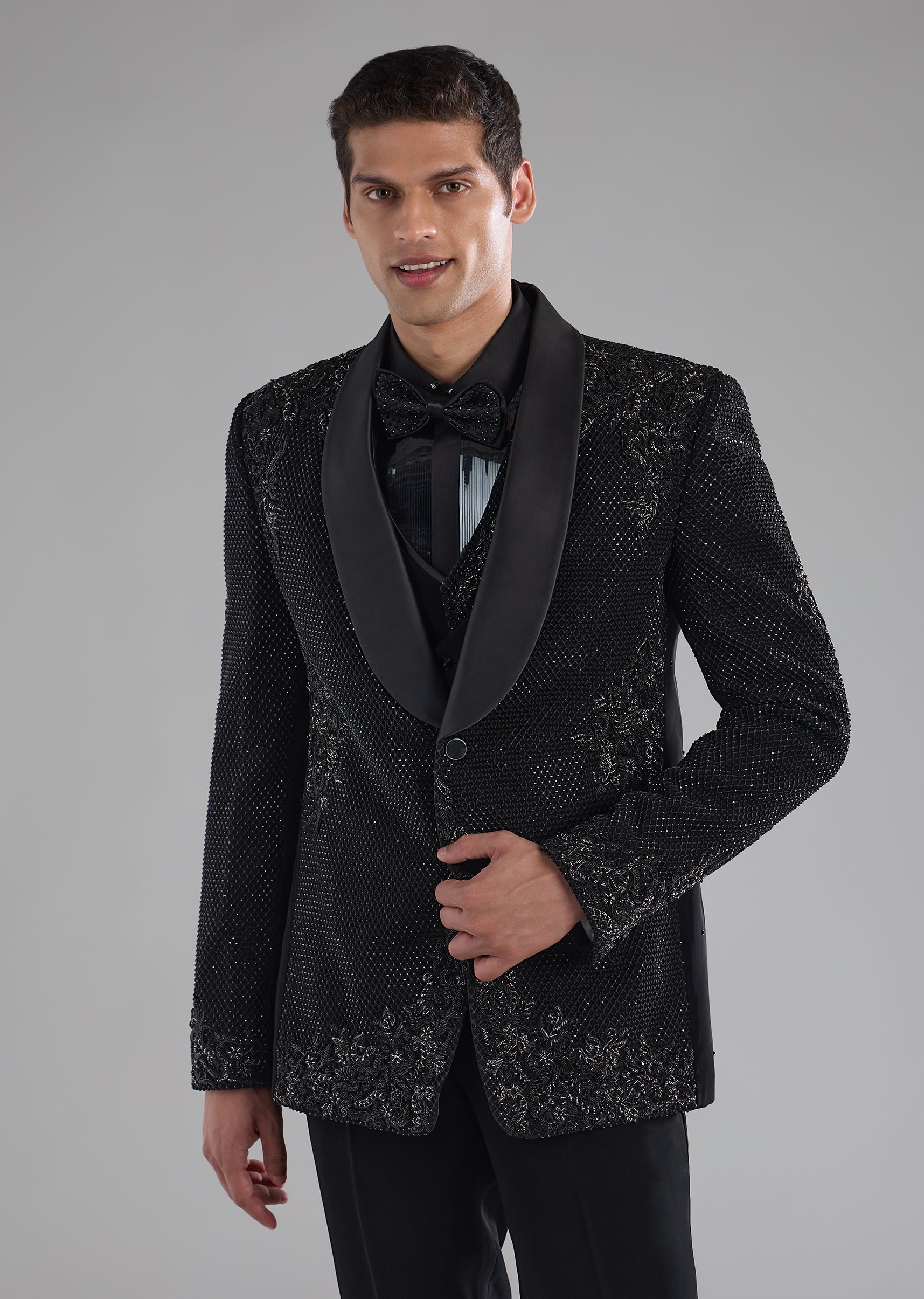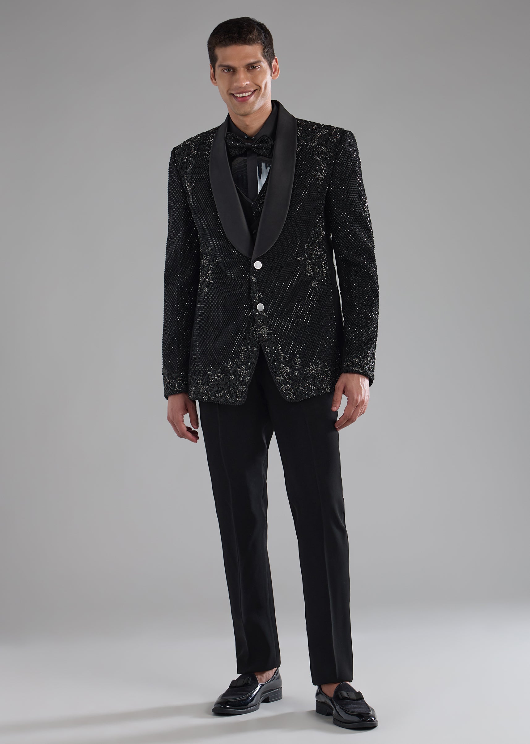 Designed to make a refined statement, this polyester tuxedo set brings together elegance and festive detailing. The tuxedo is embellished with intricate thread and resham embroidery, highlighted with bead and... More Product Details
