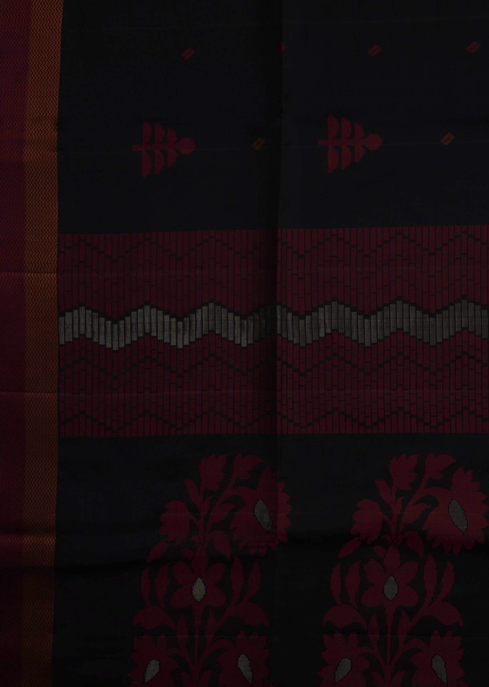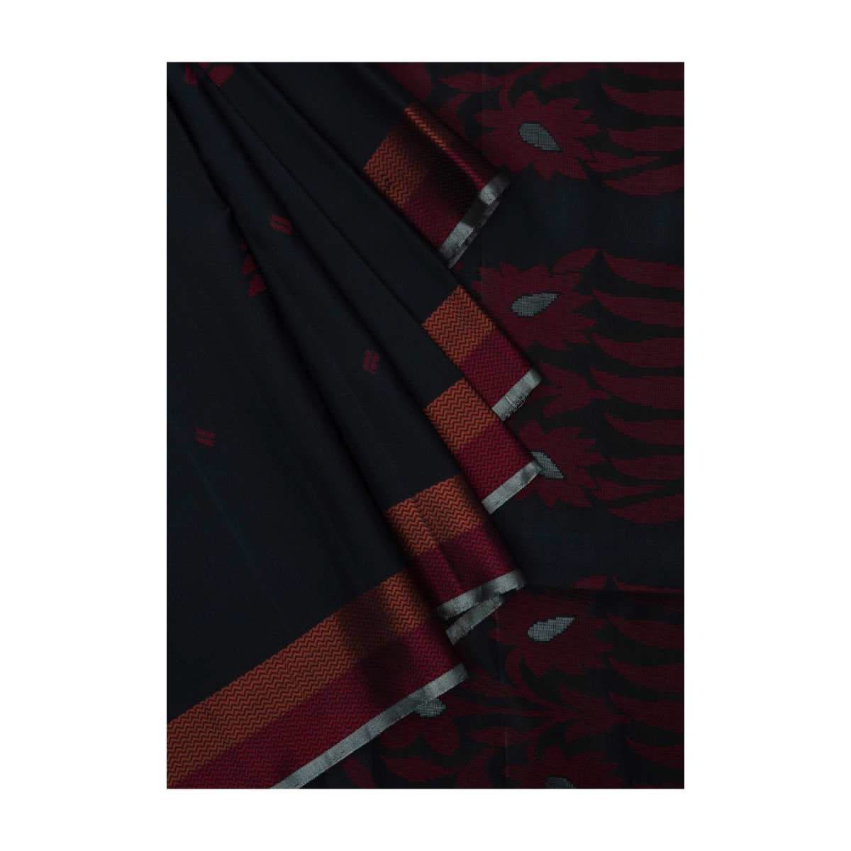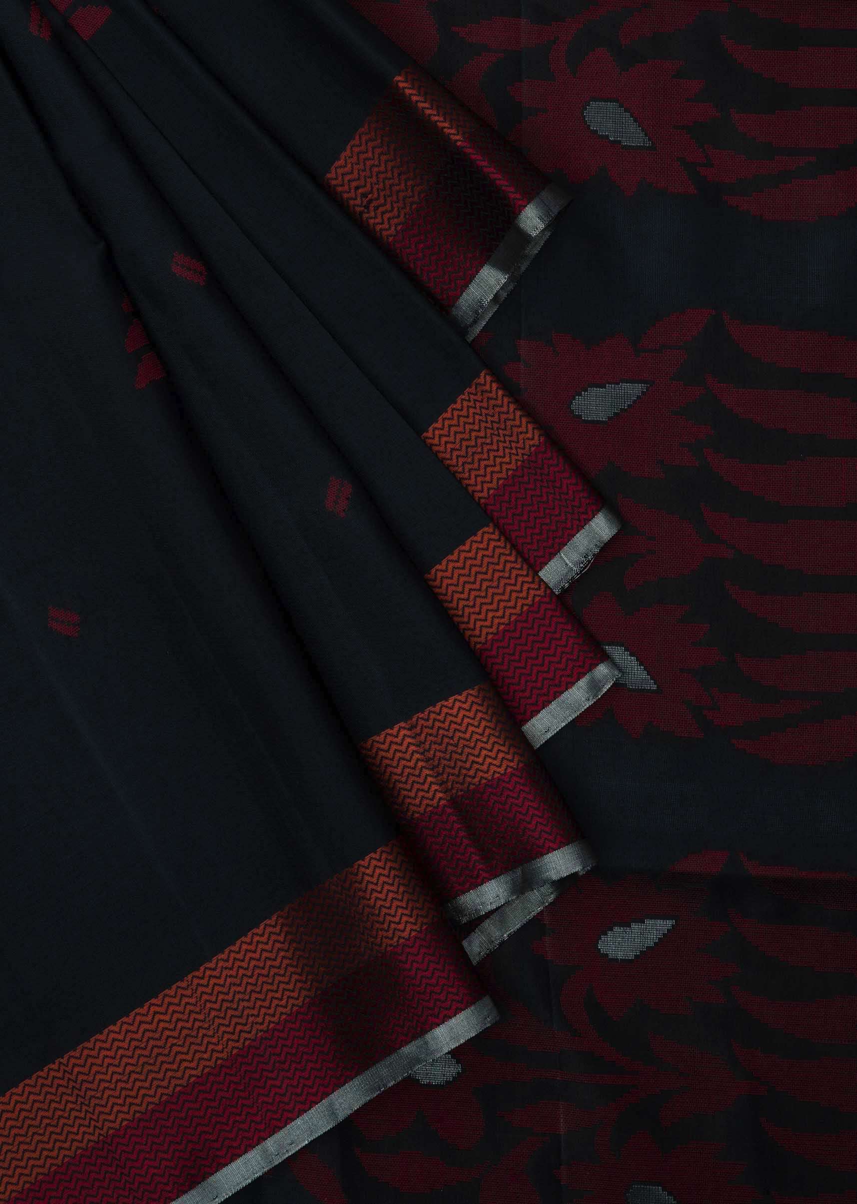 Black saree is featured in silk fabric. The saree is intricately designed using the floral red weaved butti embroidery all over with orange and red borders. It is enhanced in a beautiful pallav. Set together with an unstitched blouse. Awarded As The Most Trusted Brand We'Re Delivering Styles You Love Just As Promised.