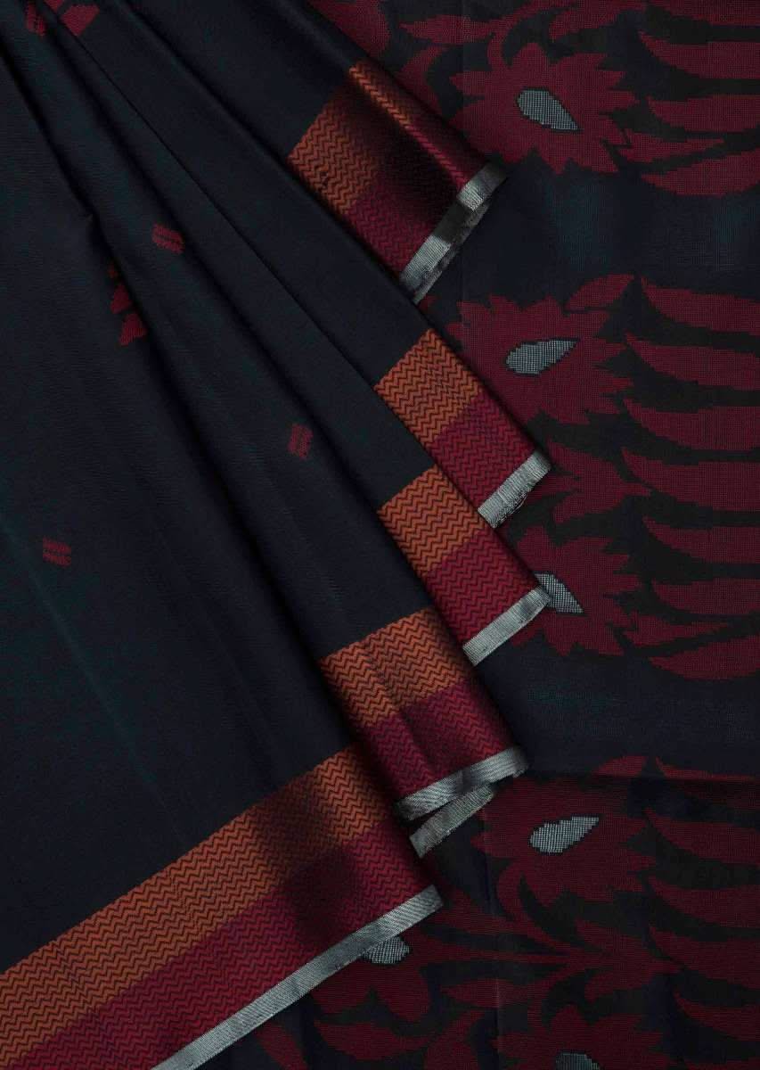 Black saree in silk beautified in weaved embroidery only on Kalki