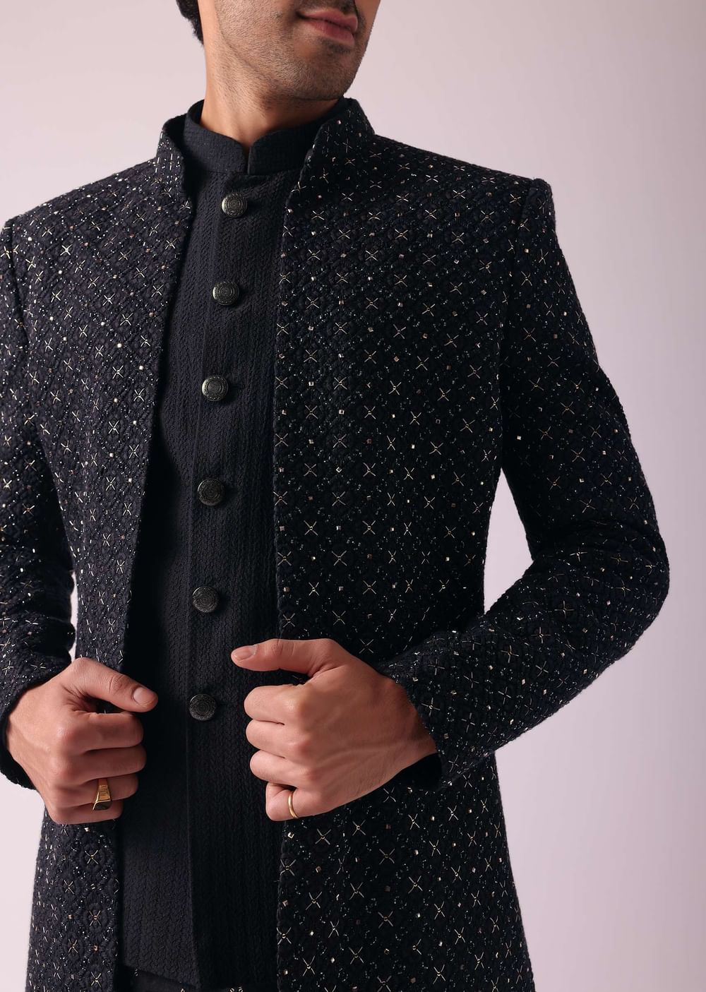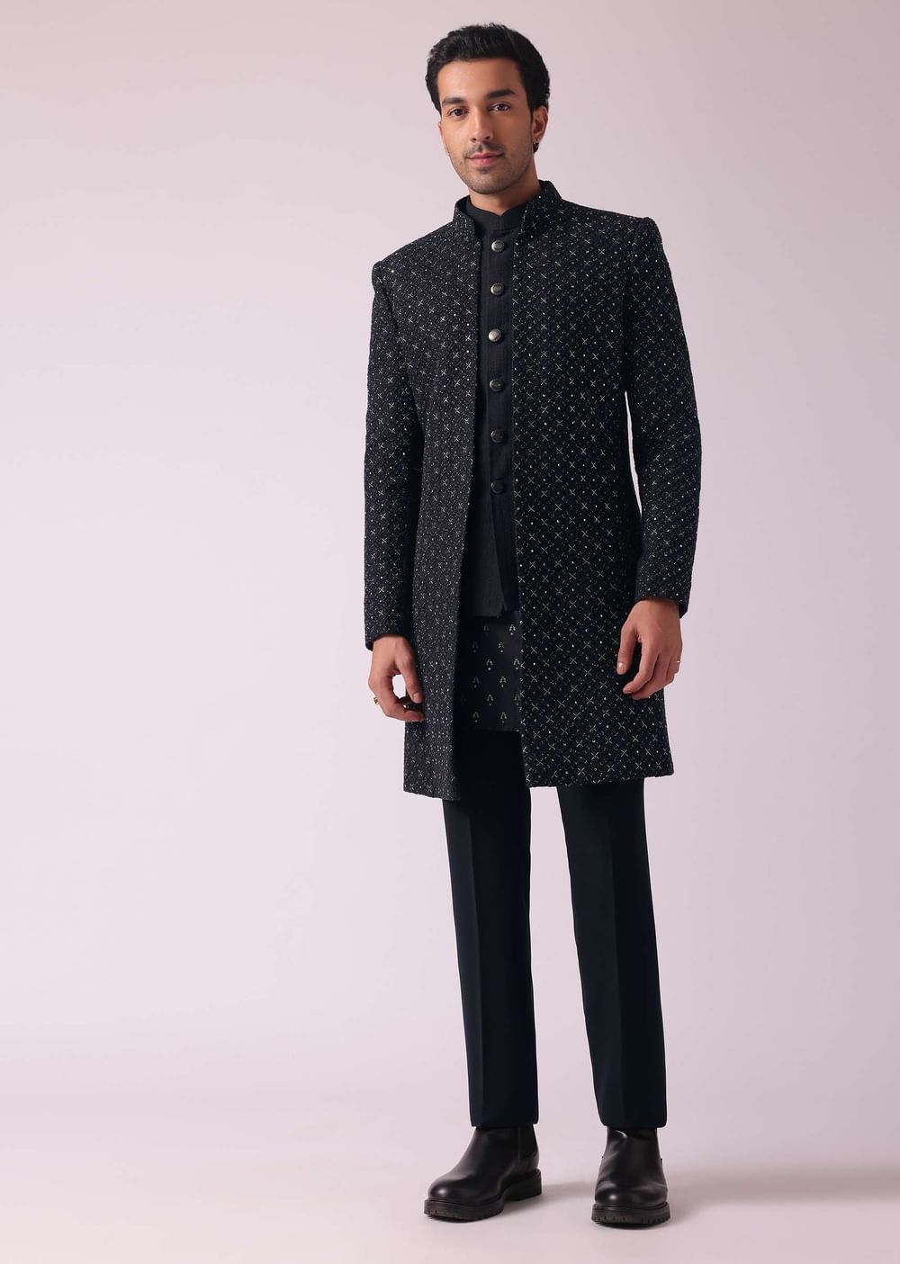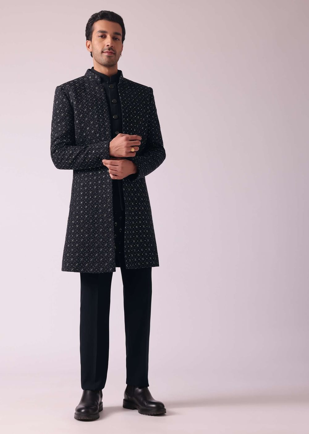 Dazzle in our black shimmery indowestern suit a testament to modern sophistication. The jacket features intricate cut work adding a touch of artistry to your ensemble. EVENT - This set includes a coordinating kurta and matching trousers making it the ultimate choice for receptions and cocktail events.Change folds regularly. Awarded as the Most Trusted Brand, we're delivering styles you love, just as promised.