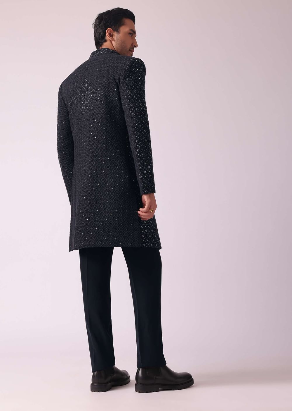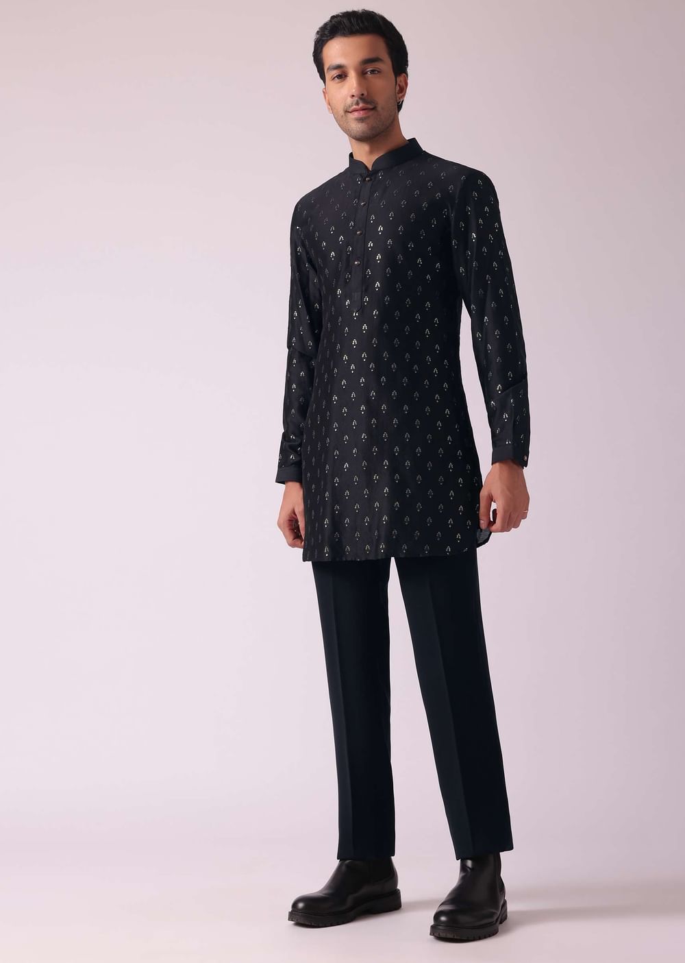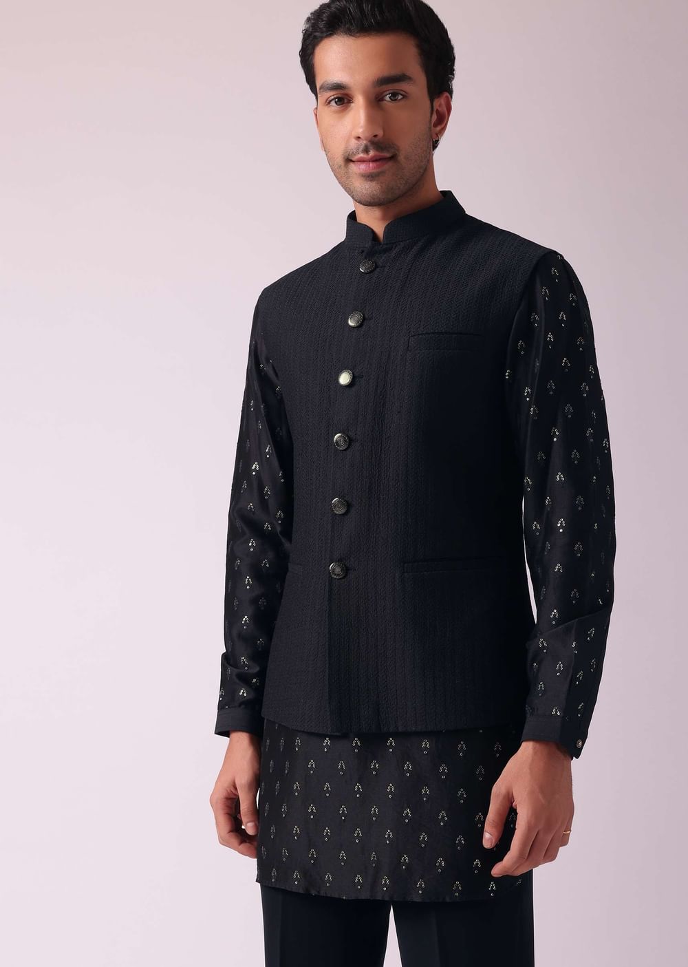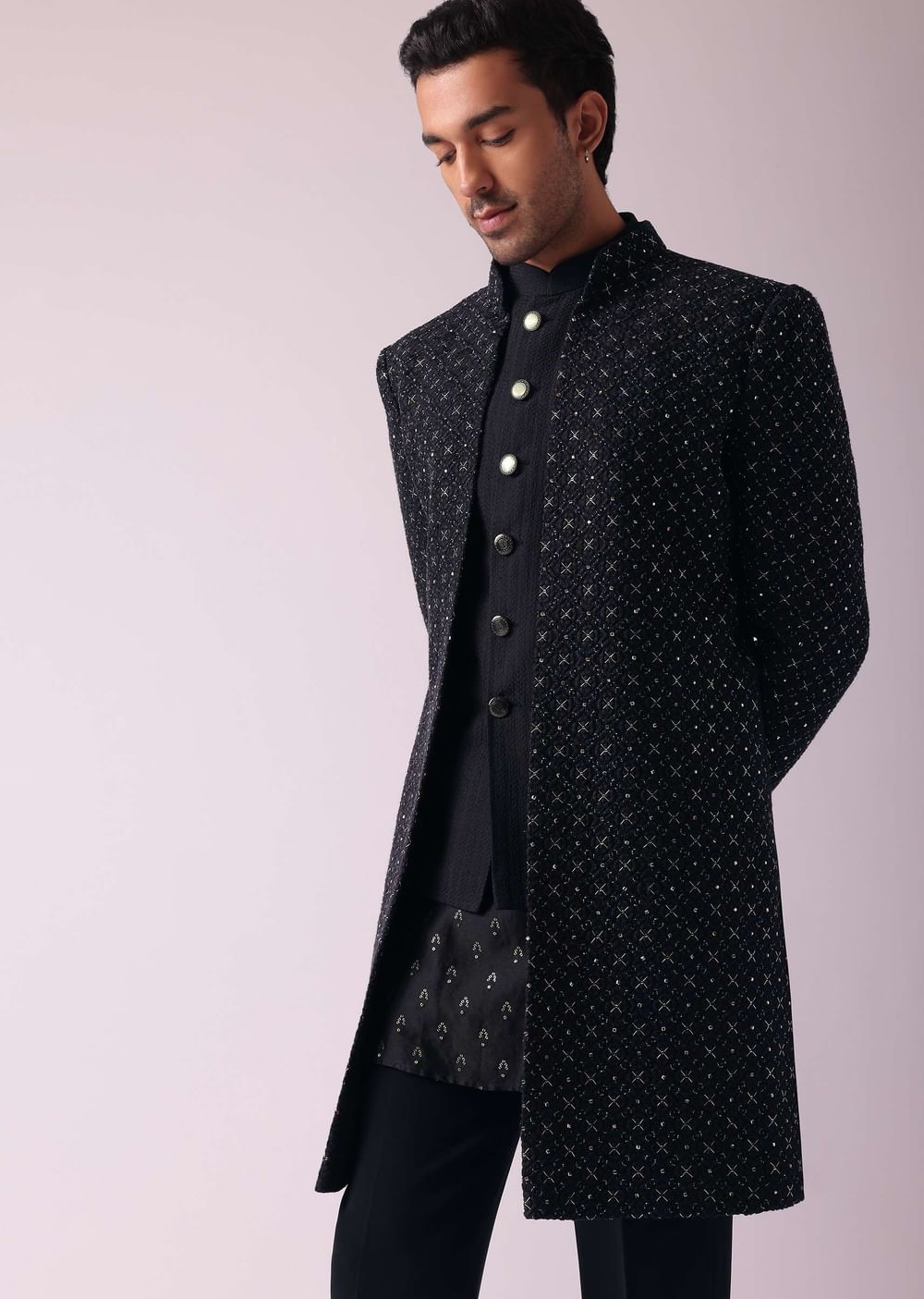 Dazzle in our black shimmery indowestern suit a testament to modern sophistication. The jacket features intricate cut work adding a touch of artistry to your ensemble. EVENT - This set includes a coordinating kurta and matching trousers making it the ultimate choice for receptions and cocktail events.Change folds regularly. Awarded as the Most Trusted Brand, we're delivering styles you love, just as promised.