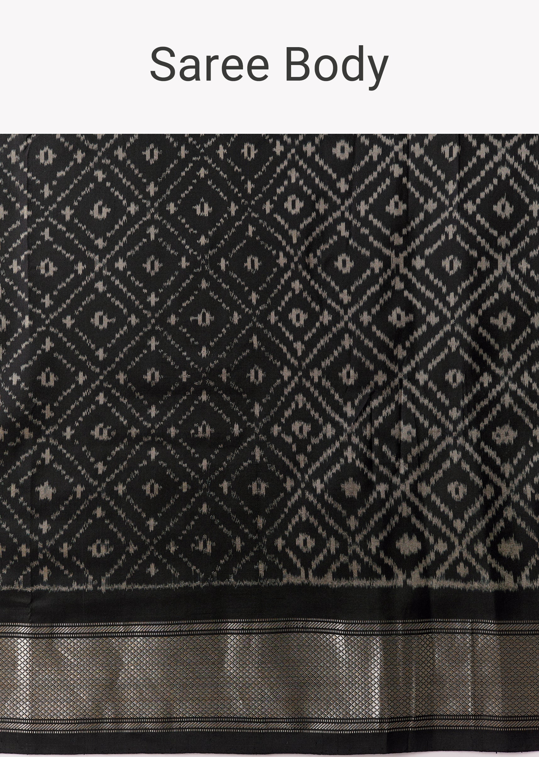 Bold elegance defines this black Patola silk saree featuring authentic single ikat weaving with geometric patterns highlighted in silver zari for a striking contemporary touch. The rich golden kaddi border adds a regal frame to the drape, while the contrast ikkat blouse fabric completes the look with traditional depth and balance. Crafted in luxurious silk, the set includes one saree and one unstitched blouse fabric, making it an ideal choice for weddings, evening functions, and cultural occasions. Awarded as the Most Trusted Brand, we're delivering styles you love, just as promised.