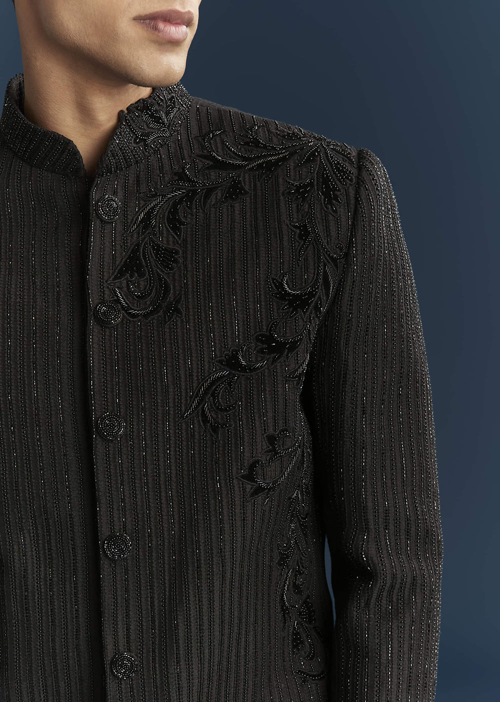 Sleek and evening perfect, this black art silk men's indo western set features fine vertical pinstripes of moti and velvet patch work with intricate zardosi embroidery. The look is best... More Product Details