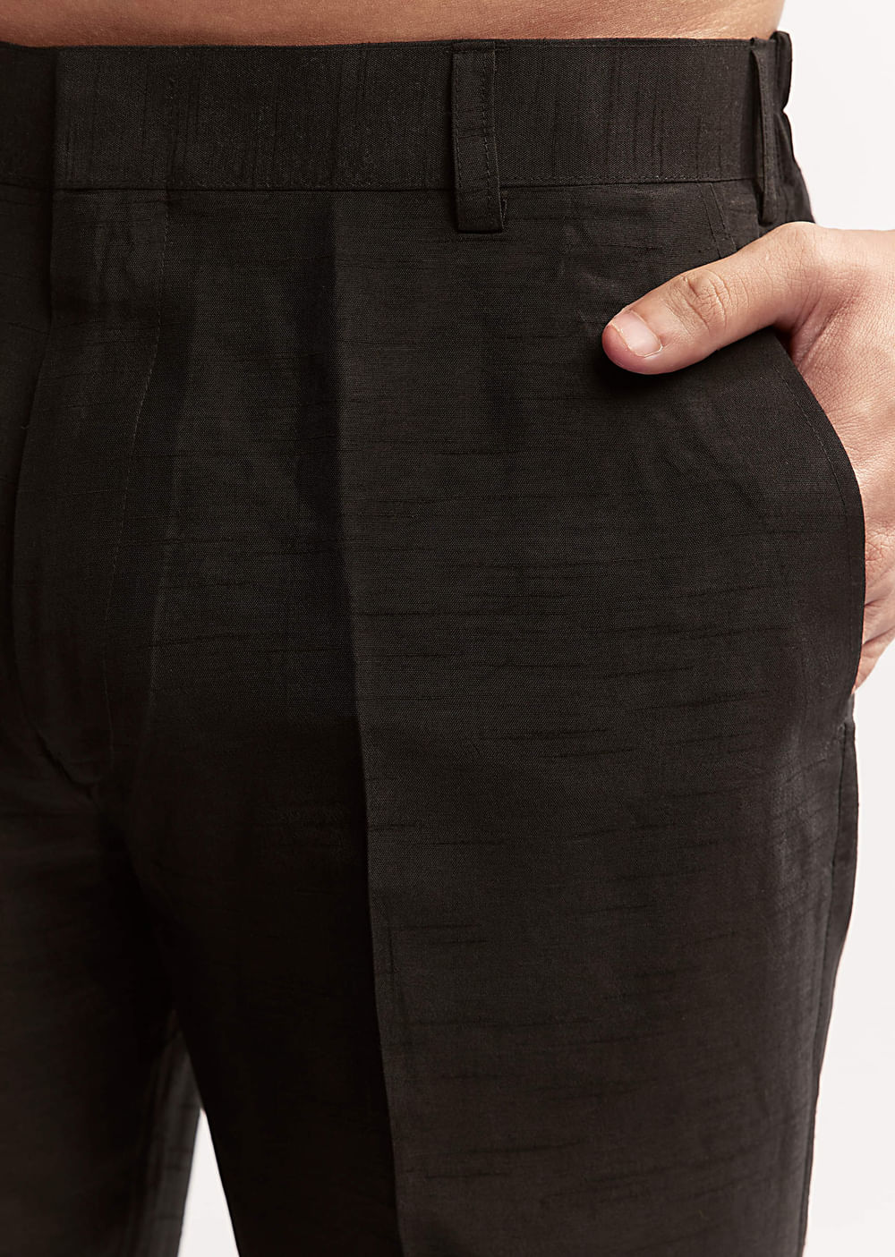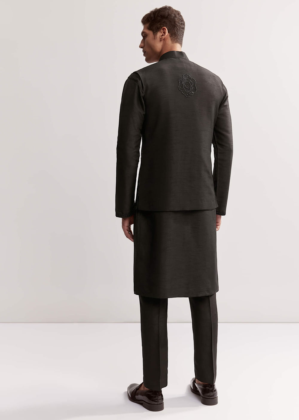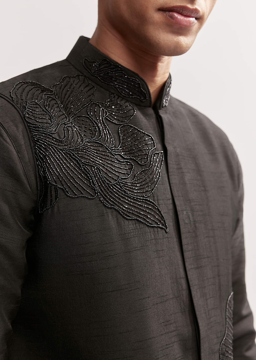 Black Silk Kurta Jacket Set For Men With Floral Cutdana Work