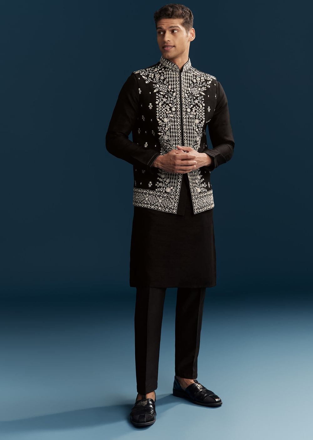 Add black mojaris, a pocket square, and a statement ring to make the embroidery pop.