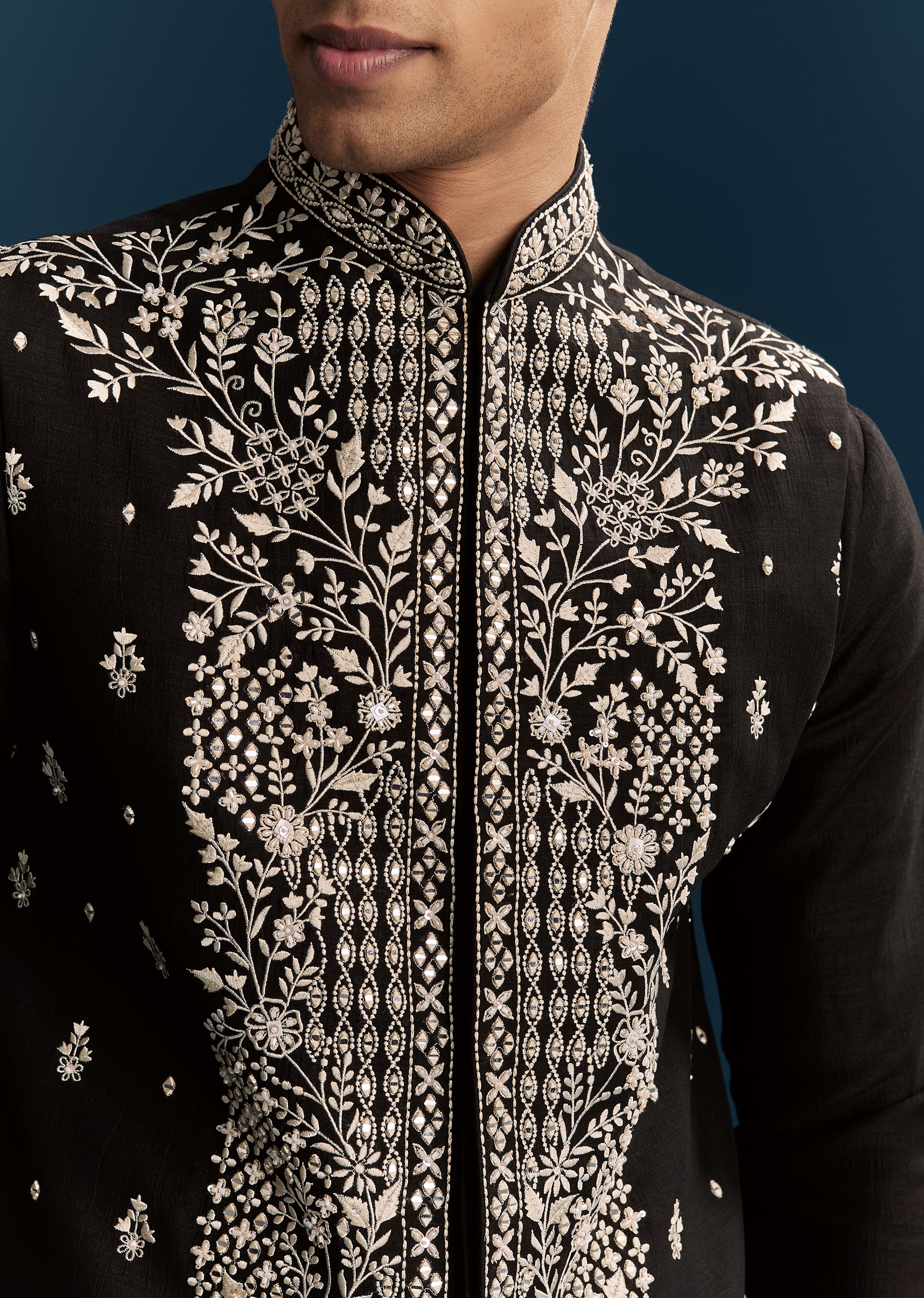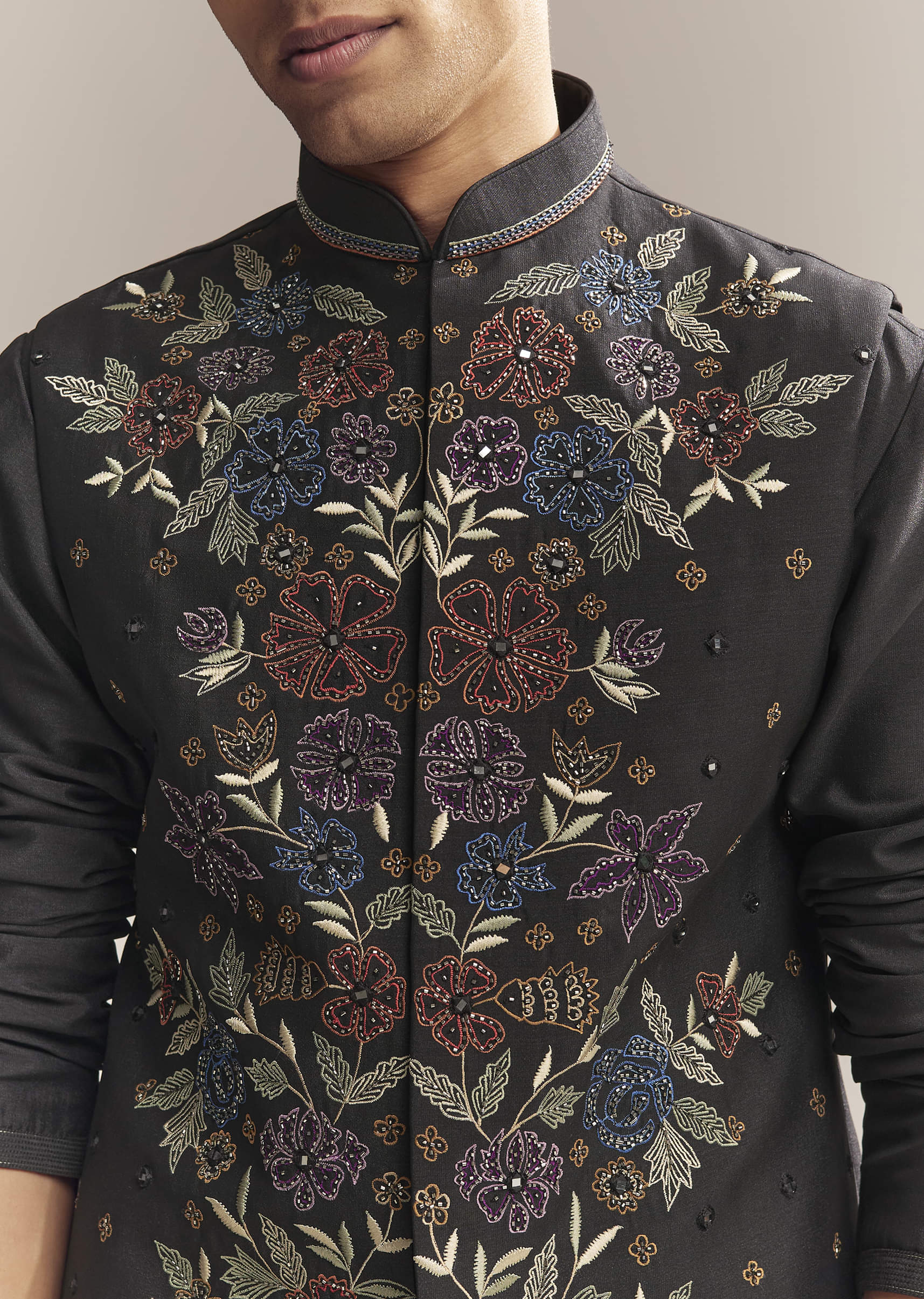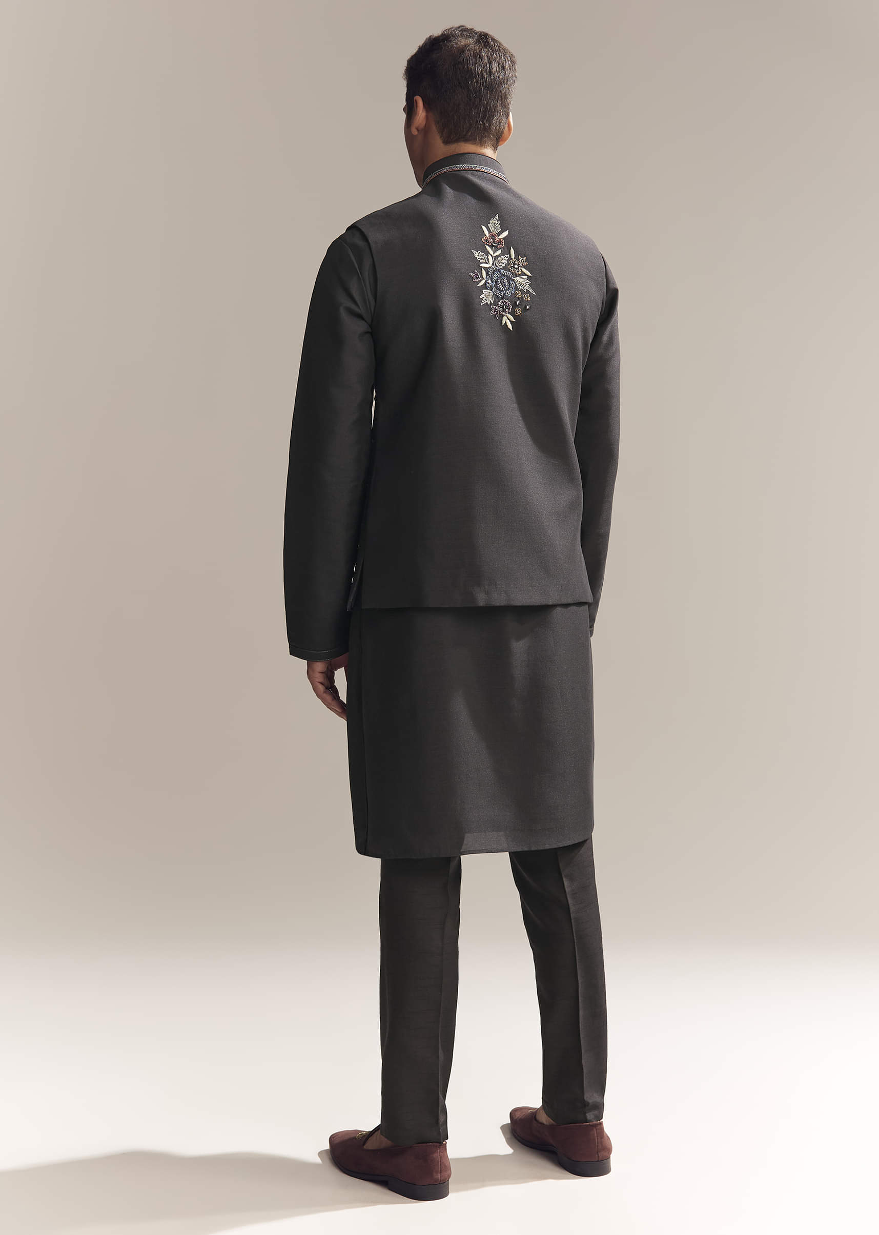 Black Silk Kurta Jacket Set For Men With Heavy Embroidery