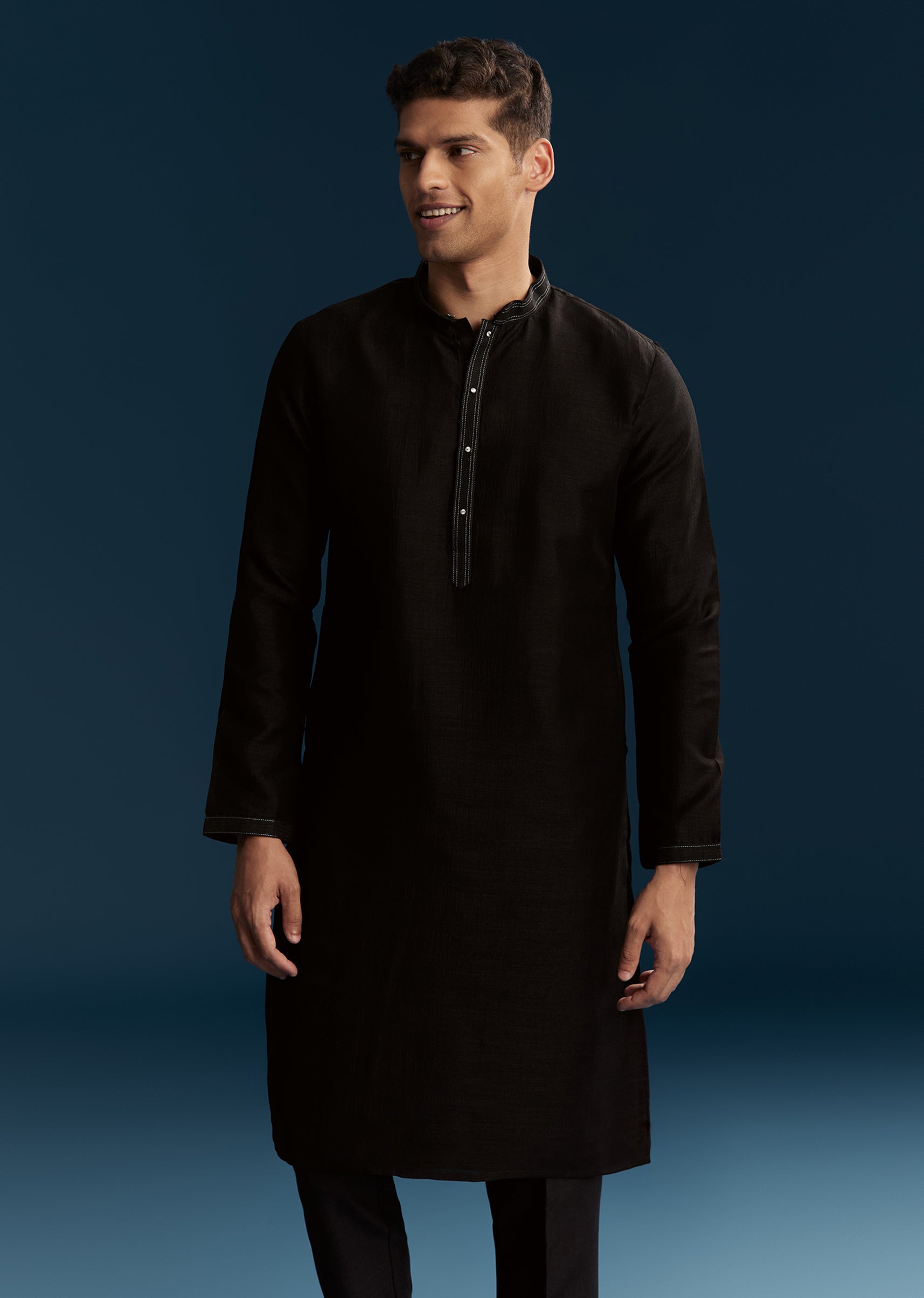 Celebrations get sharper with this black silk kurta jacket set for men featuring resham embroidery and cut work. The richness of the black contrasts perfectly with the handmade detail. It is a stylish option for modern wedding guests. Awarded as the Most Trusted Brand, we're delivering styles you love, just as promised.