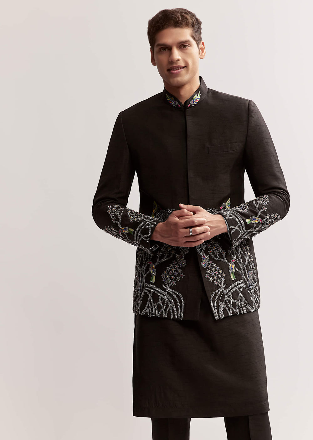Pair with a silk pocket square, polished loafers, and a classic wristwatch, and keep accessories minimal to let the zardosi shine.