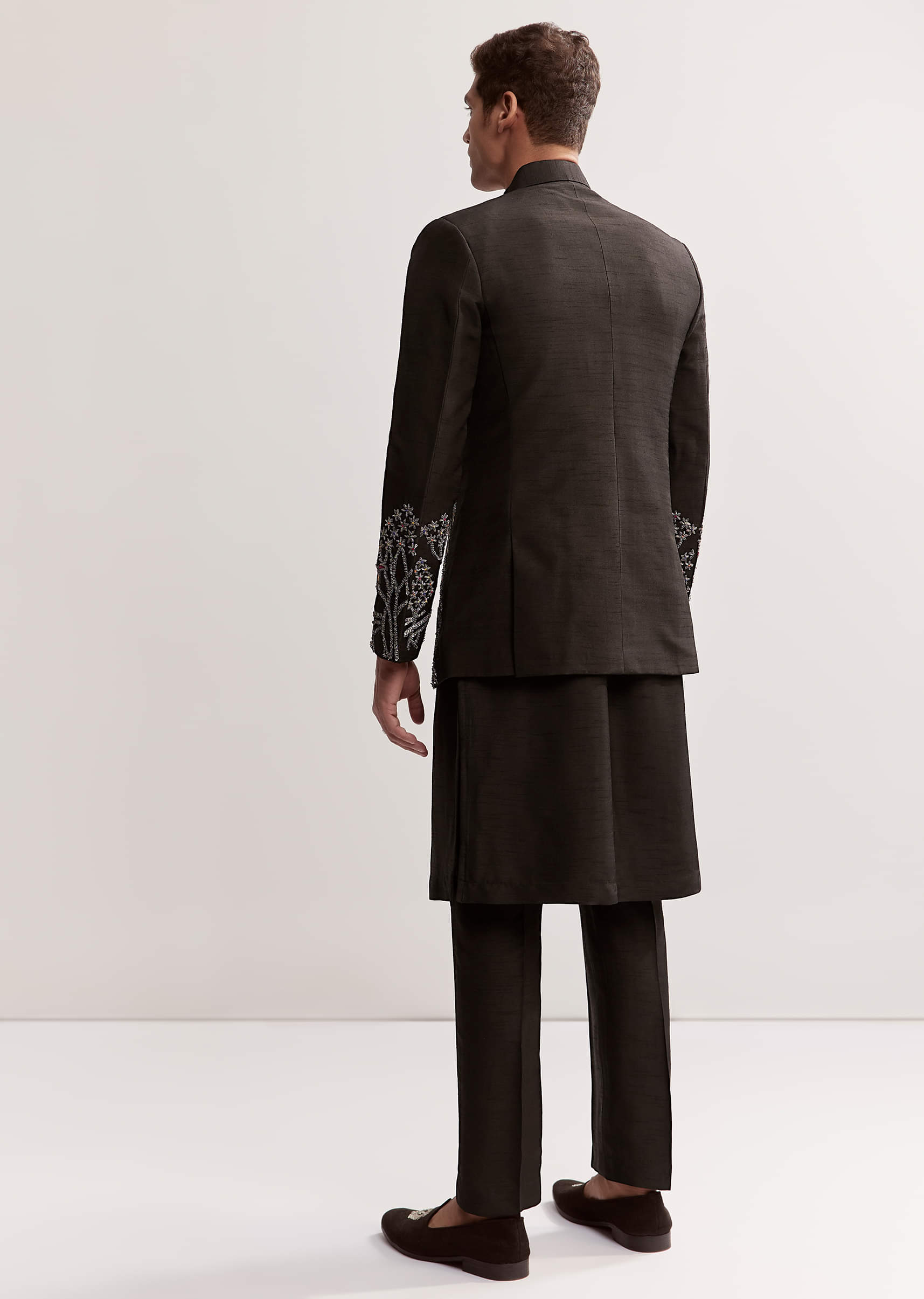 Black Silk Kurta Jacket Set For Men With Zardosi Embroidery