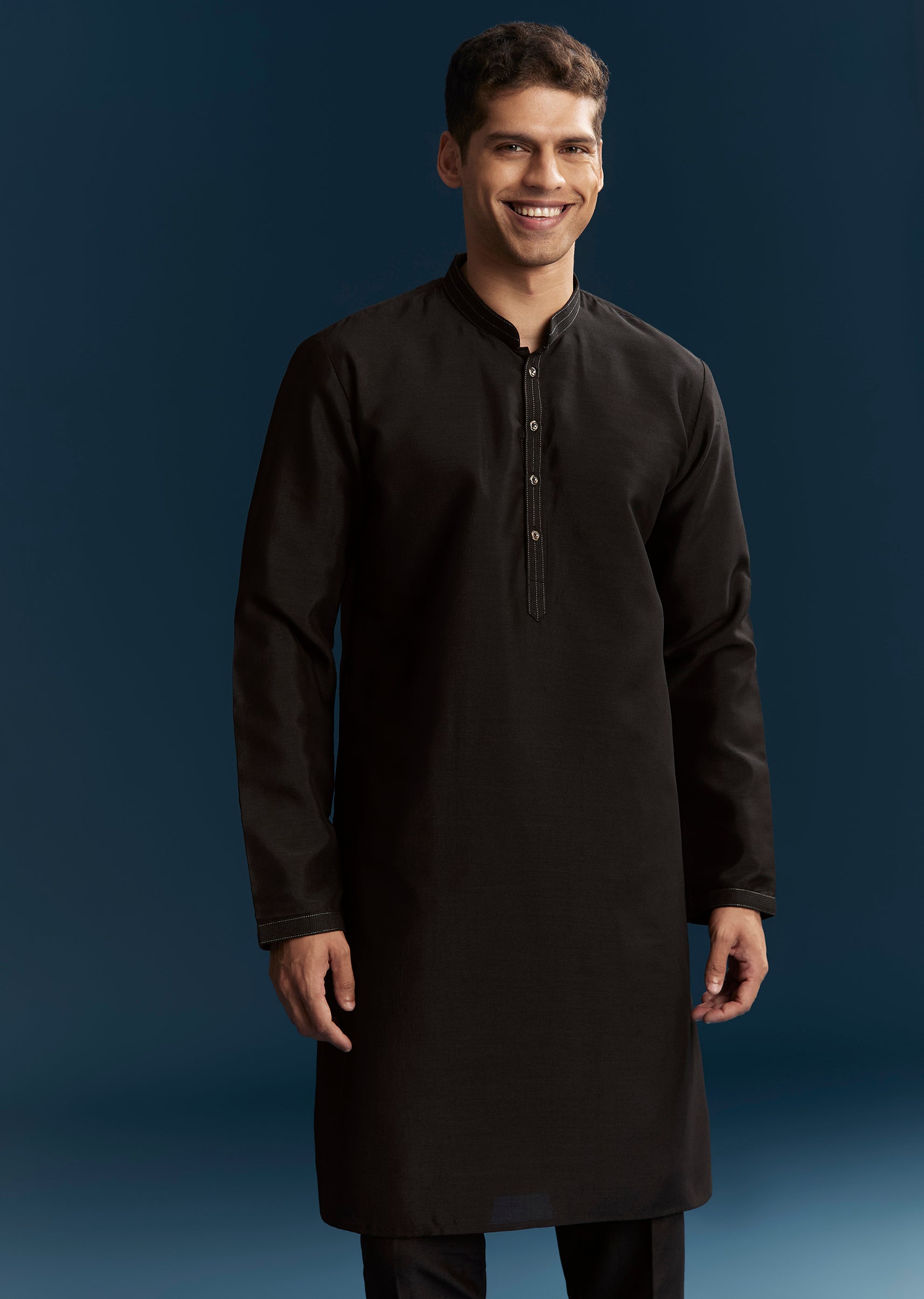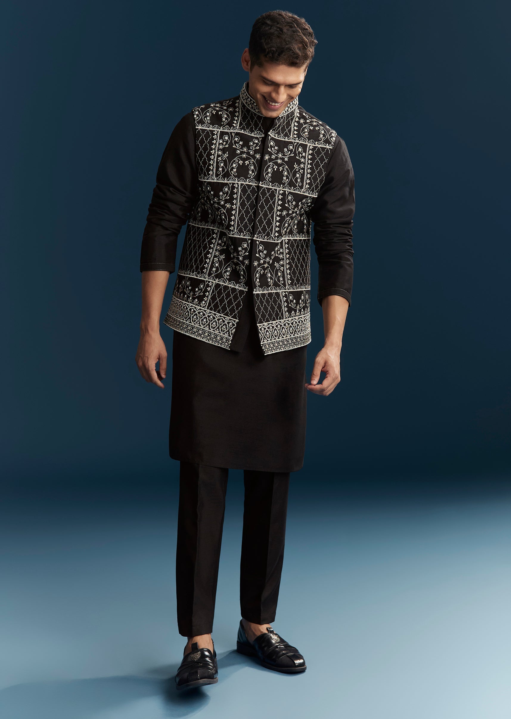 Black Silk Kurta Jacket Set With Thread Detail Work