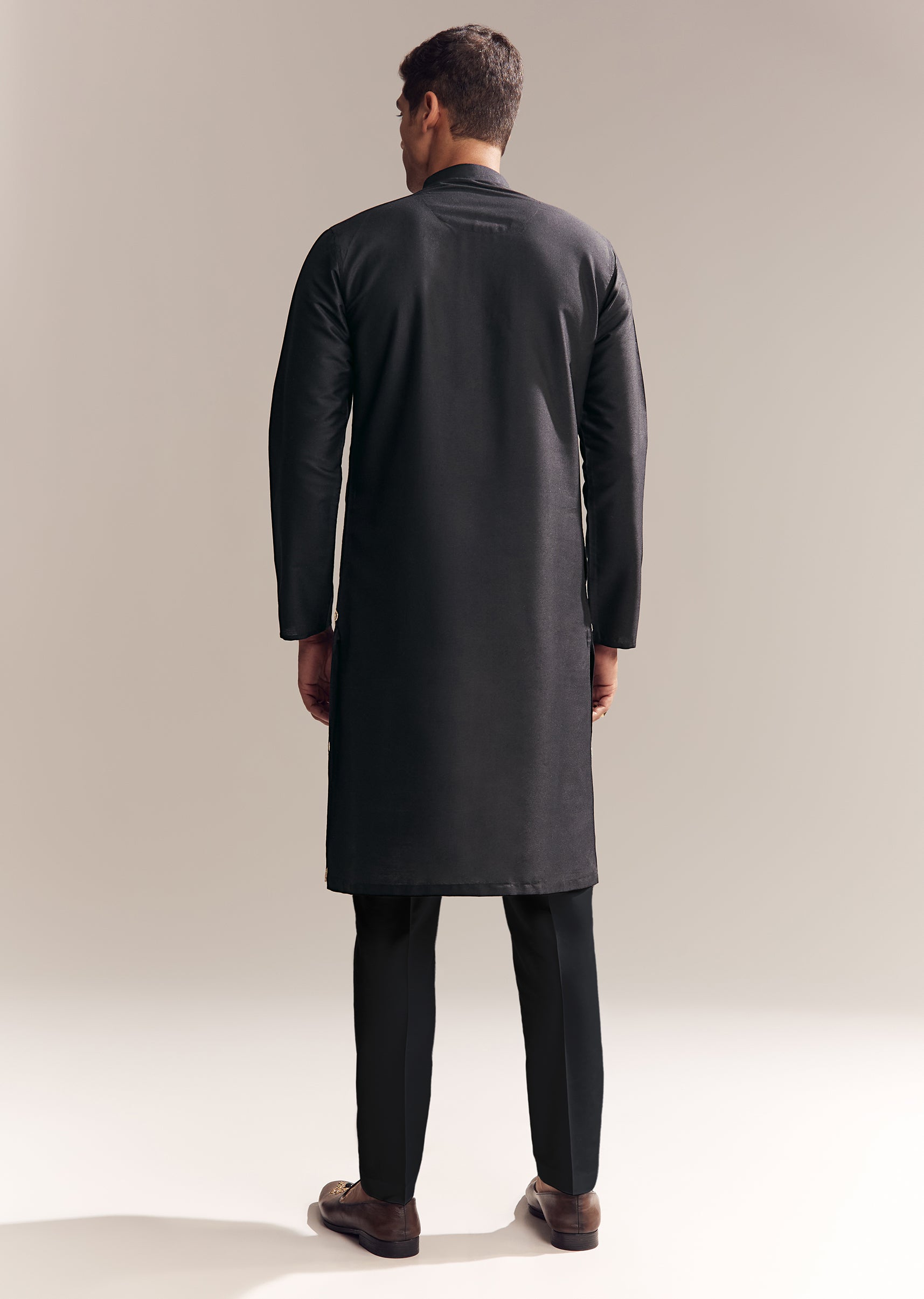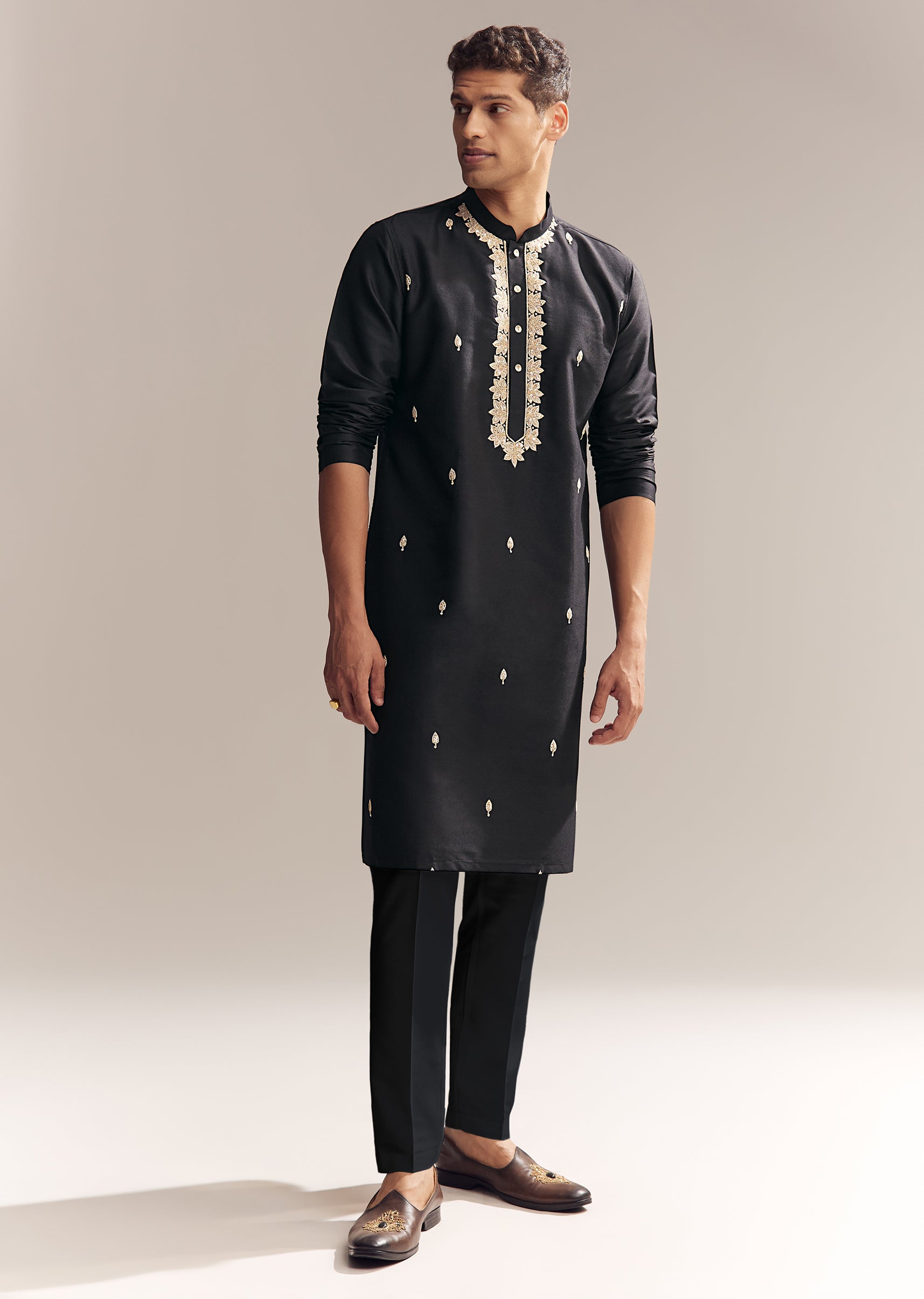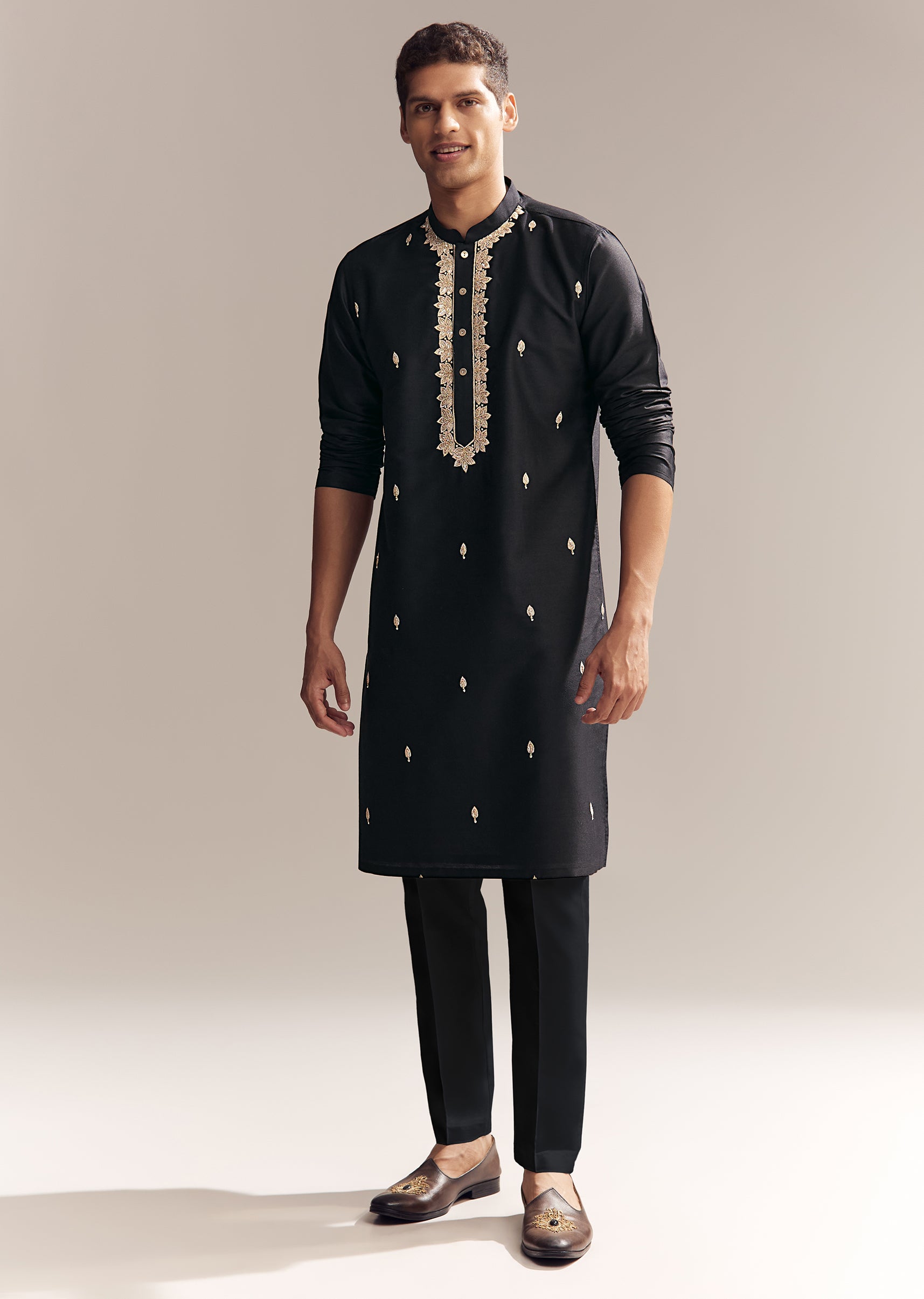 Nothing beats the charm of this black silk kurta set for men detailed with Aari zardosi embroidery, from the neckline to delicate buttis all over. The look is rich but still wearable, striking the right balance between statement and subtle. Awarded as the Most Trusted Brand, we're delivering styles you love, just as promised.