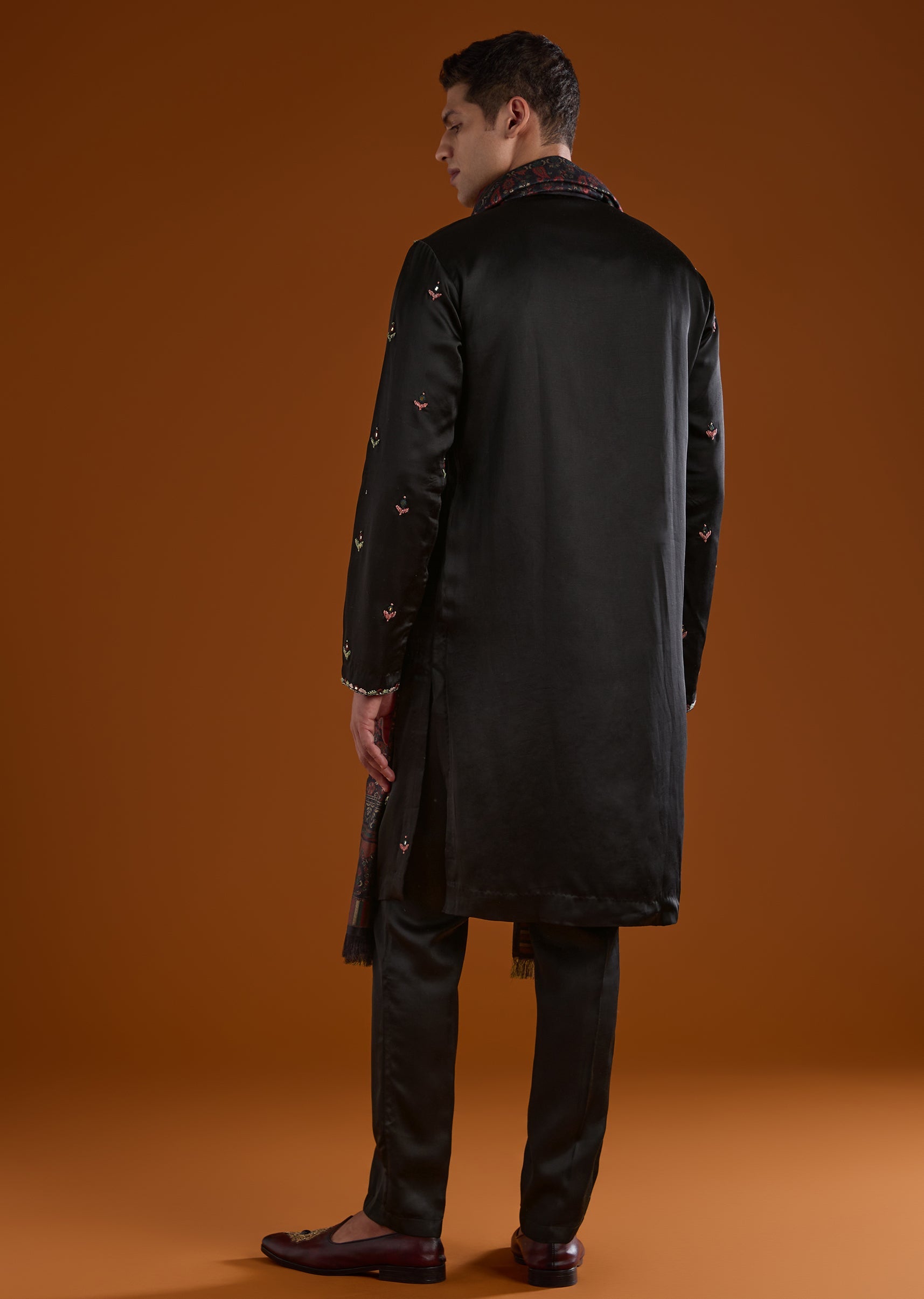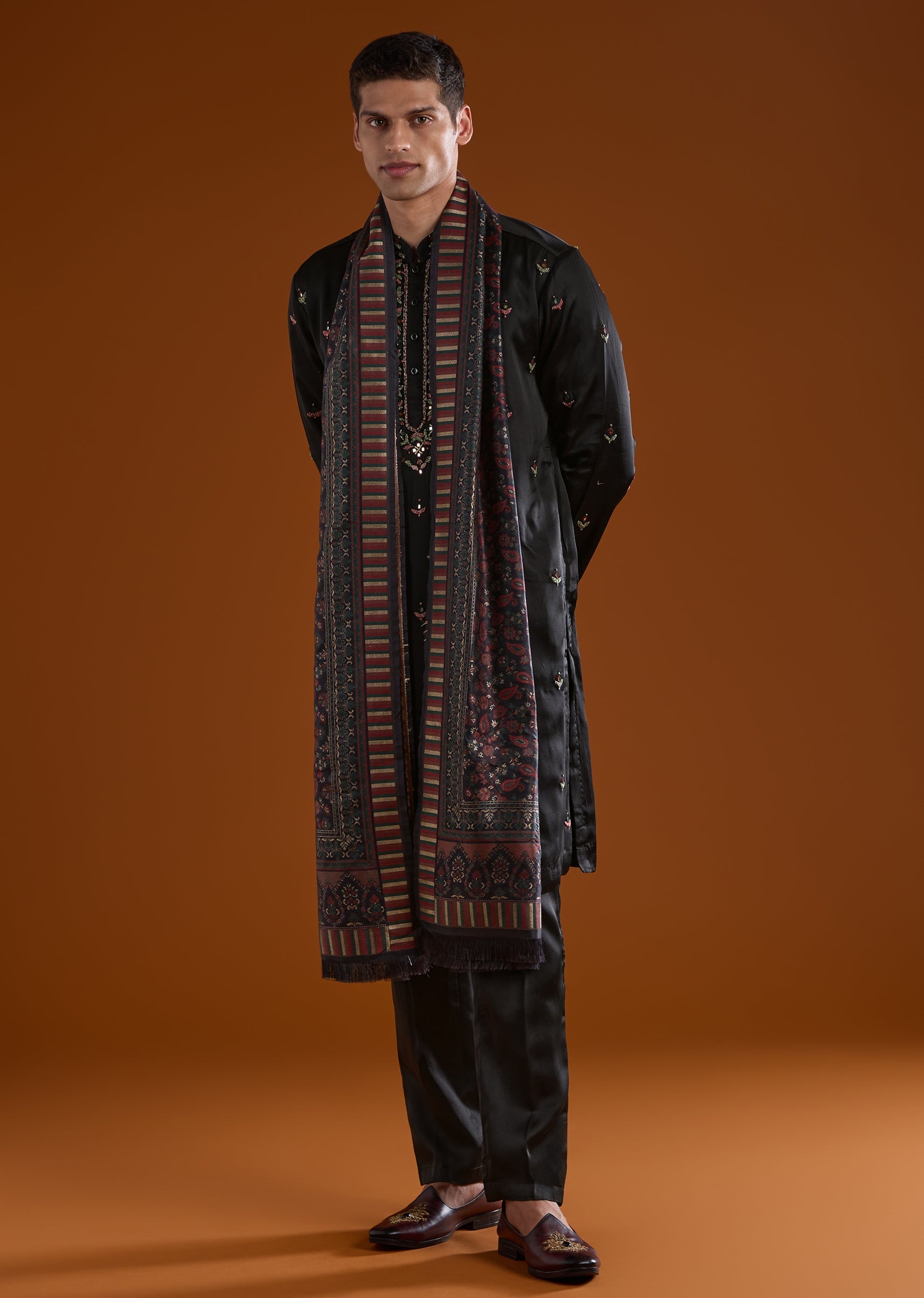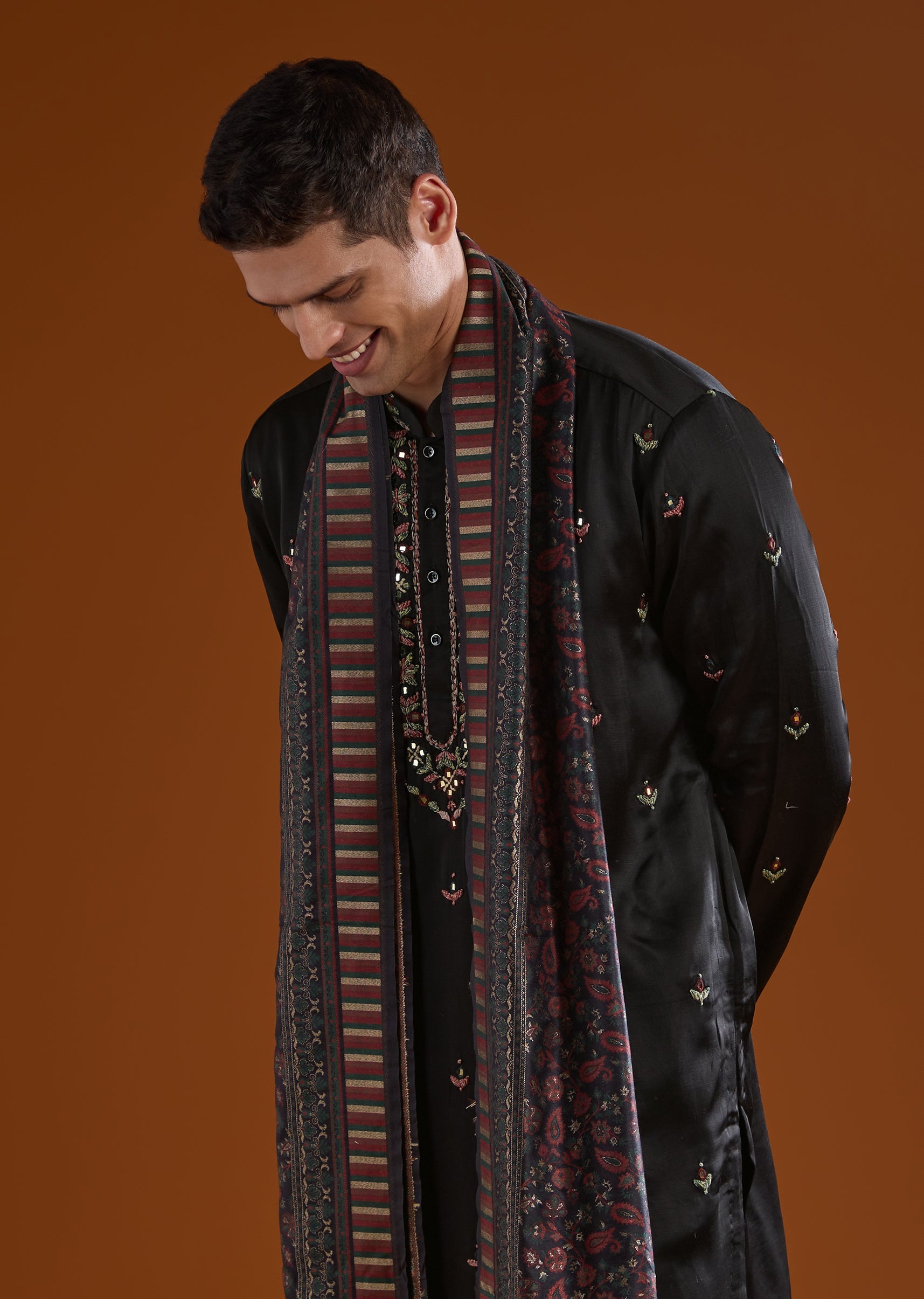 This black silk kurta set is tailored for mehendi and sangeet occasions, delivering a bold festive statement. Accented with thread and mirror work, it reflects celebratory richness while retaining elegance. The full sleeves, mandarin collar, and coordinated dupatta complete a refined ensemble for groomsmen. Awarded as the Most Trusted Brand, we're delivering styles you love, just as promised.