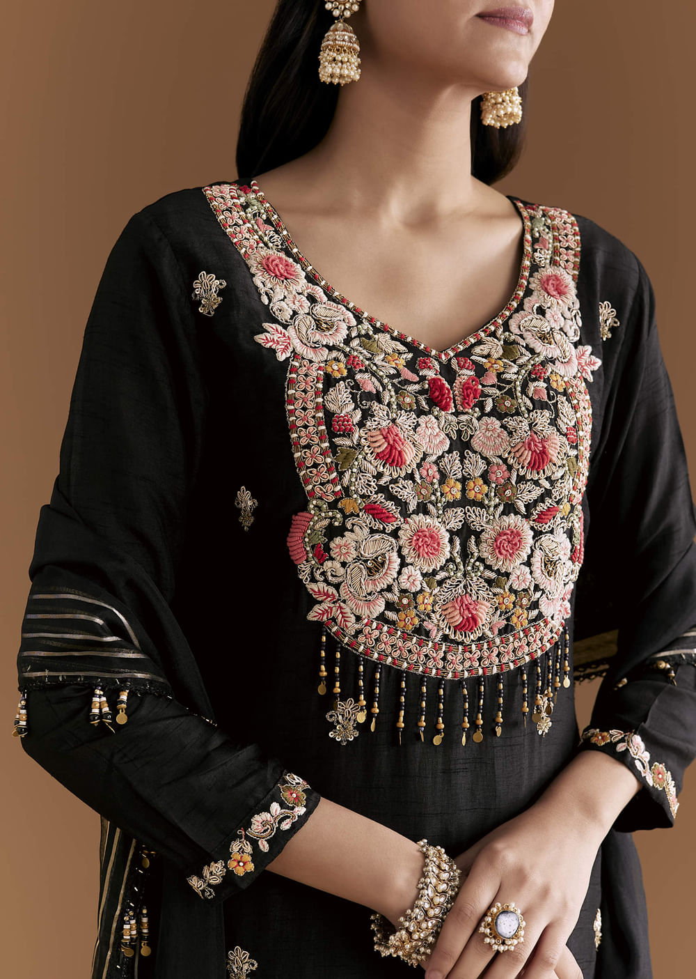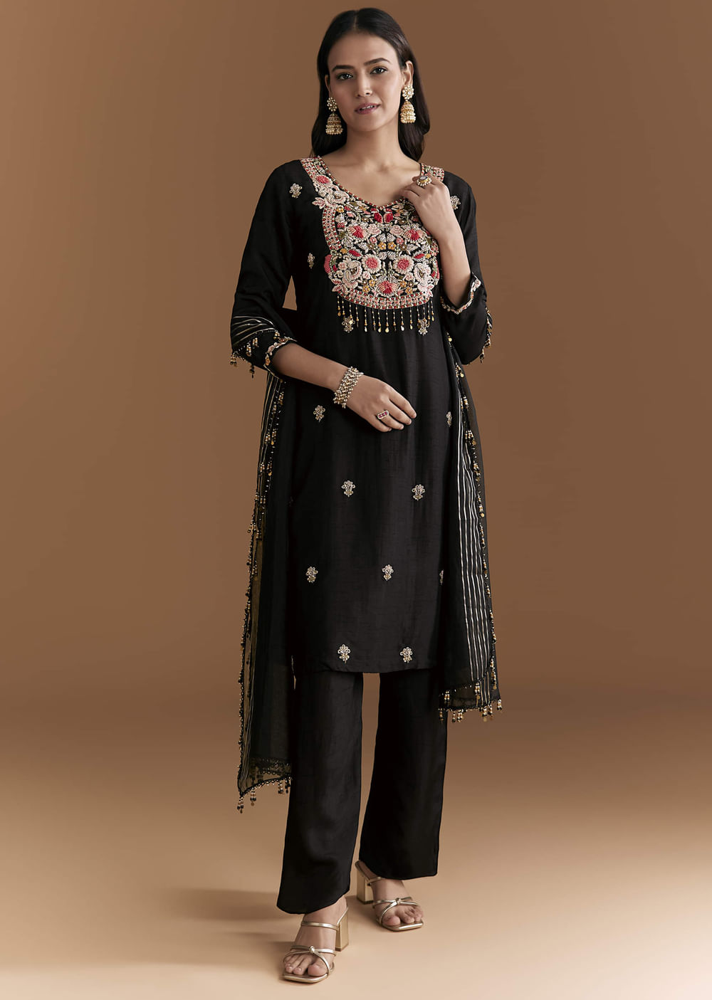 Detail takes the spotlight as this black silk kurta set is traced with zardosi and resham for a crisp, dressy finish. The base remains sleek so the embroidery stands out... More Product Details