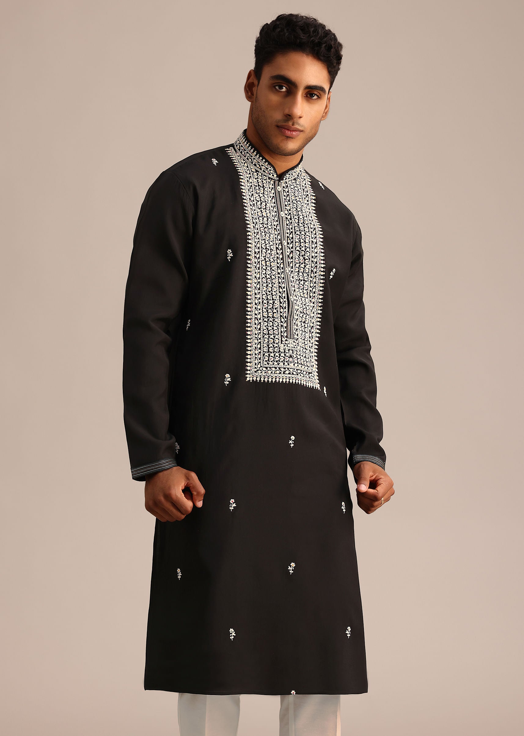 Black Silk Mandarin Collar Kurta Set With Embroidered Yoke