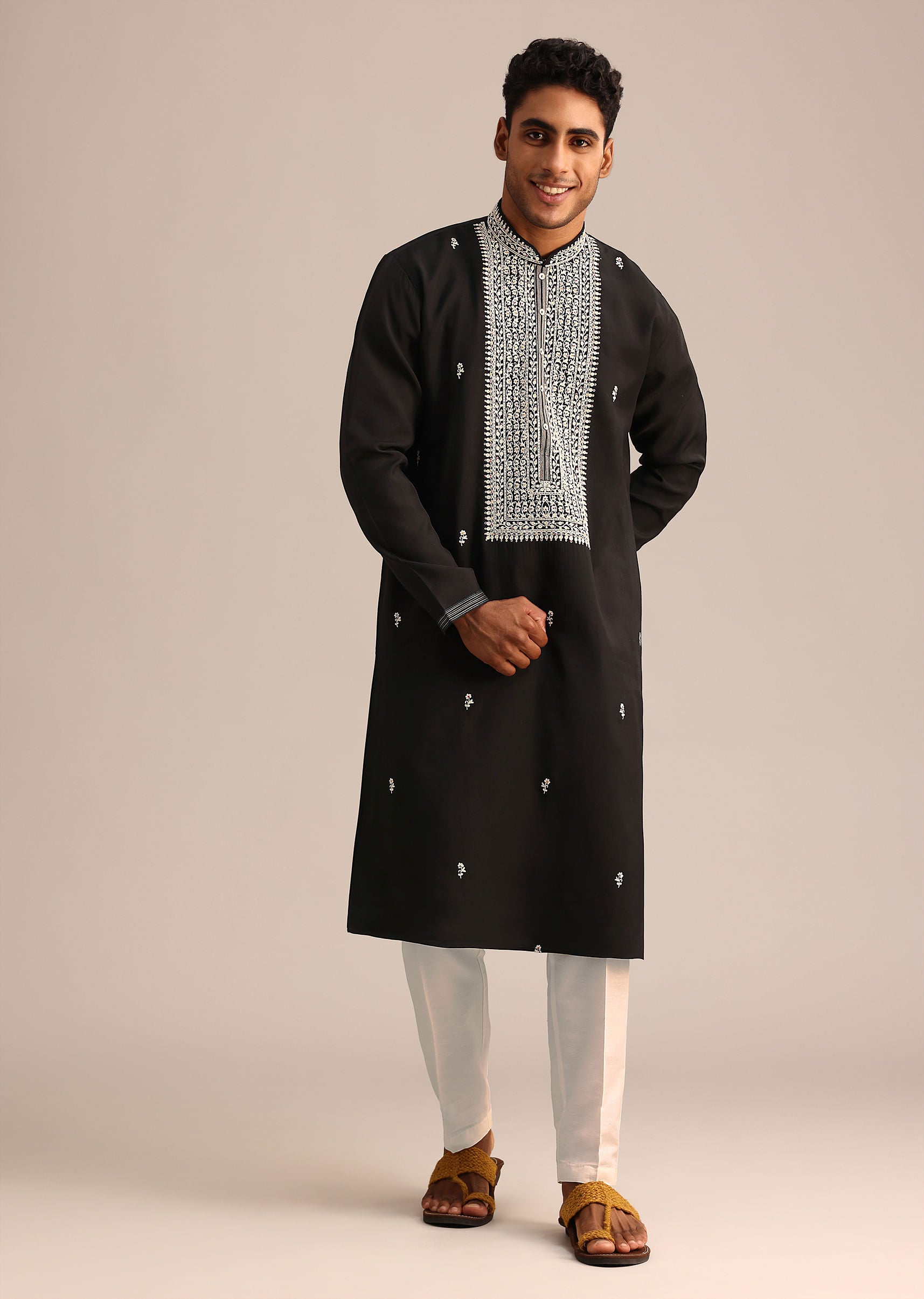 Fit Tips:The pants should be well-fitted, tapering at the ankle to balance the flowy silhouette of the kurta.