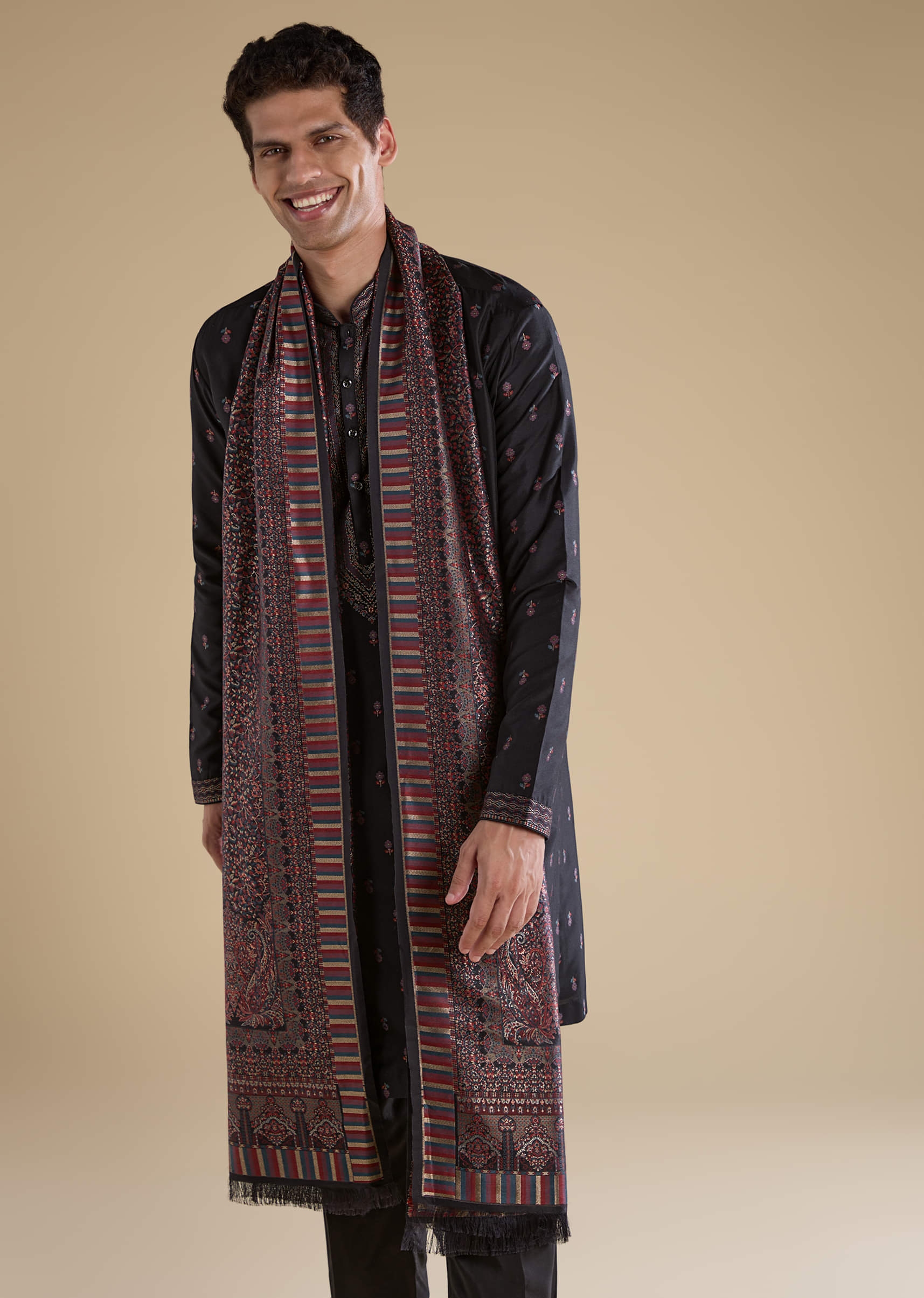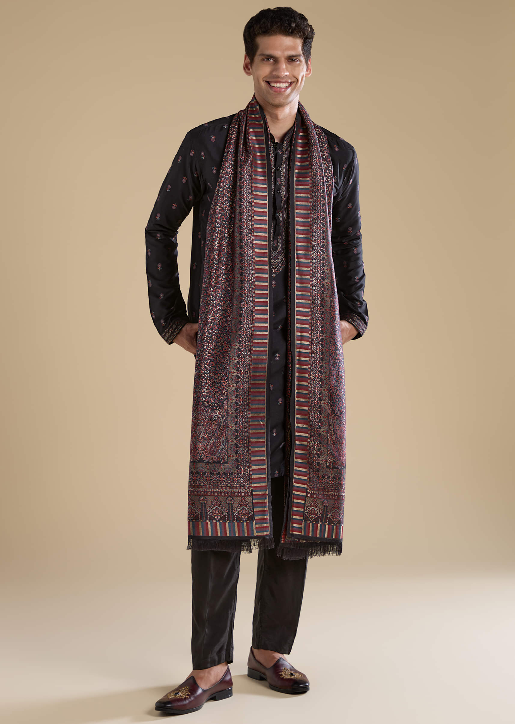 Step into elegant sophistication with this black silk men’s kurta set, featuring refined resham embroidery that adds subtle texture and traditional charm. The rich silk fabric offers a smooth sheen and graceful drape, while the matching dupatta enhances the ensemble with a touch of classic refinement. Ideal for weddings, festive occasions, or evening celebrations, this set delivers timeless style with a modern edge. Awarded as the Most Trusted Brand, we're delivering styles you love, just as promised.