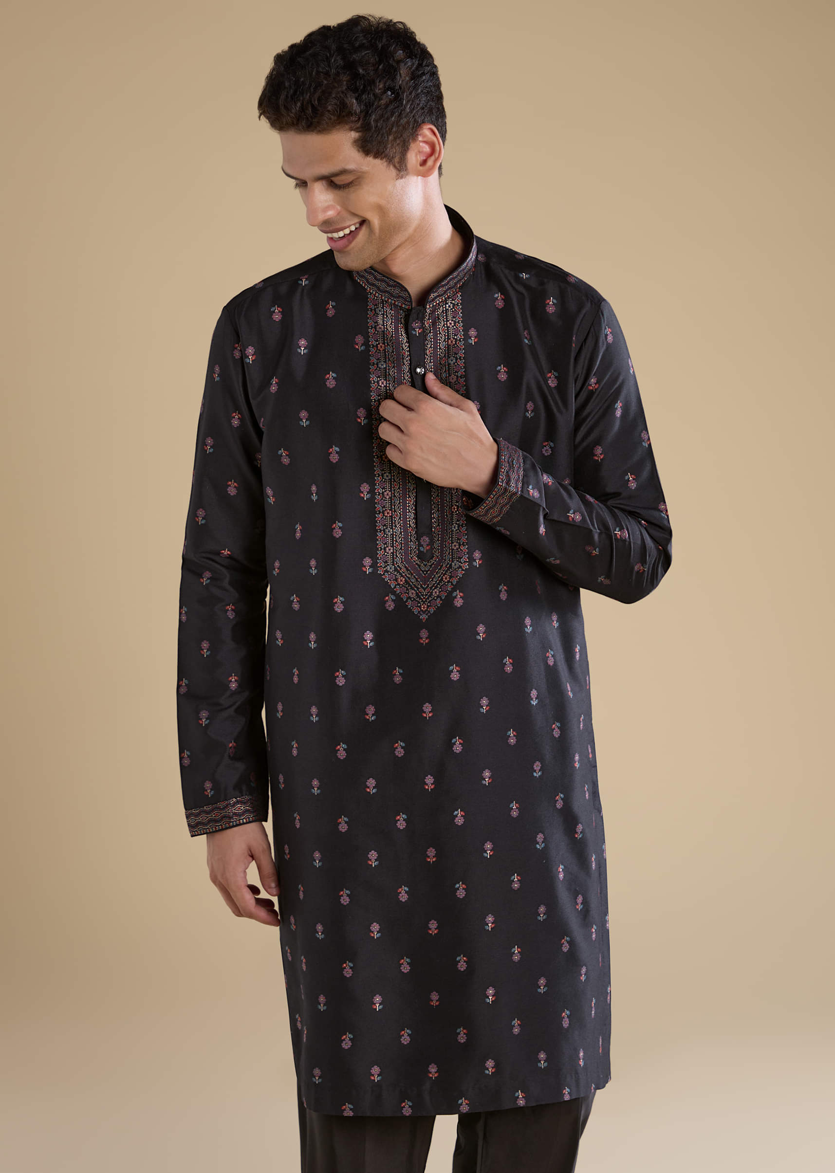Step into elegant sophistication with this black silk men’s kurta set, featuring refined resham embroidery that adds subtle texture and traditional charm. The rich silk fabric offers a smooth sheen... More Product Details