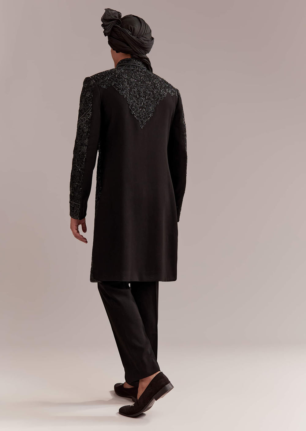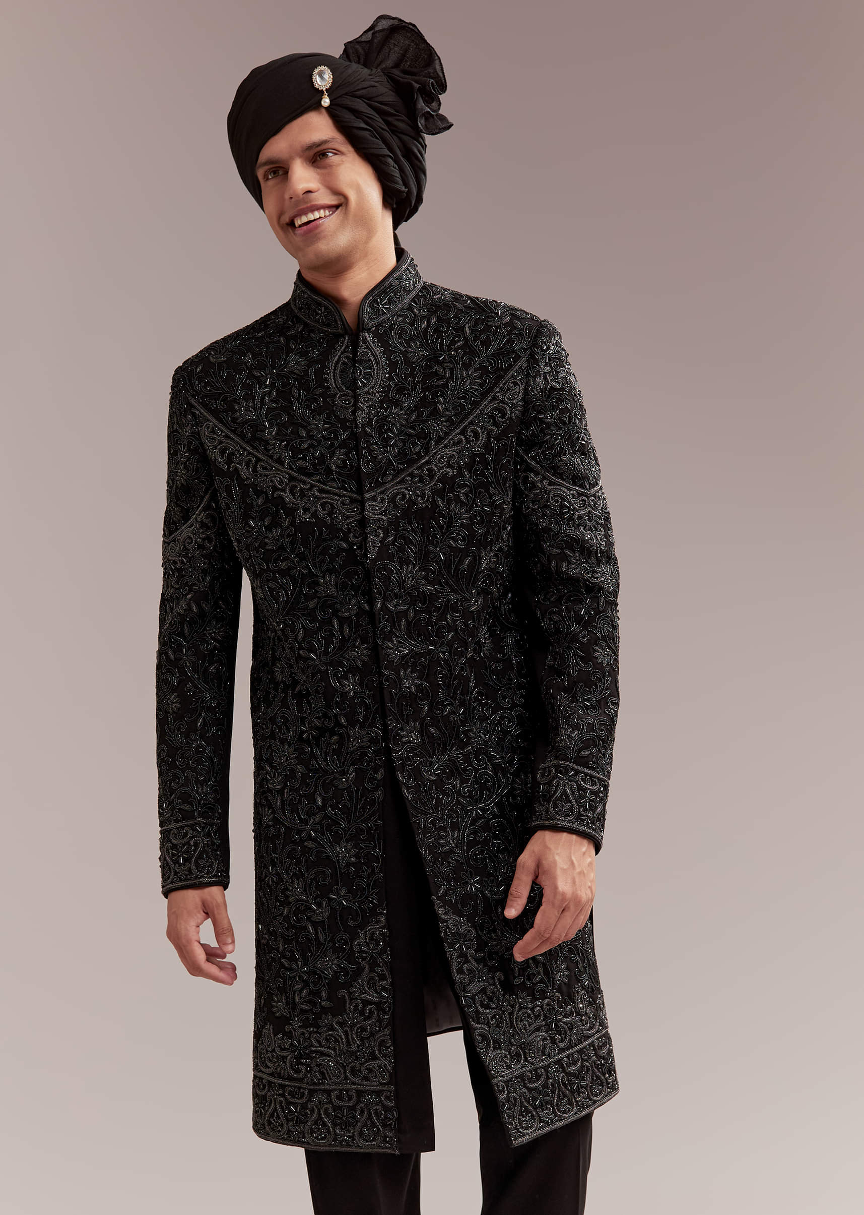 Black Silk Sherwani For Groom With Intricate Embroidery