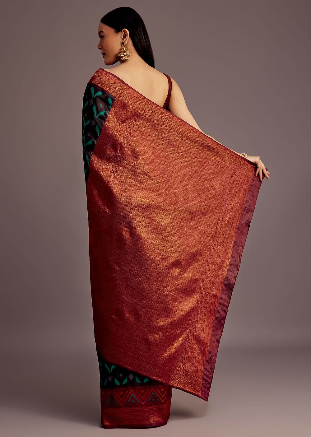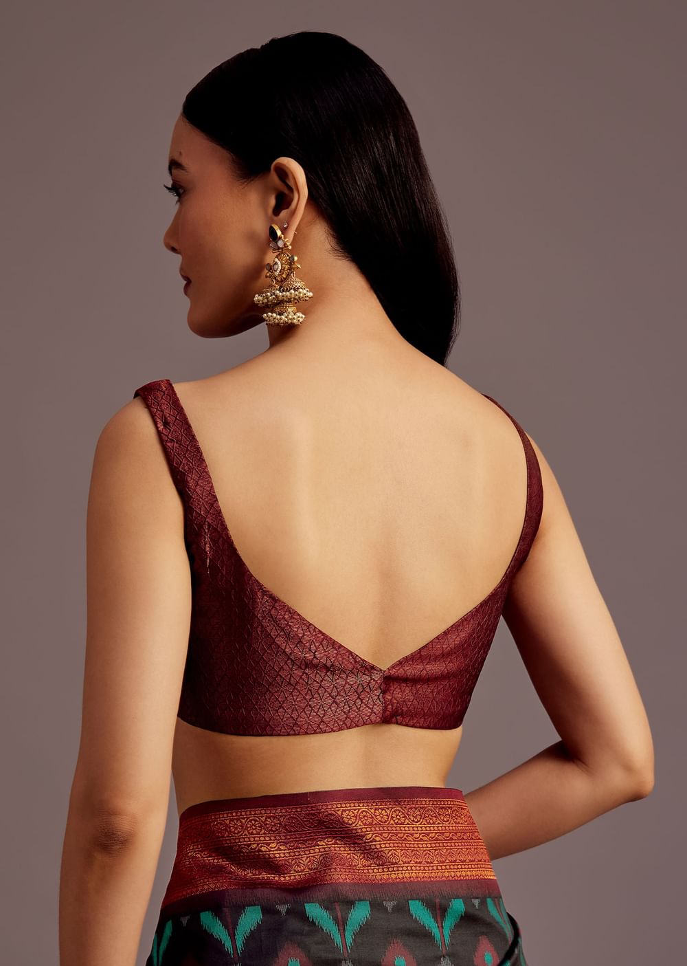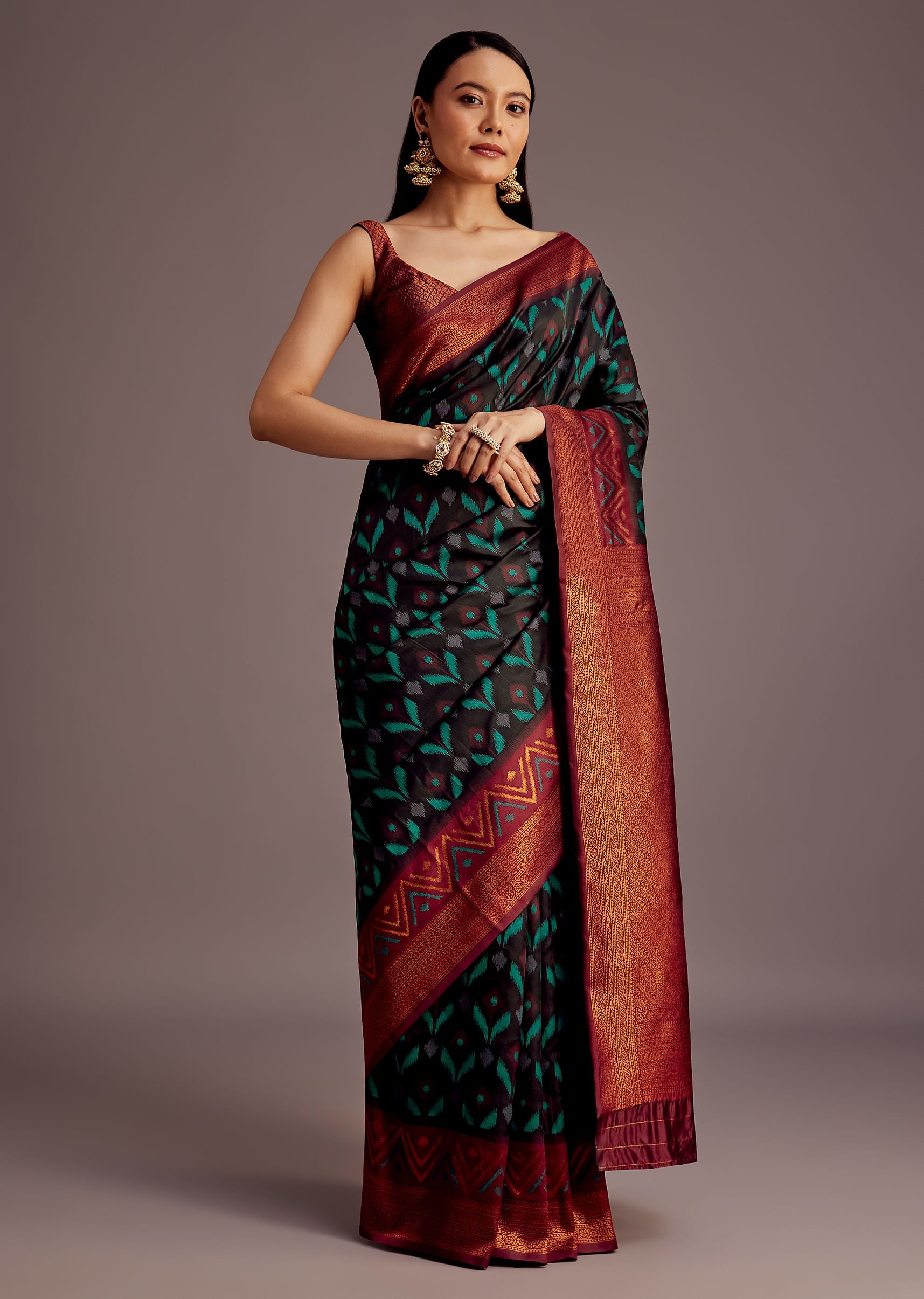 Pair with gold jhumkas, a stack of bangles, and a sleek low bun adorned with fresh gajra for a traditional festive look.
