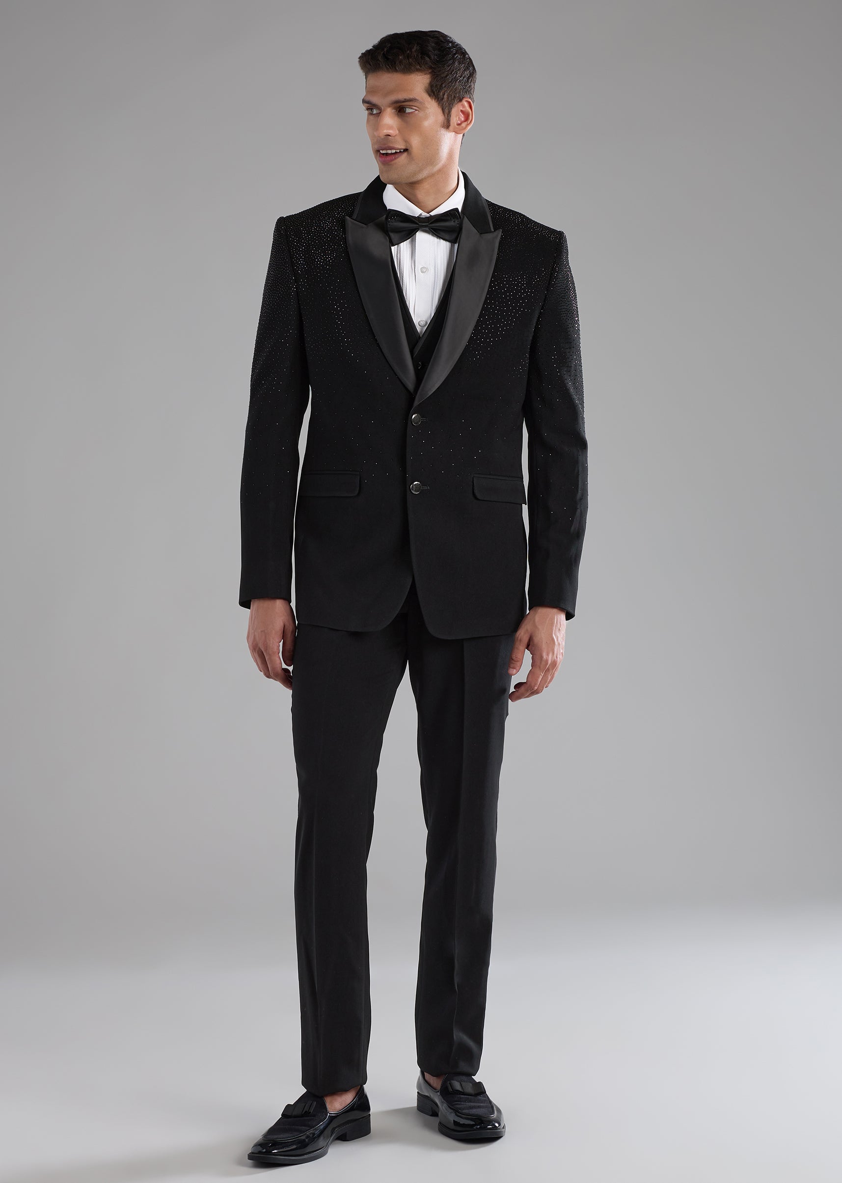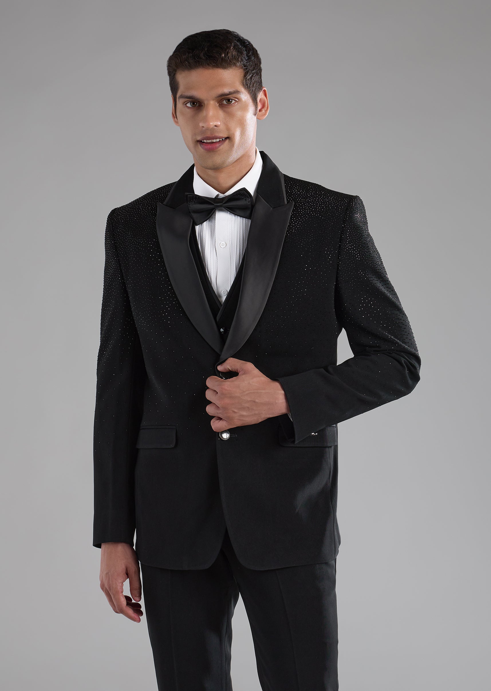 Designed to command attention with effortless elegance, this polyester tuxedo set blends classic form with modern detailing. Subtle stone embellishments add a refined shimmer, elevating the structured tuxedo silhouette without... More Product Details