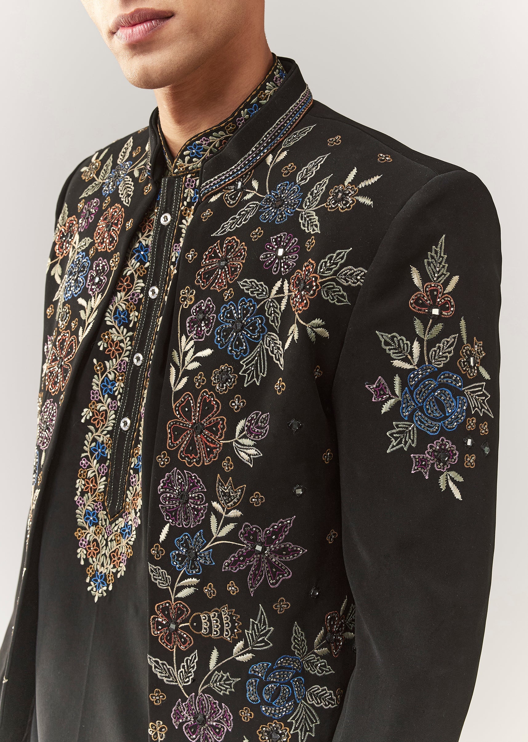 A classic festive jodhpuri set in suiting fabric featuring thread/resham, cutdana, and stone embellishment. Mandarin collar and full sleeves with front button + hook-eye closure. Comes as a 3-piece set:... More Product Details
