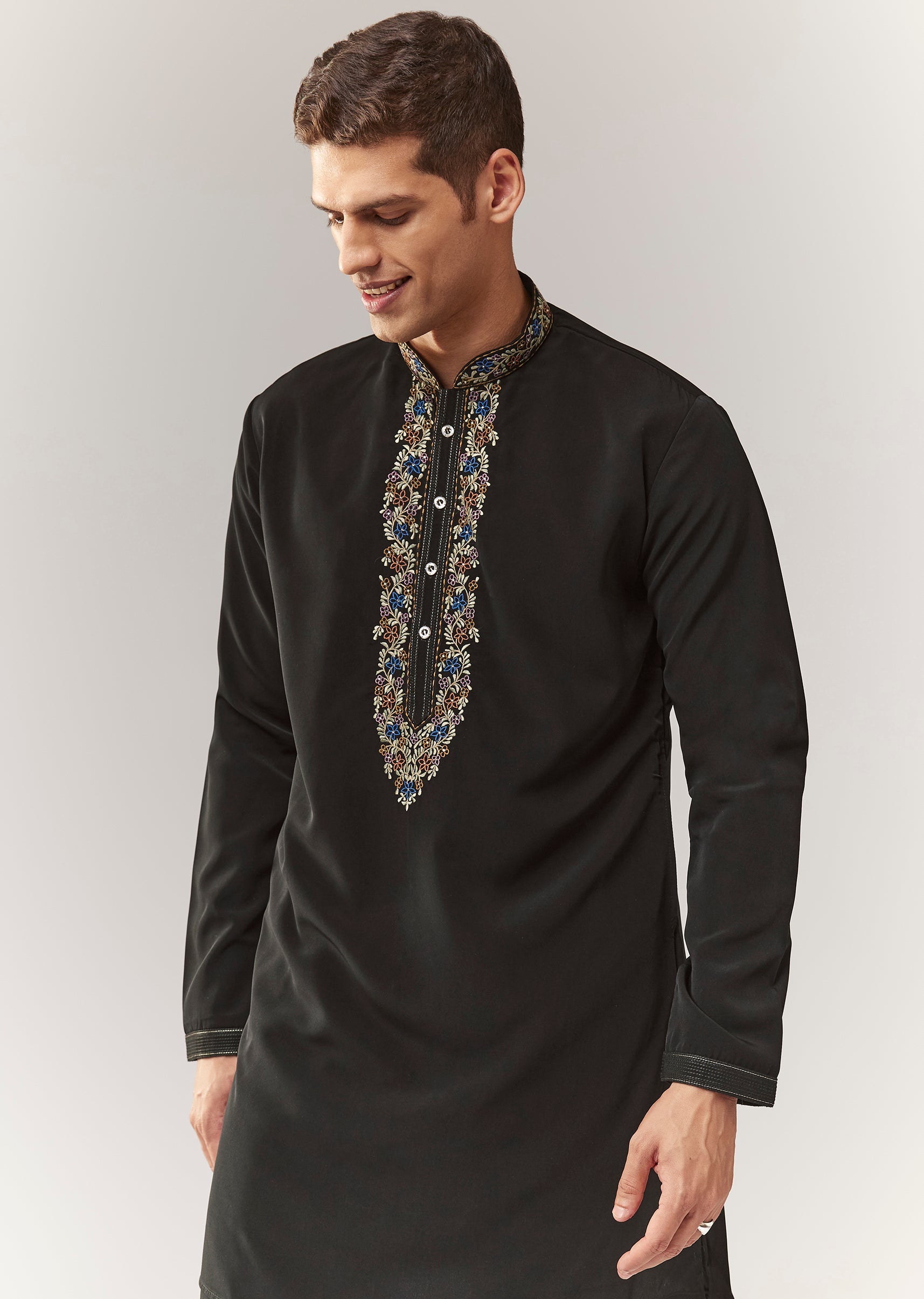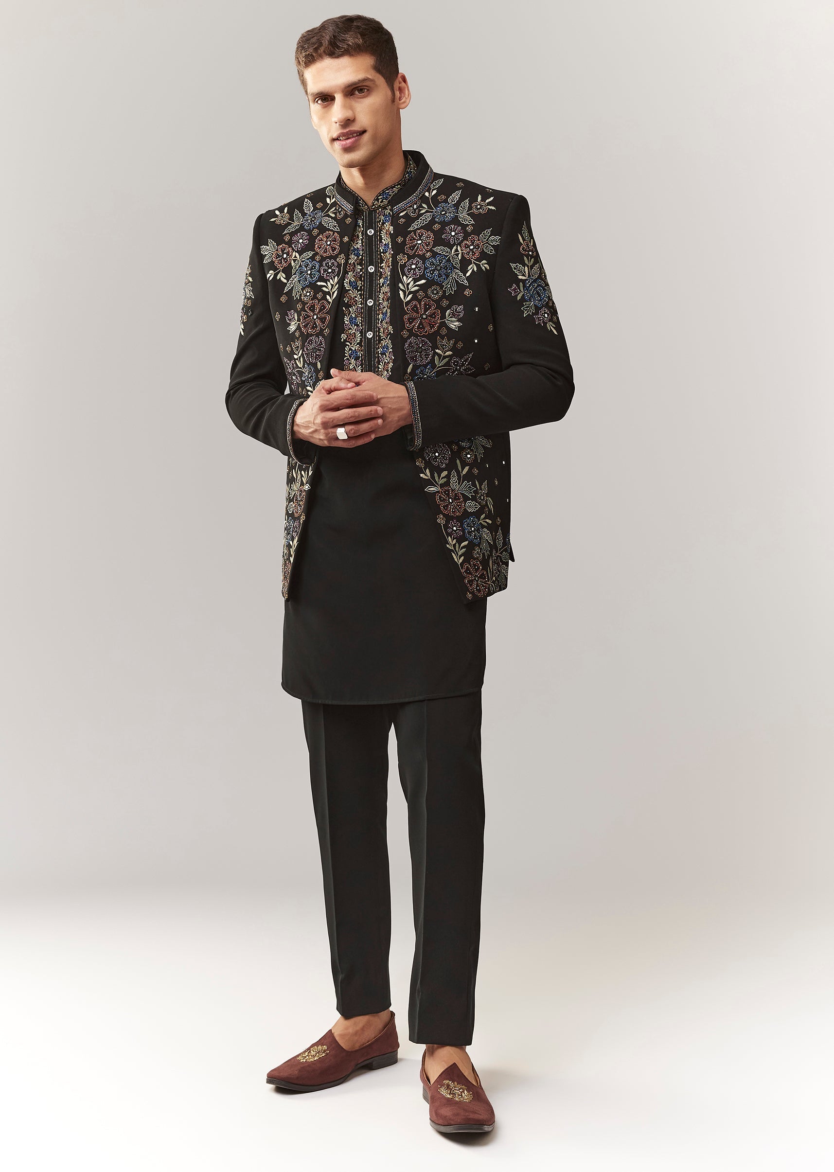 Pair with black mojaris and a sleek pocket square/dupatta drape.