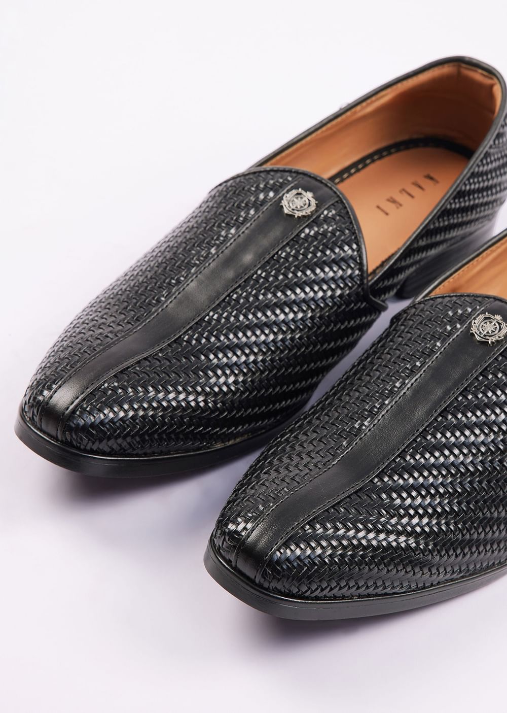 - These black textured juttis are a sophisticated blend of tradition and modernity featuring a woven pattern and sleek leather accents.