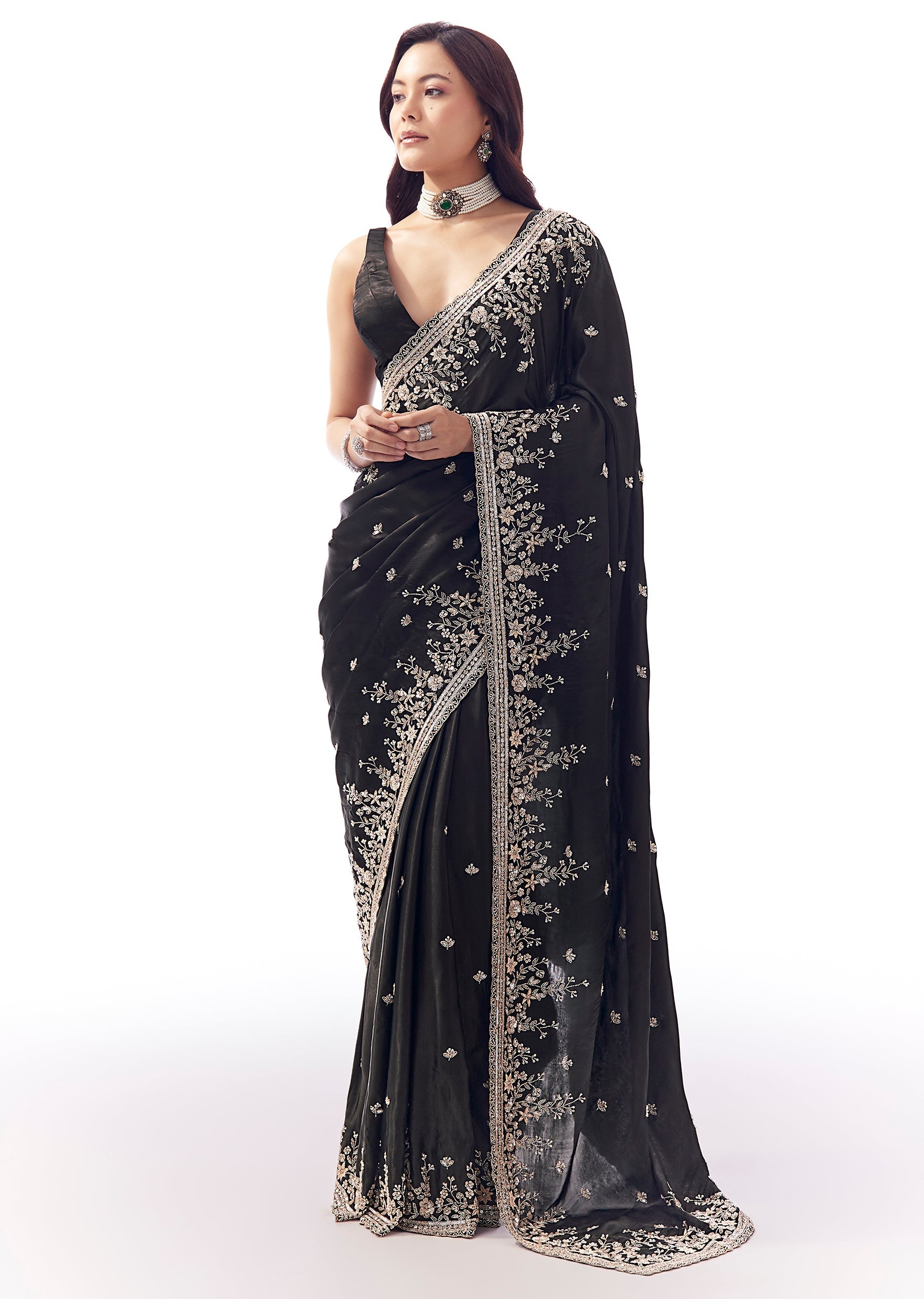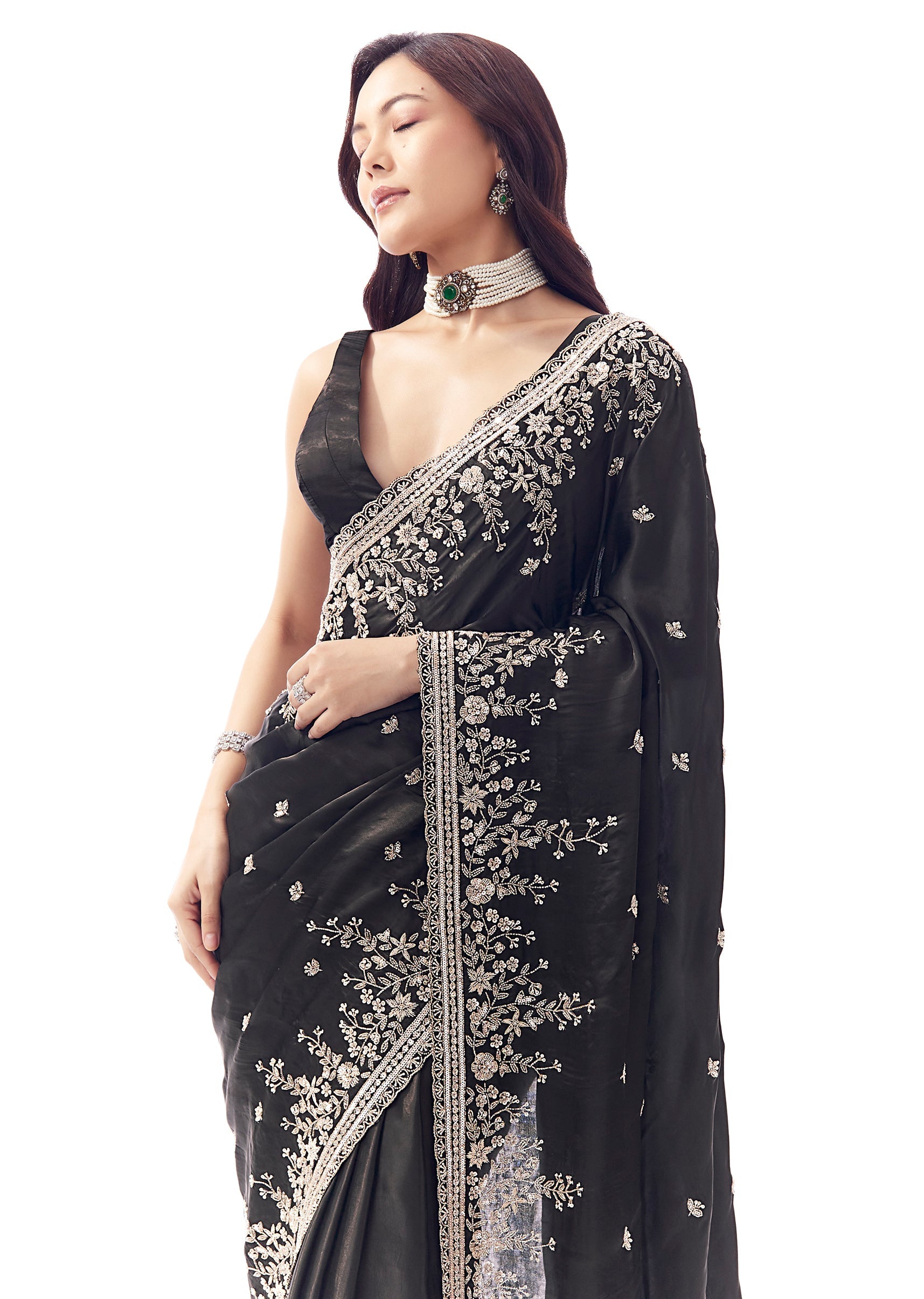 This black tissue silk saree is crafted for glamorous nights. Featuring a heavy floral embroidered uneven border and butti detailing with cutdana, sequins and beads, it gives a couture-like finish while keeping the silhouette fluid. Includes embroidered blouse fabric—perfect for sangeet, mehendi and reception celebrations.