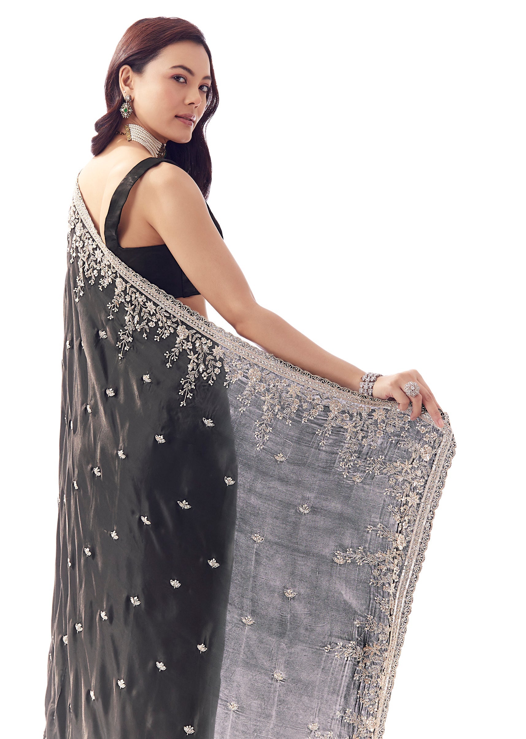 This black tissue silk saree is crafted for glamorous nights. Featuring a heavy floral embroidered uneven border and butti detailing with cutdana, sequins and beads, it gives a couture-like finish... More Product Details