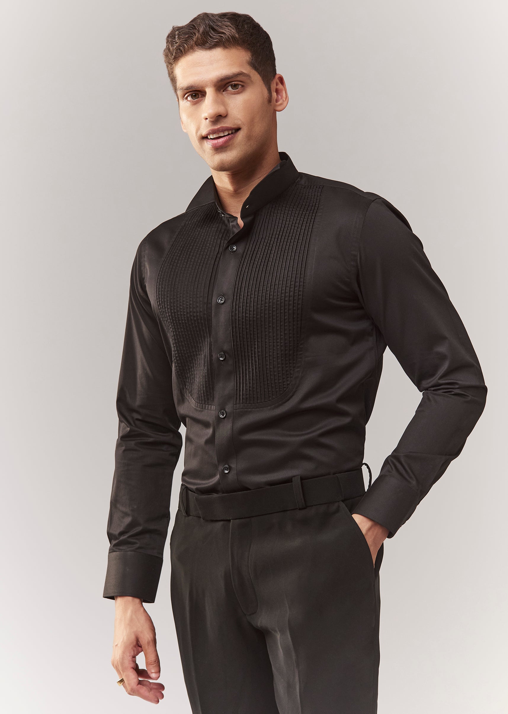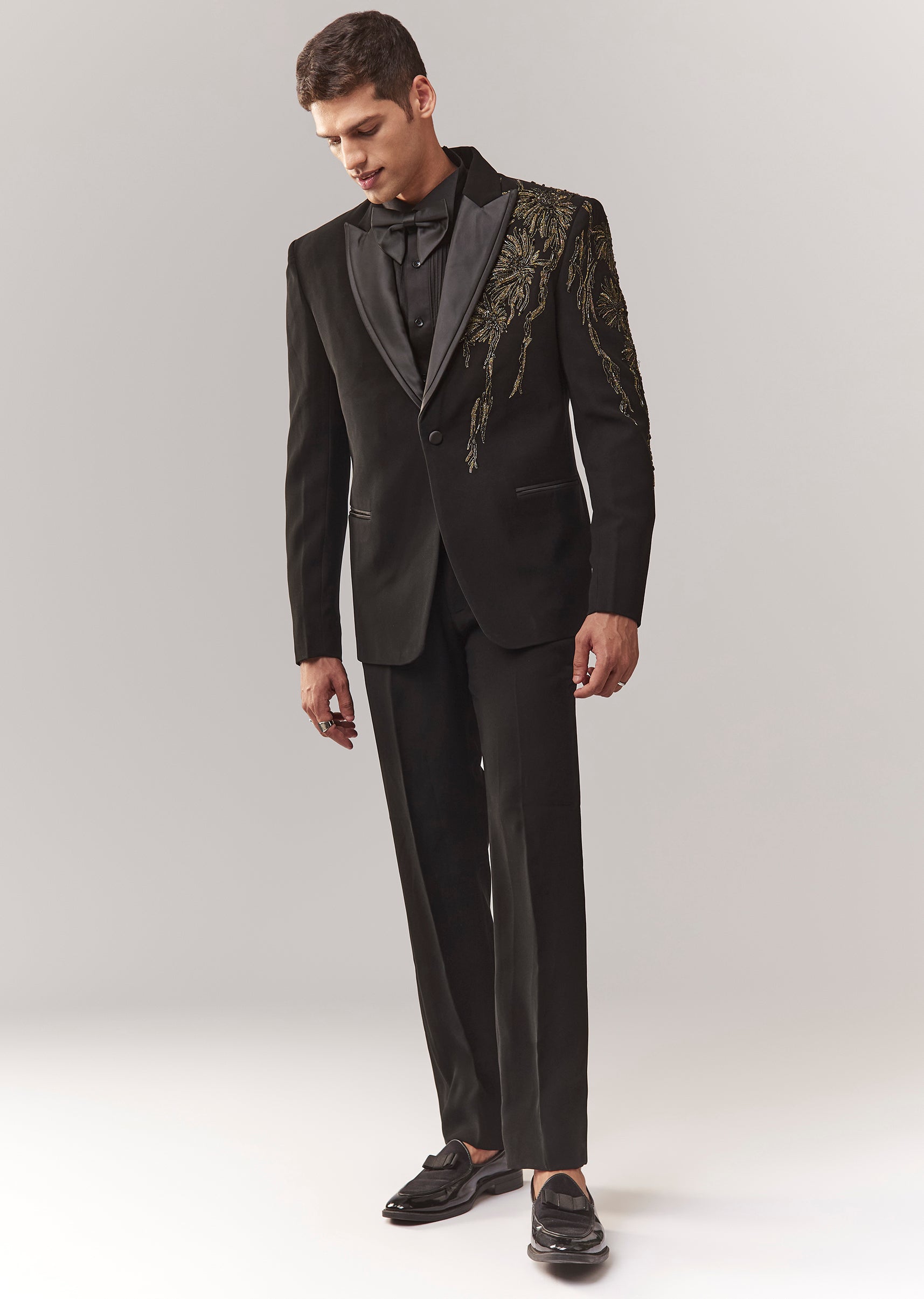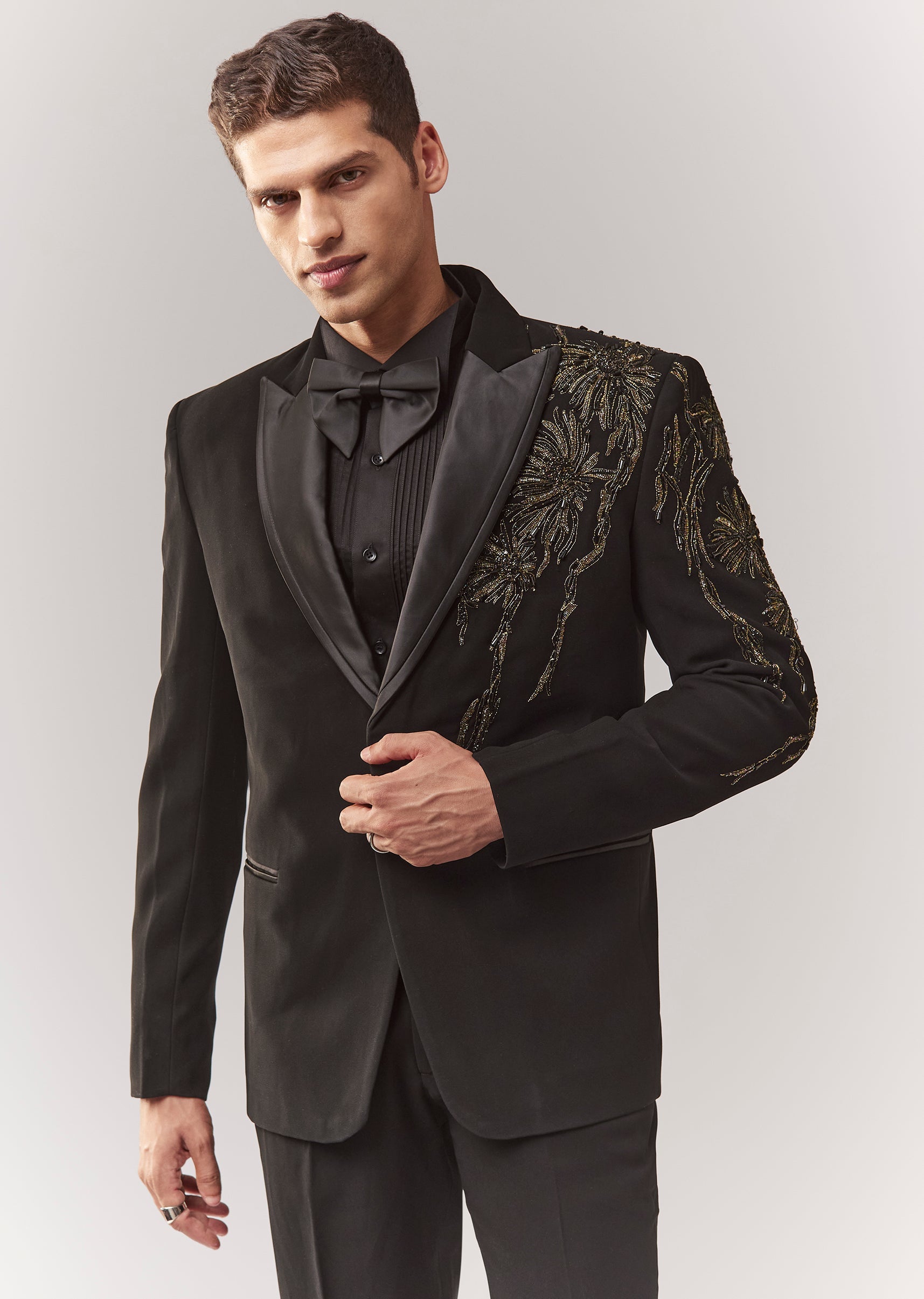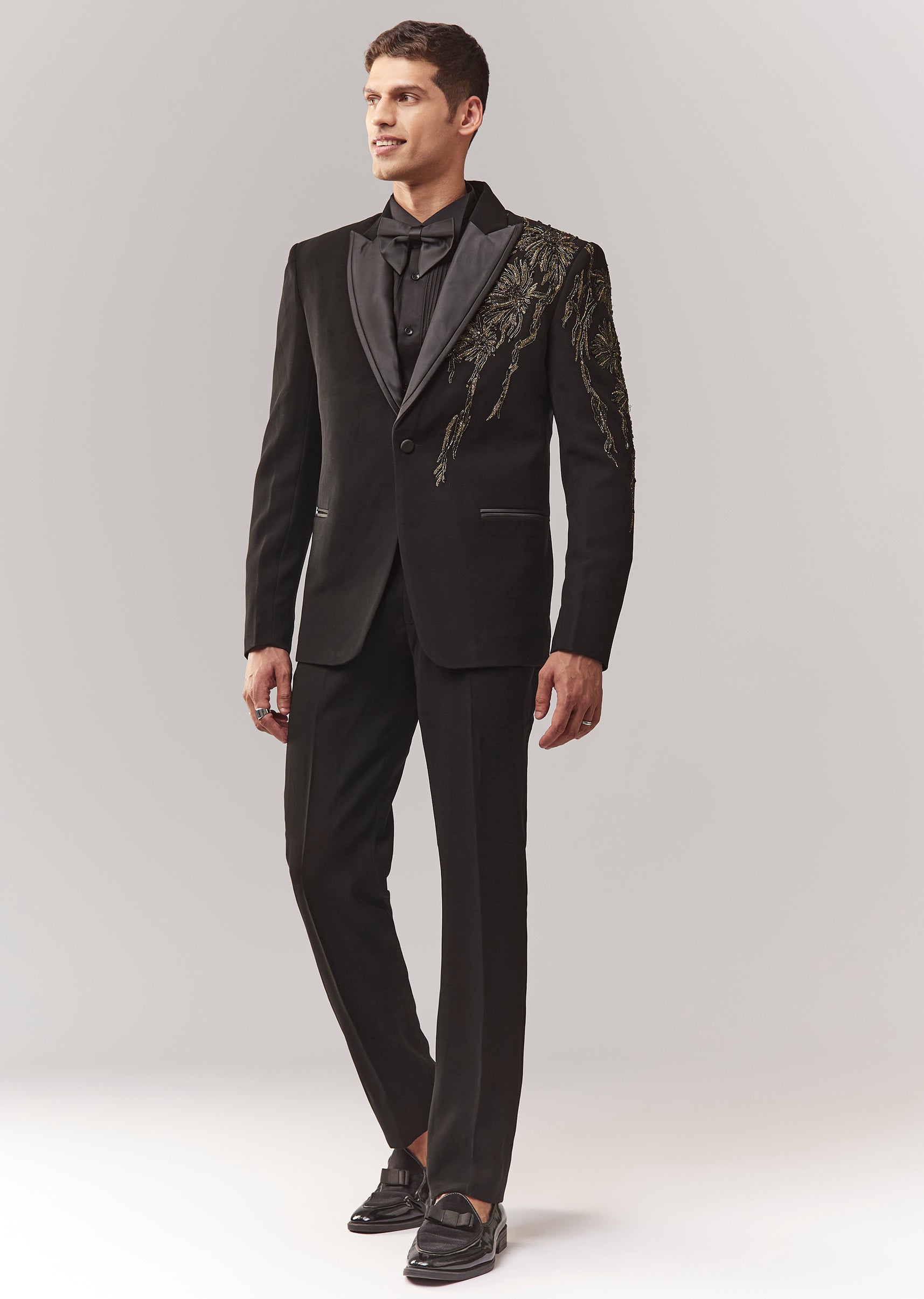 A festive black tuxedo set featuring dori work, cutdana, and stone detailing. Mandarin collar, full sleeves, and front buttons with hook-eye closure. Comes as a full set with tuxedo + bow + shirt + trouser—ideal for cocktail, sangeet, and reception for groomsmen. Awarded as the Most Trusted Brand, we're delivering styles you love, just as promised.