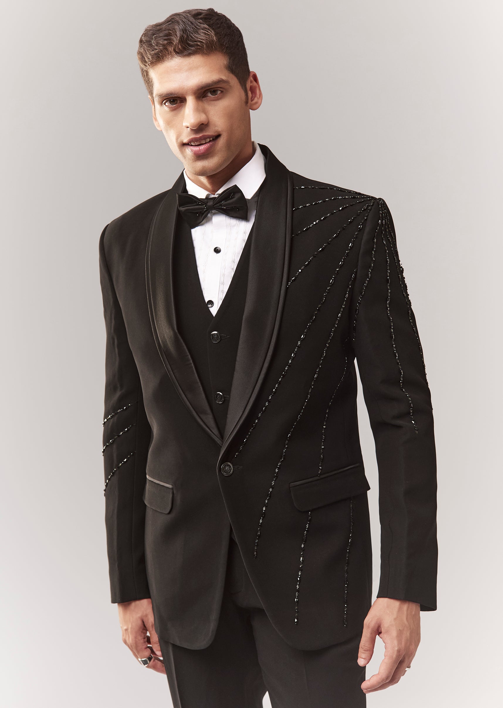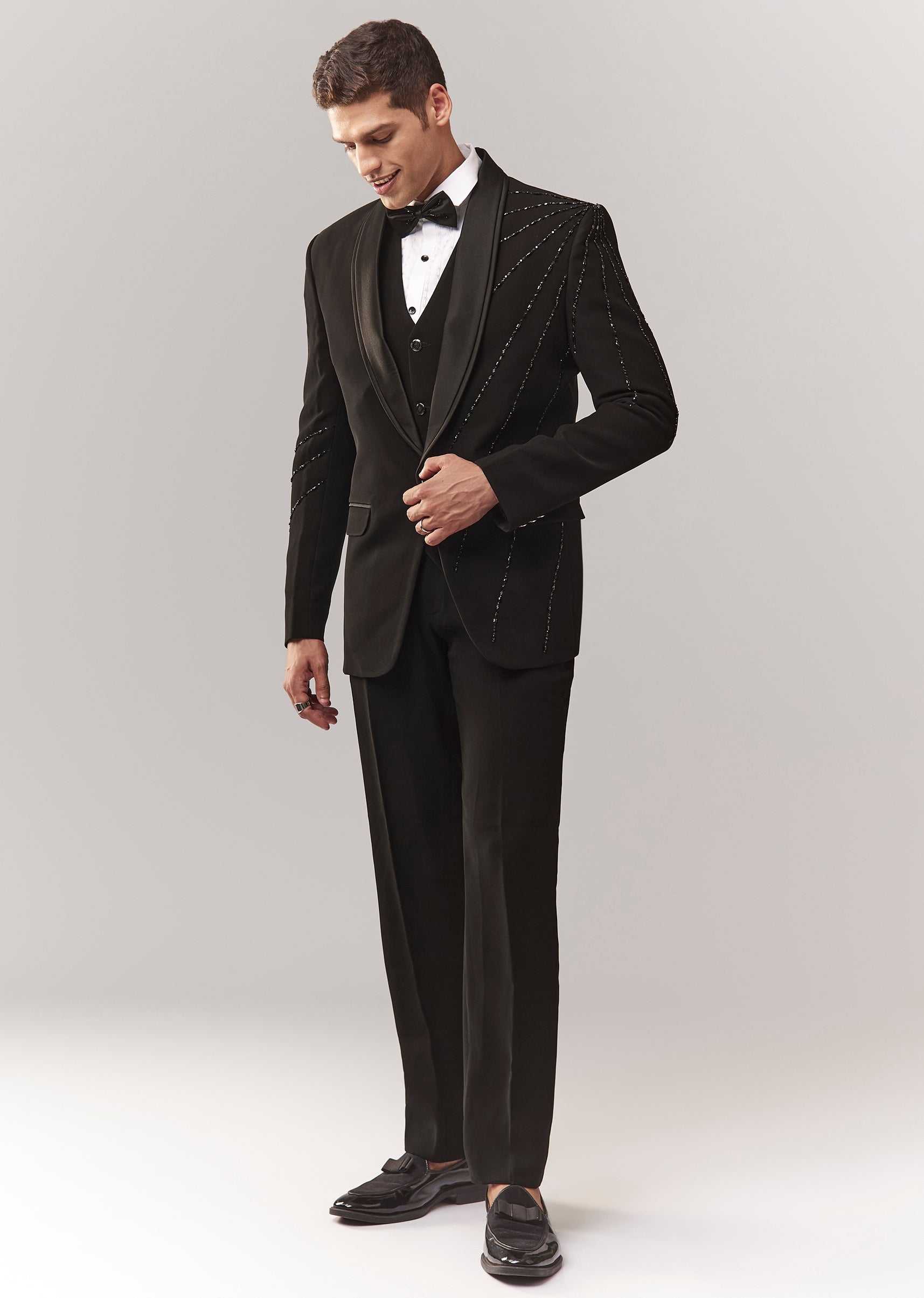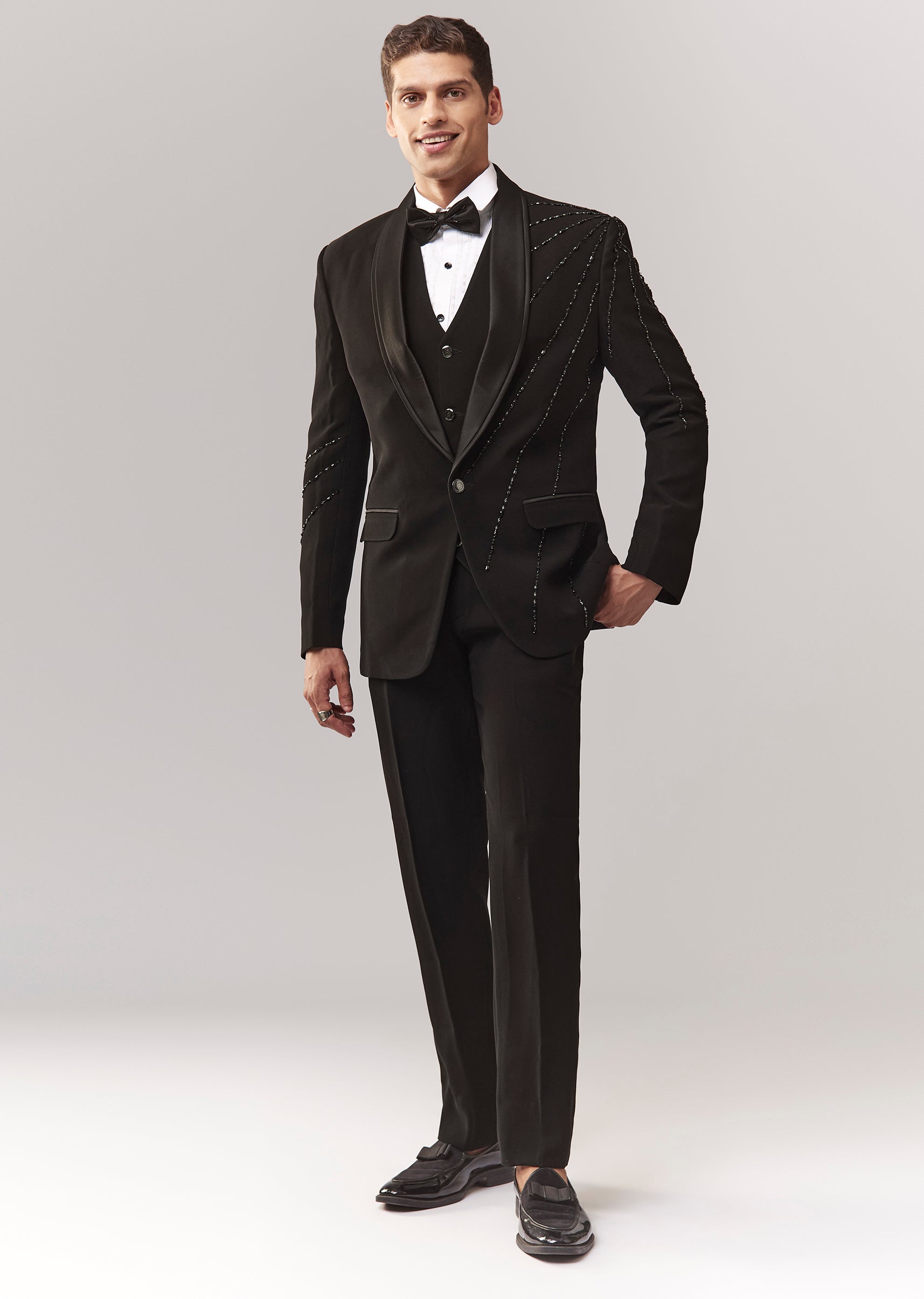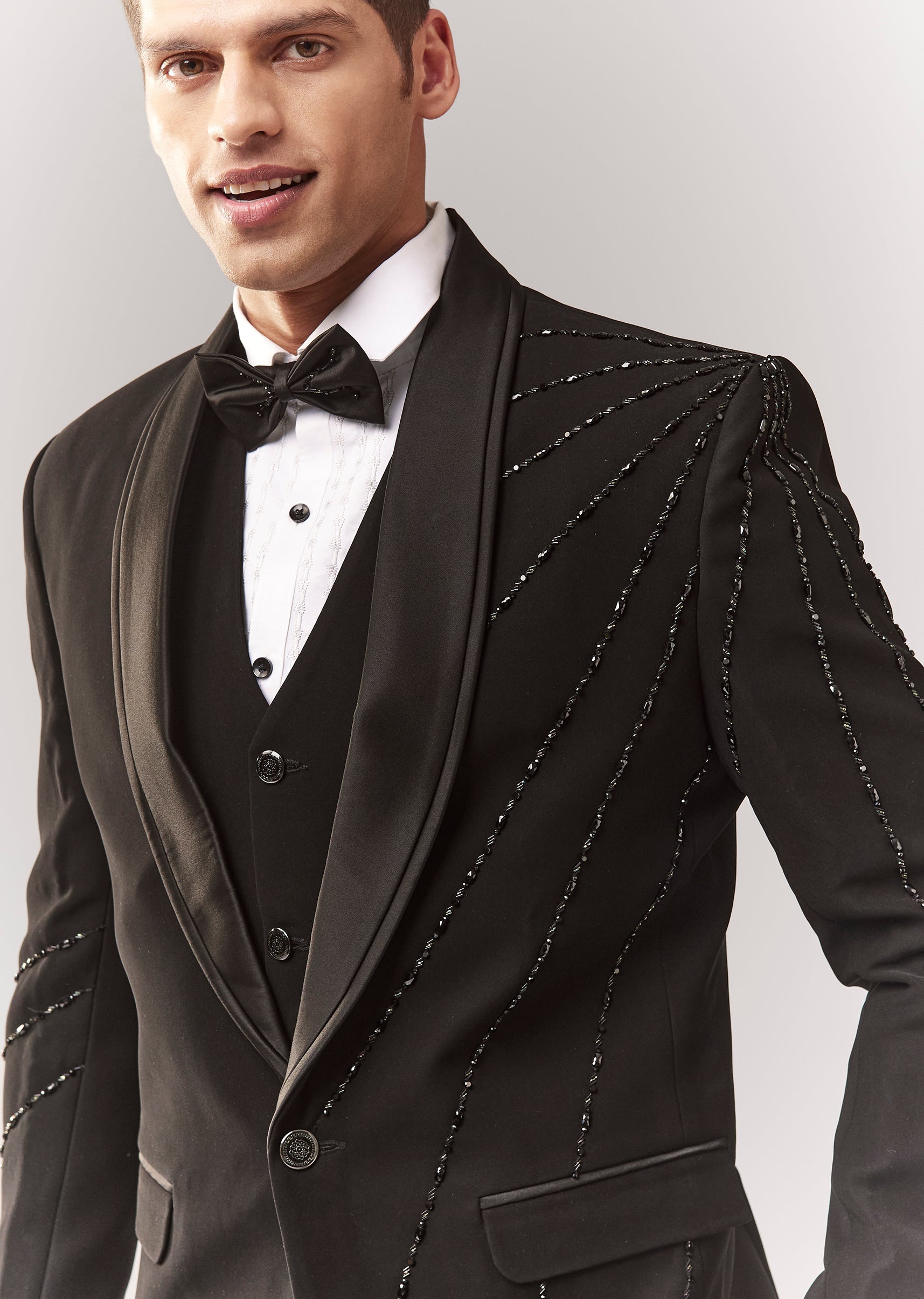 Black Tuxedo Set With Waistcoat Cutdana And Stone Work