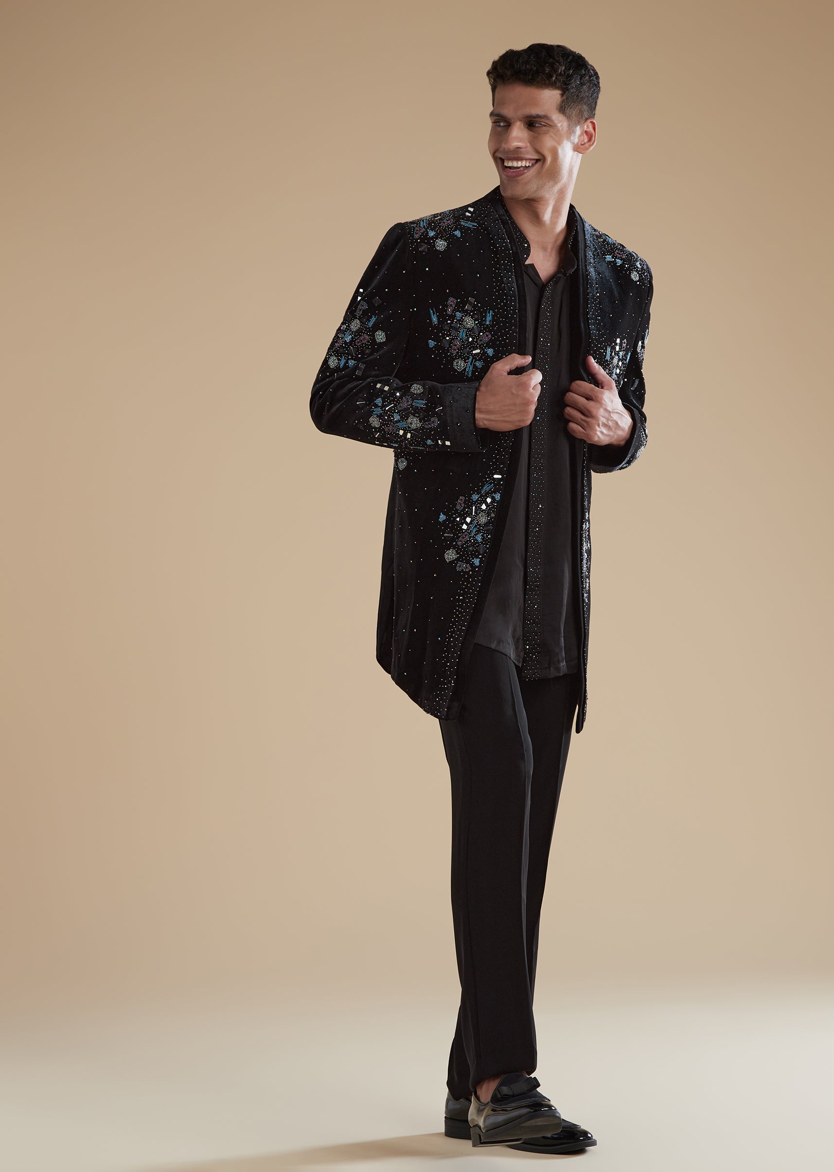Black Velvet Mens Indowestern with Mirror Beads Detail Work