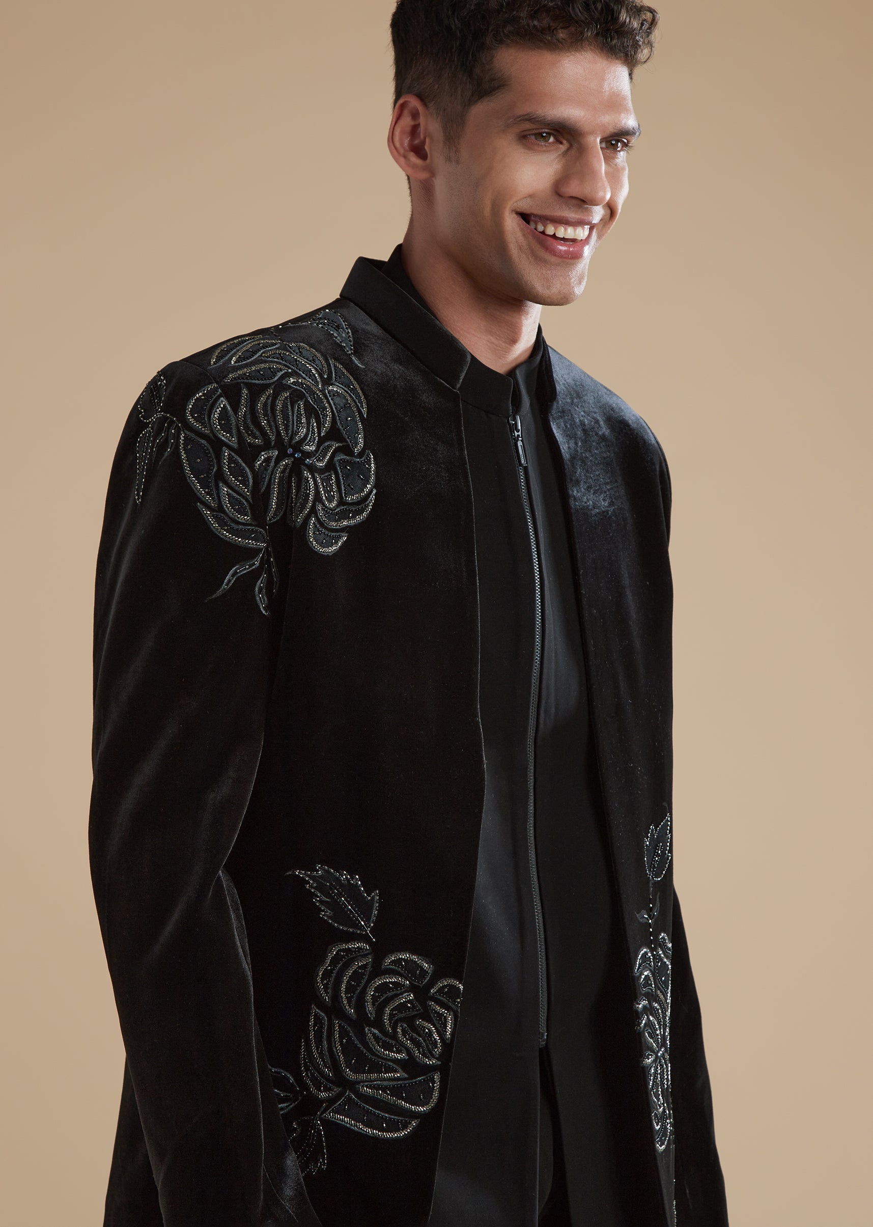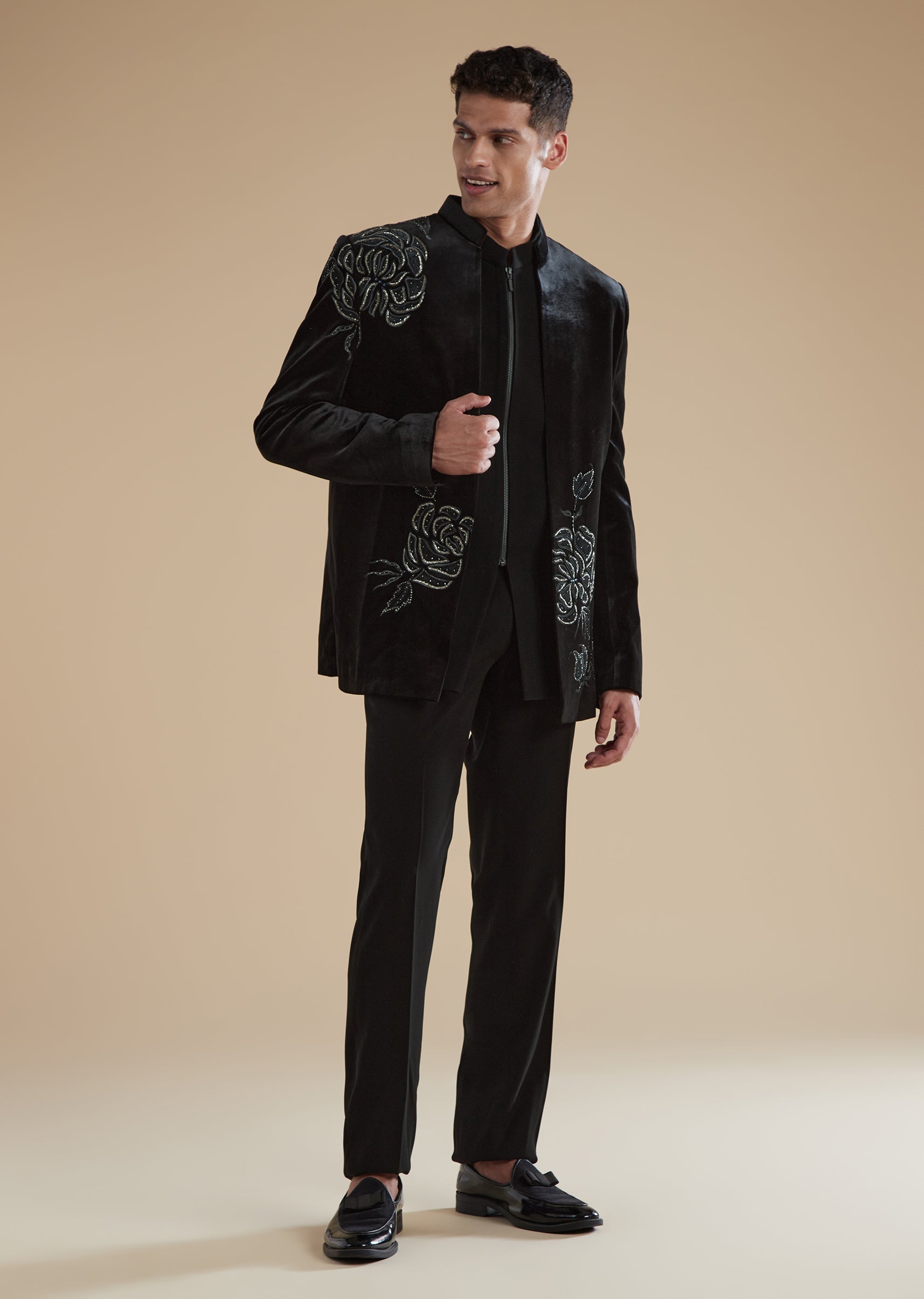 This striking black jodhpuris set is crafted in plush velvet and designed for sangeet engagement and reception evenings. The rich base is elevated with intricate cut dana and moti detailing that adds a refined festive shine perfect for a groomsman or the grooms brother. The silhouette stays classic with a mandarin collar and full sleeves while the top closure features a front zip and the bottom closure is finished with front buttons. Paired with an Indowestern kurta and coordinated pants this ensemble delivers a bold elegant statement.