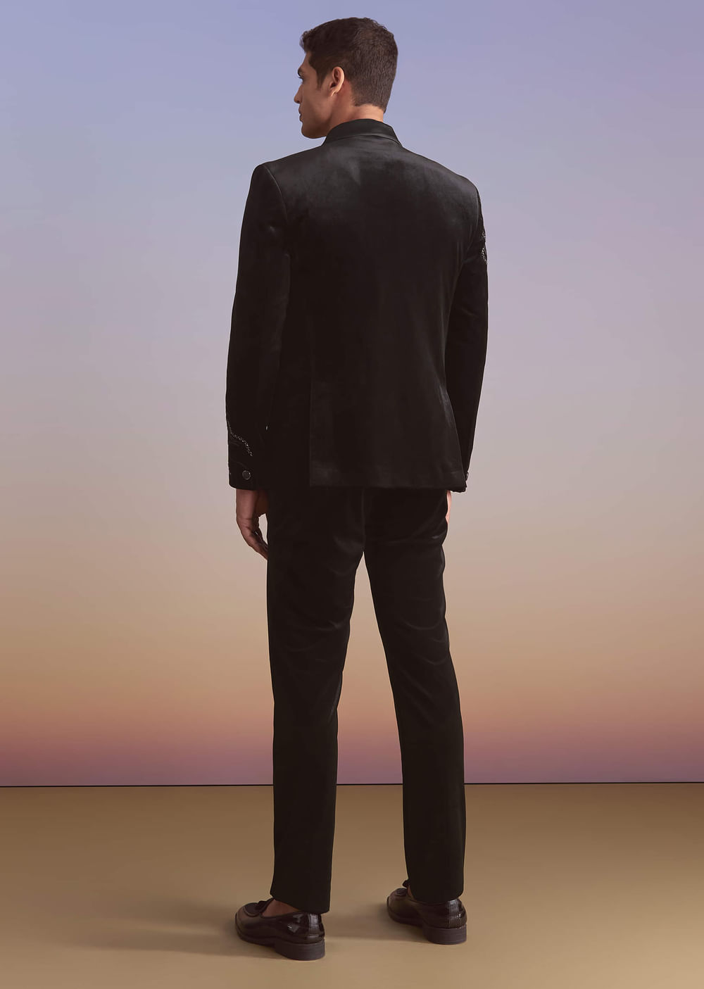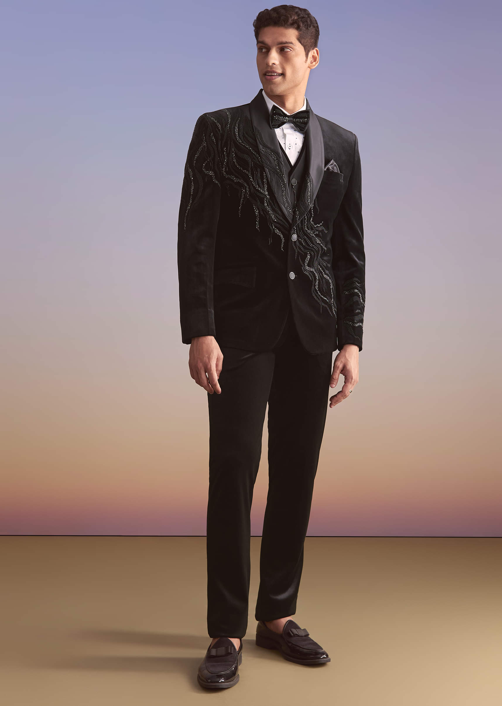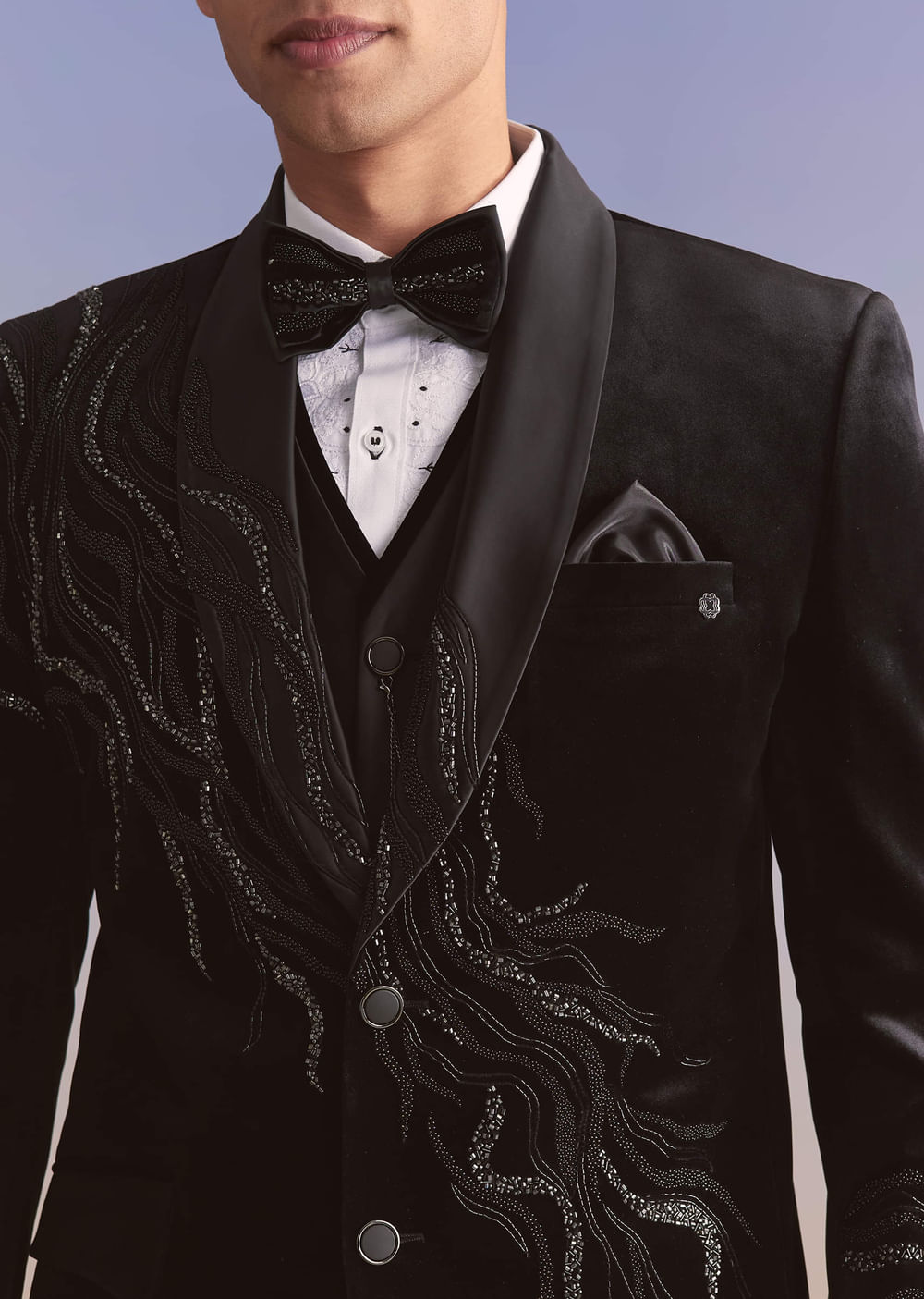 Black Velvet Tuxedo For Men With Cut Work And Beads Embroidery