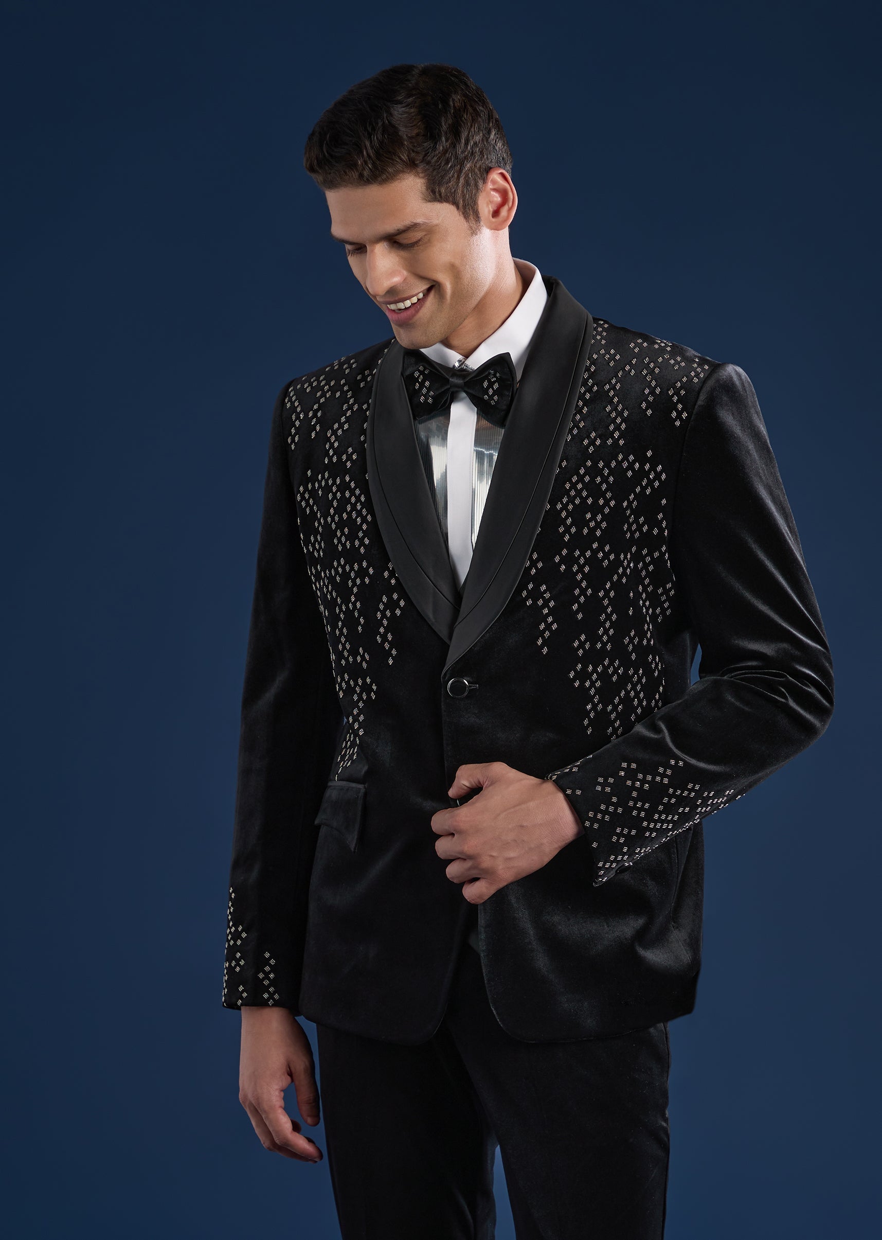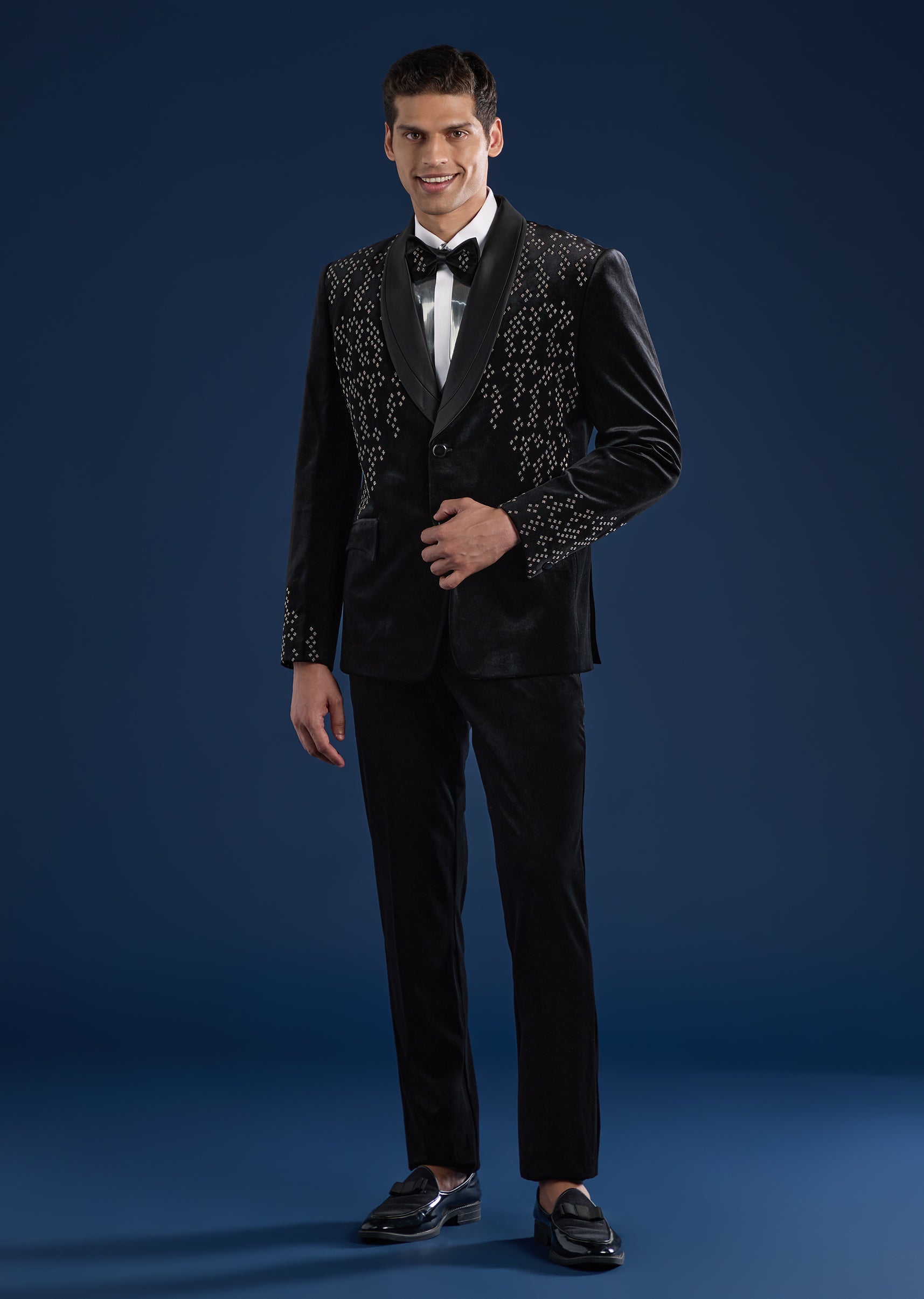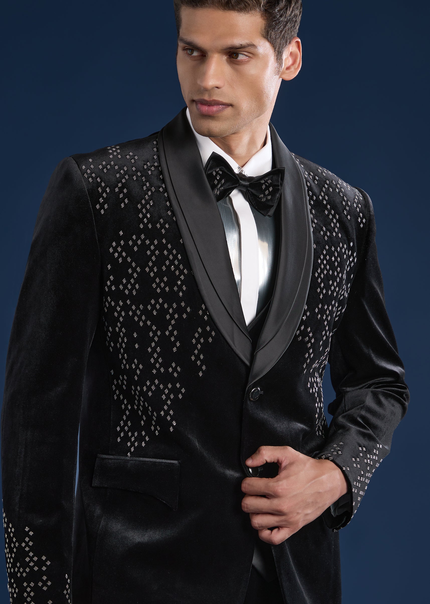 Bold and contemporary, this black tuxedo set is crafted in plush velvet for statement evening dressing. Featuring a mandarin collar and bead embellishments, the set includes a tuxedo, waistcoat, shirt,... More Product Details