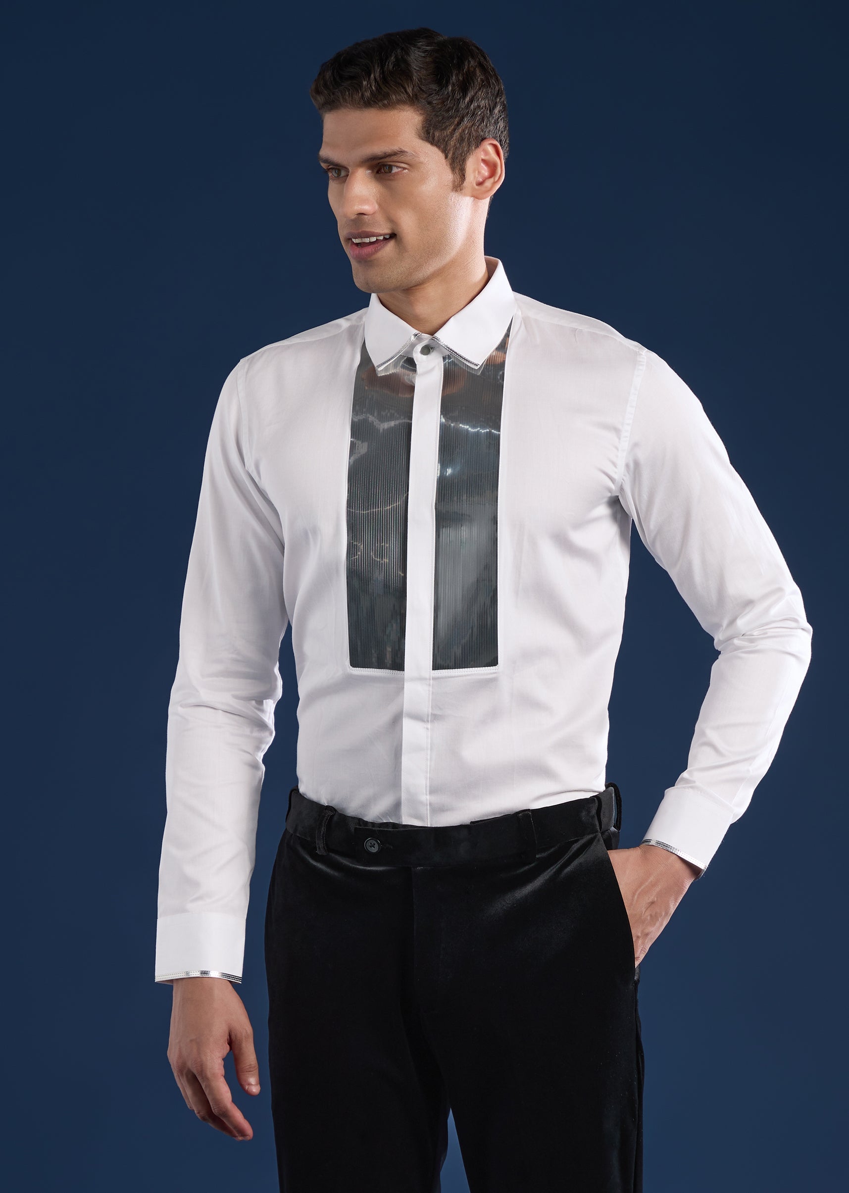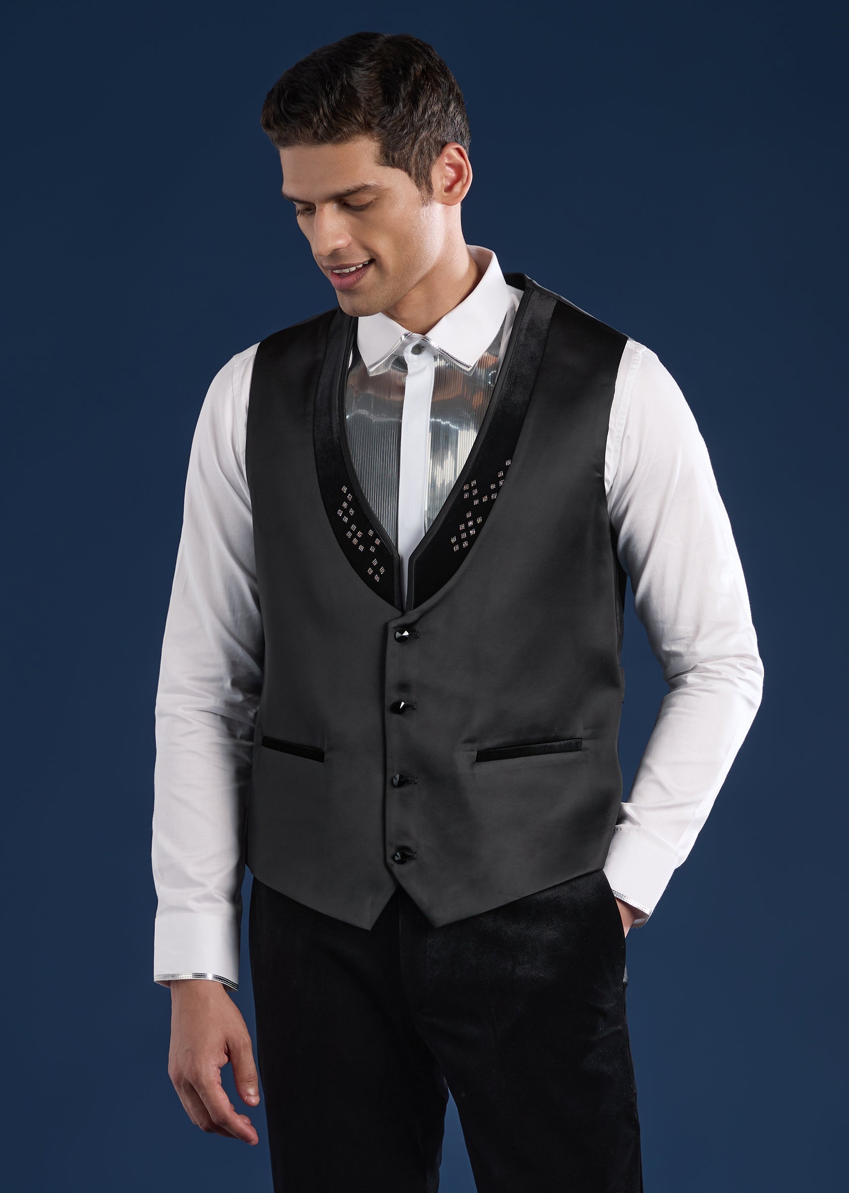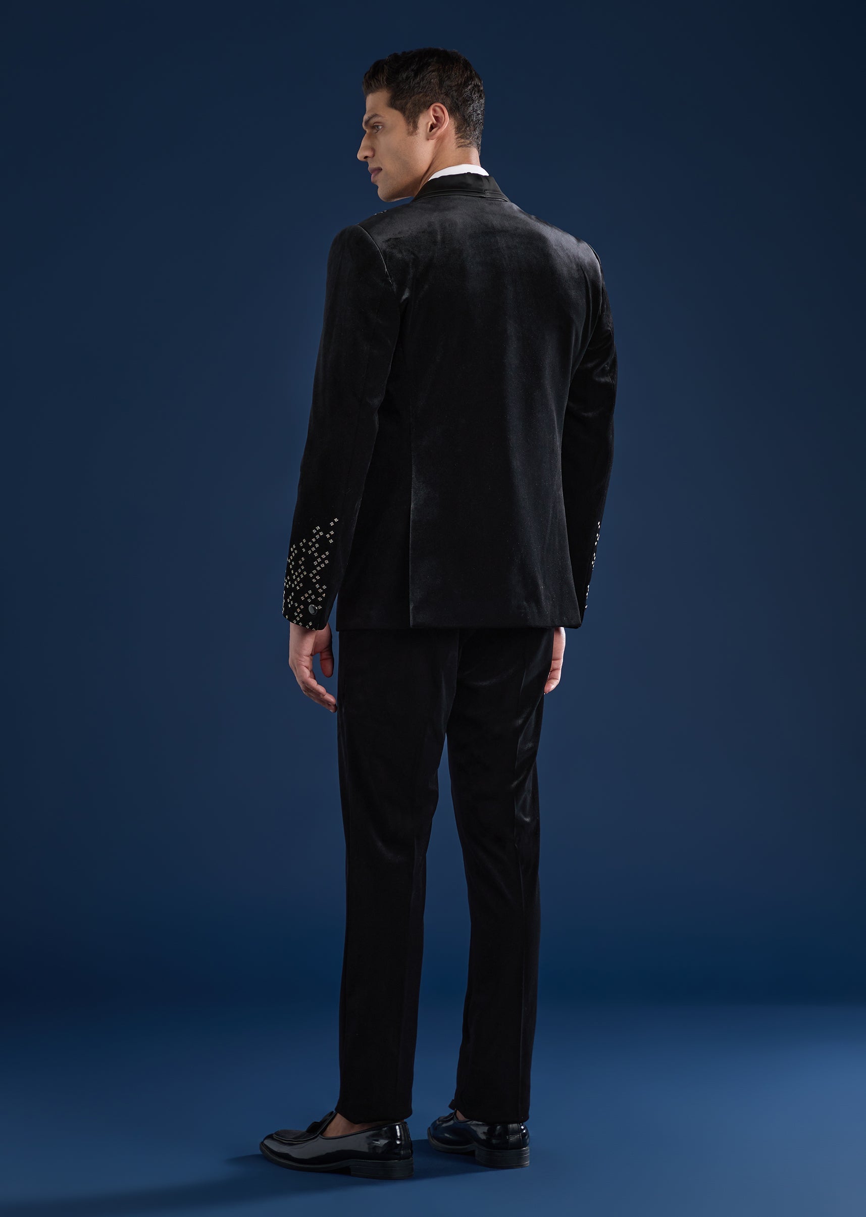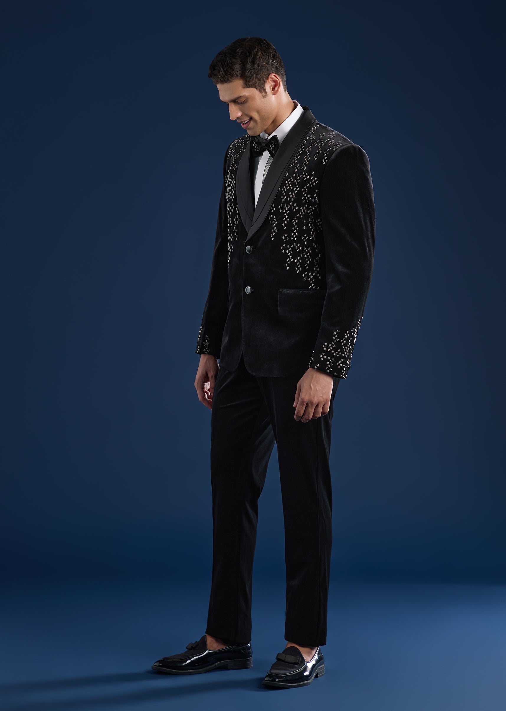 Bold and contemporary, this black tuxedo set is crafted in plush velvet for statement evening dressing. Featuring a mandarin collar and bead embellishments, the set includes a tuxedo, waistcoat, shirt,... More Product Details