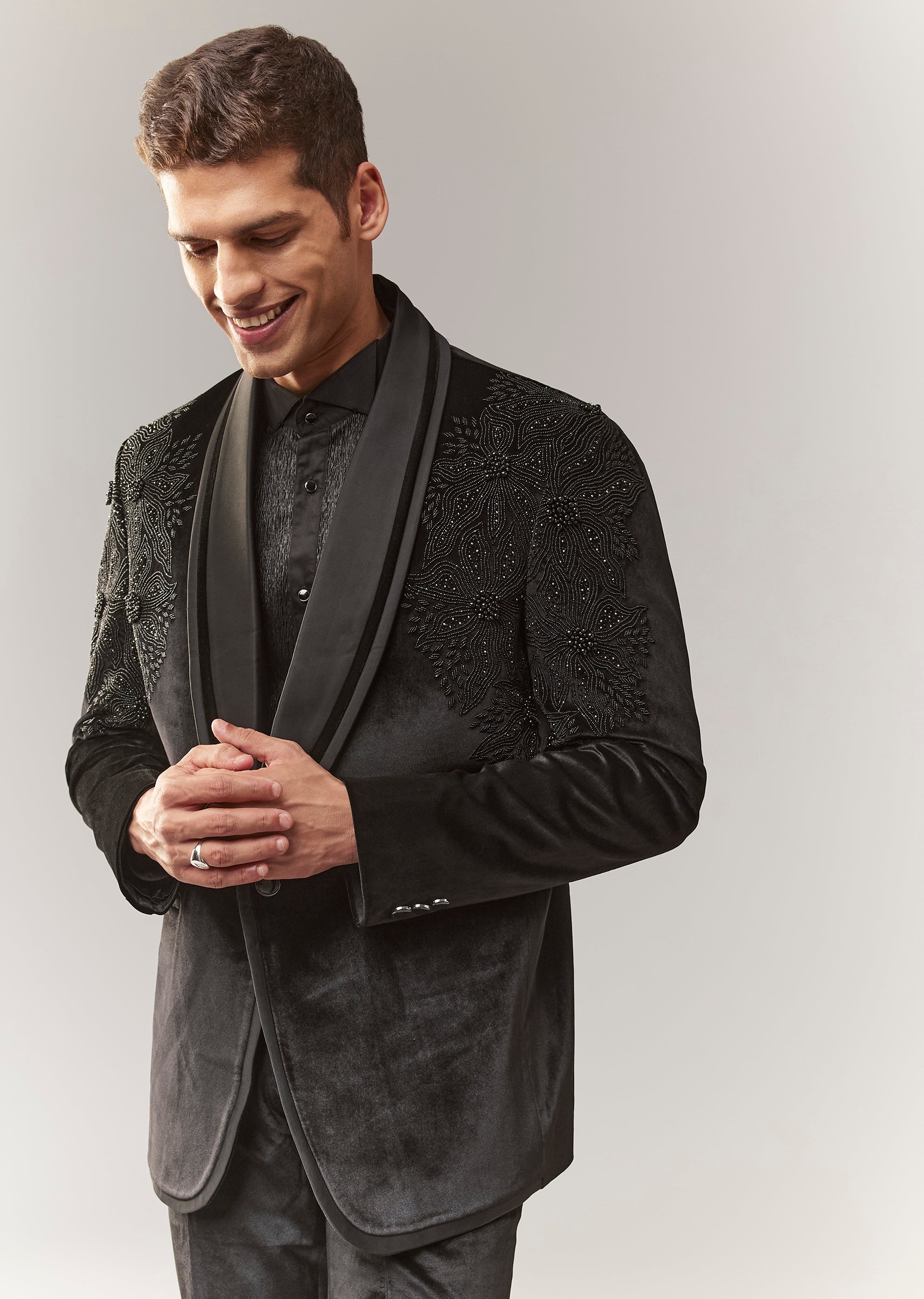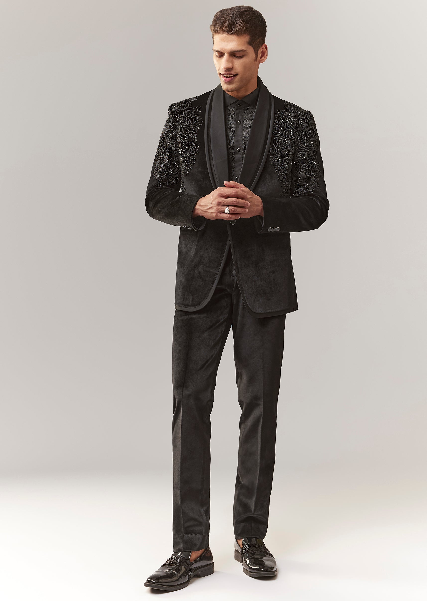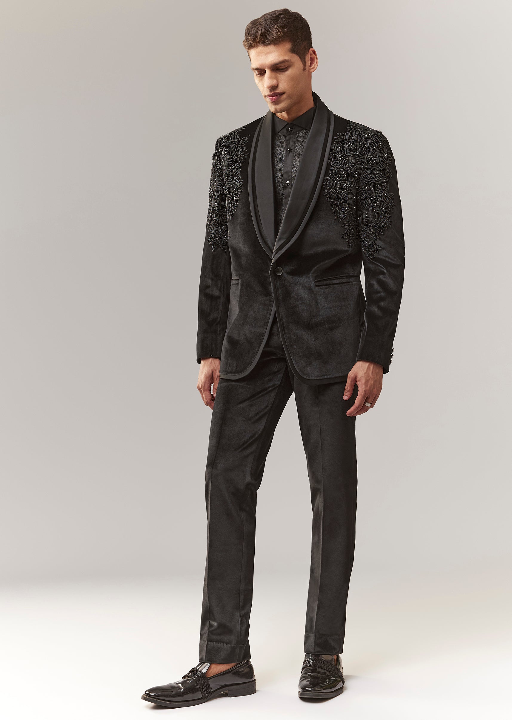 A luxe black velvet tuxedo with bead and resham detailing, featuring a mandarin collar and full sleeves. Front button closure. Includes tuxedo shirt + trouser styling (mid-waist straight pants). A... More Product Details