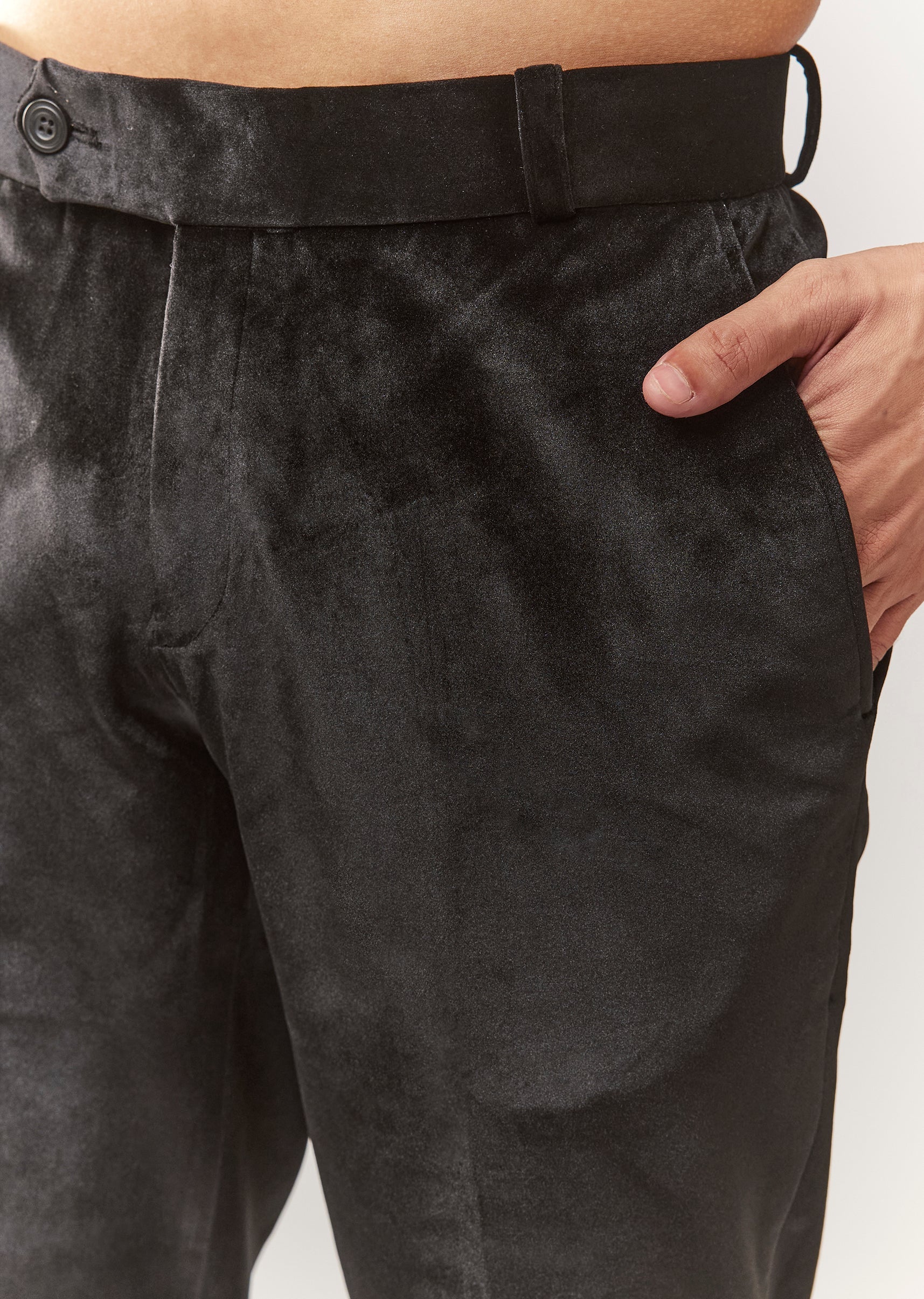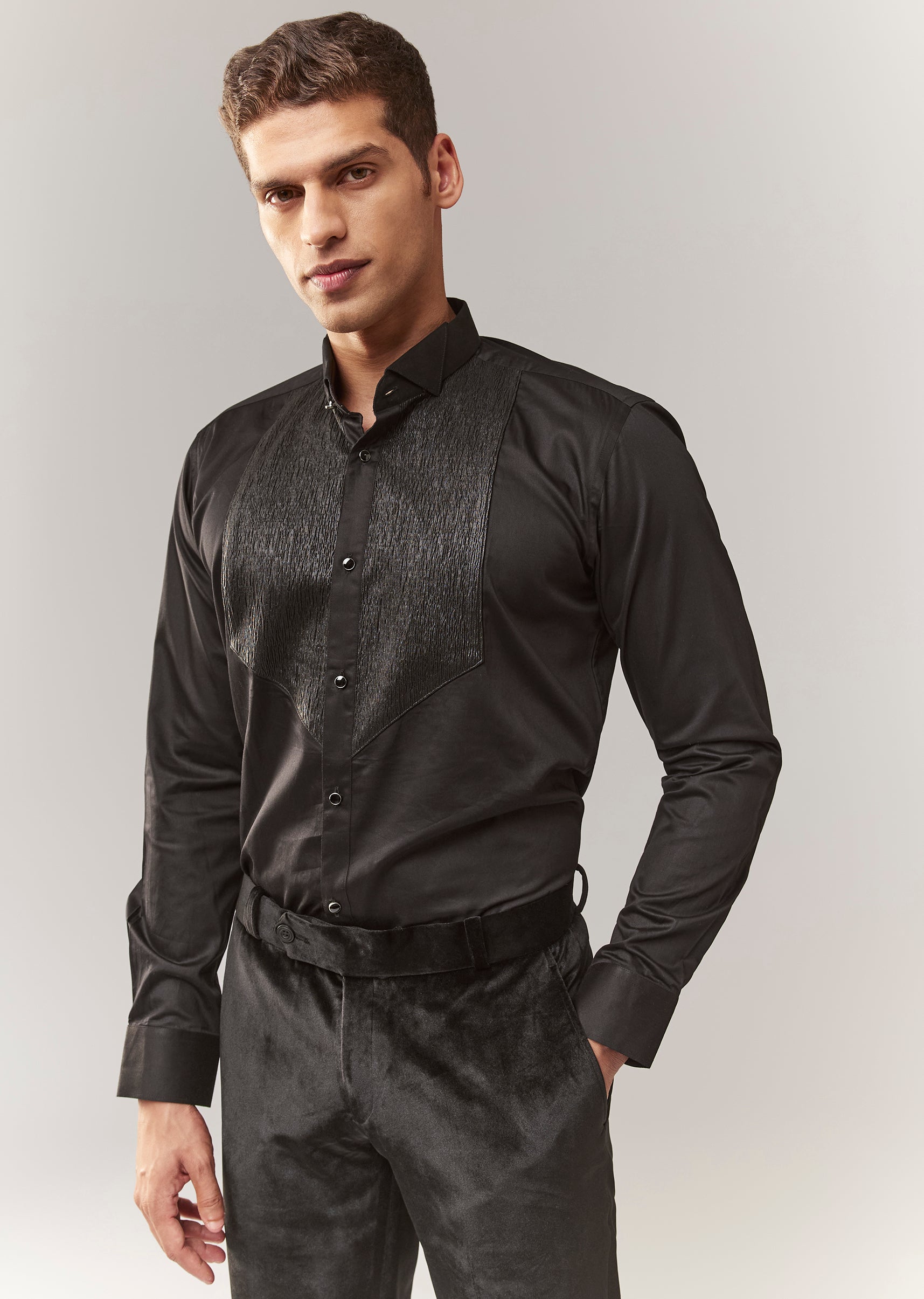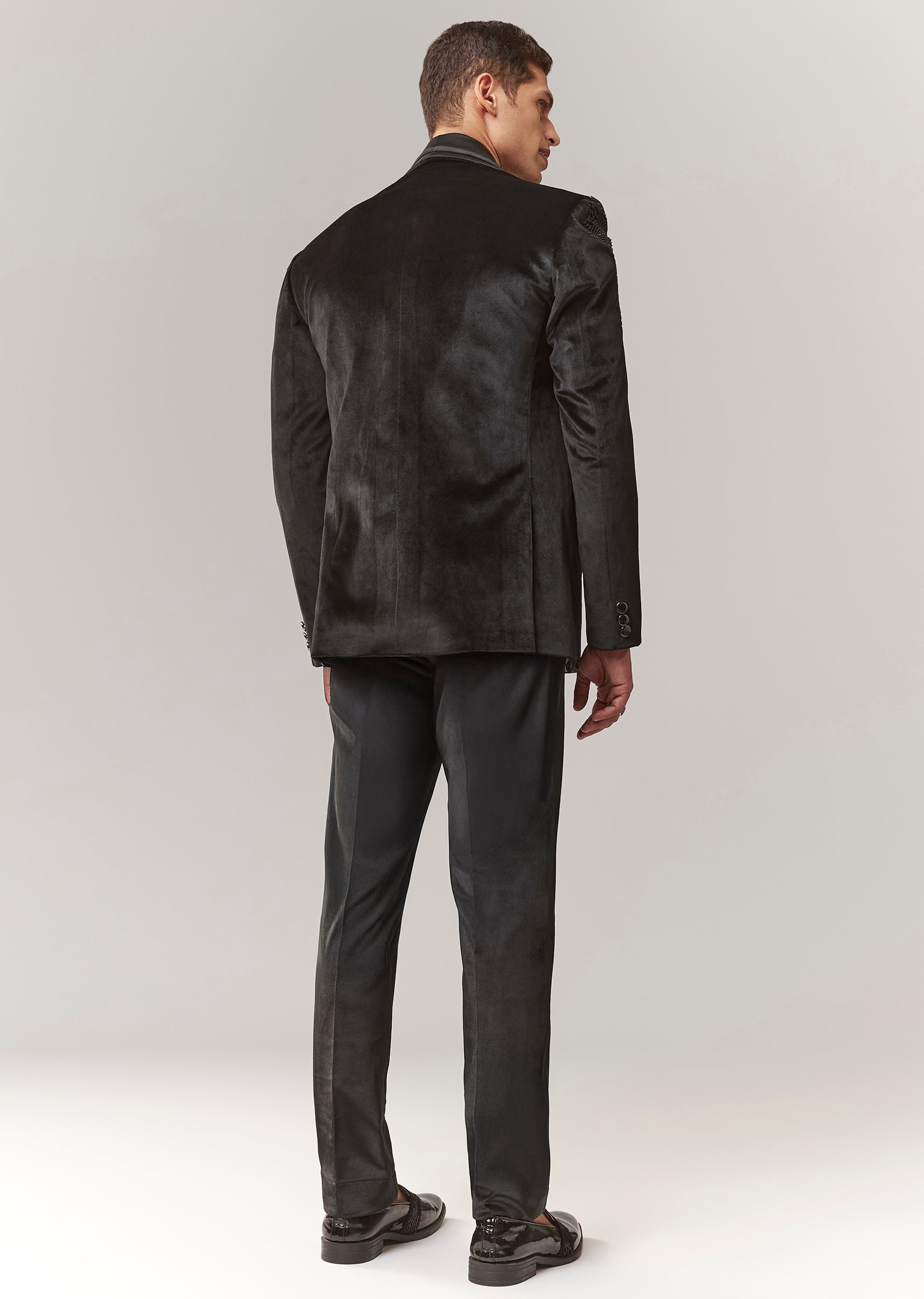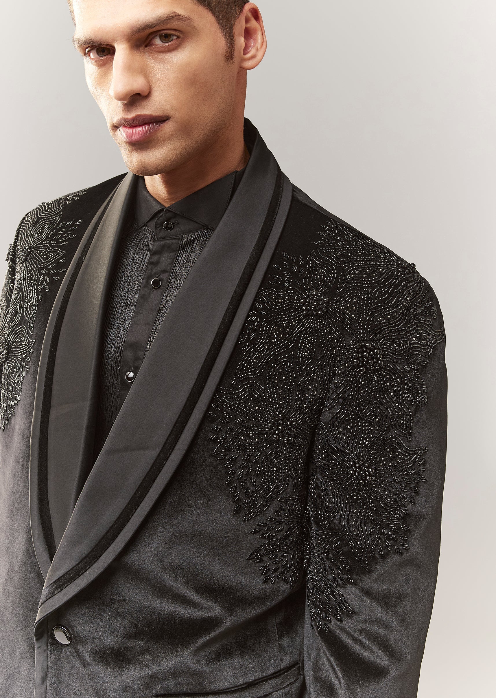 A luxe black velvet tuxedo with bead and resham detailing, featuring a mandarin collar and full sleeves. Front button closure. Includes tuxedo shirt + trouser styling (mid-waist straight pants). A... More Product Details