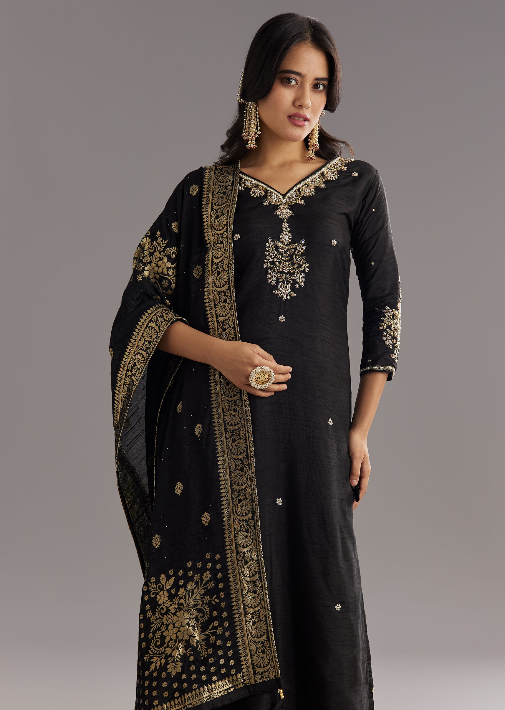 This black viscose silk kurta set includes rich cut dana, moti, and zari embroidery on the kurta with a jacquard weave dupatta. Great for intimate traditional functions. Awarded as the... More Product Details
