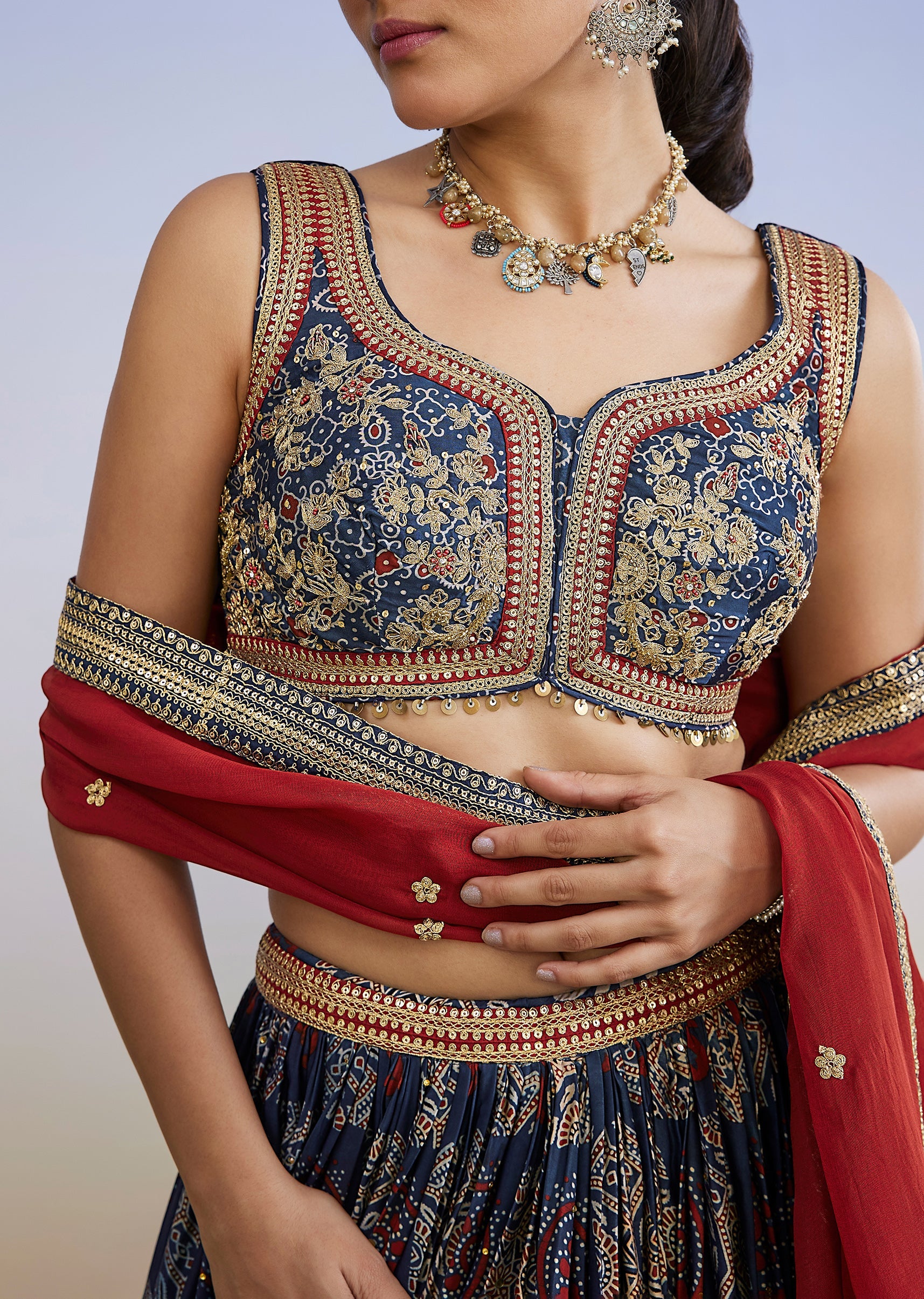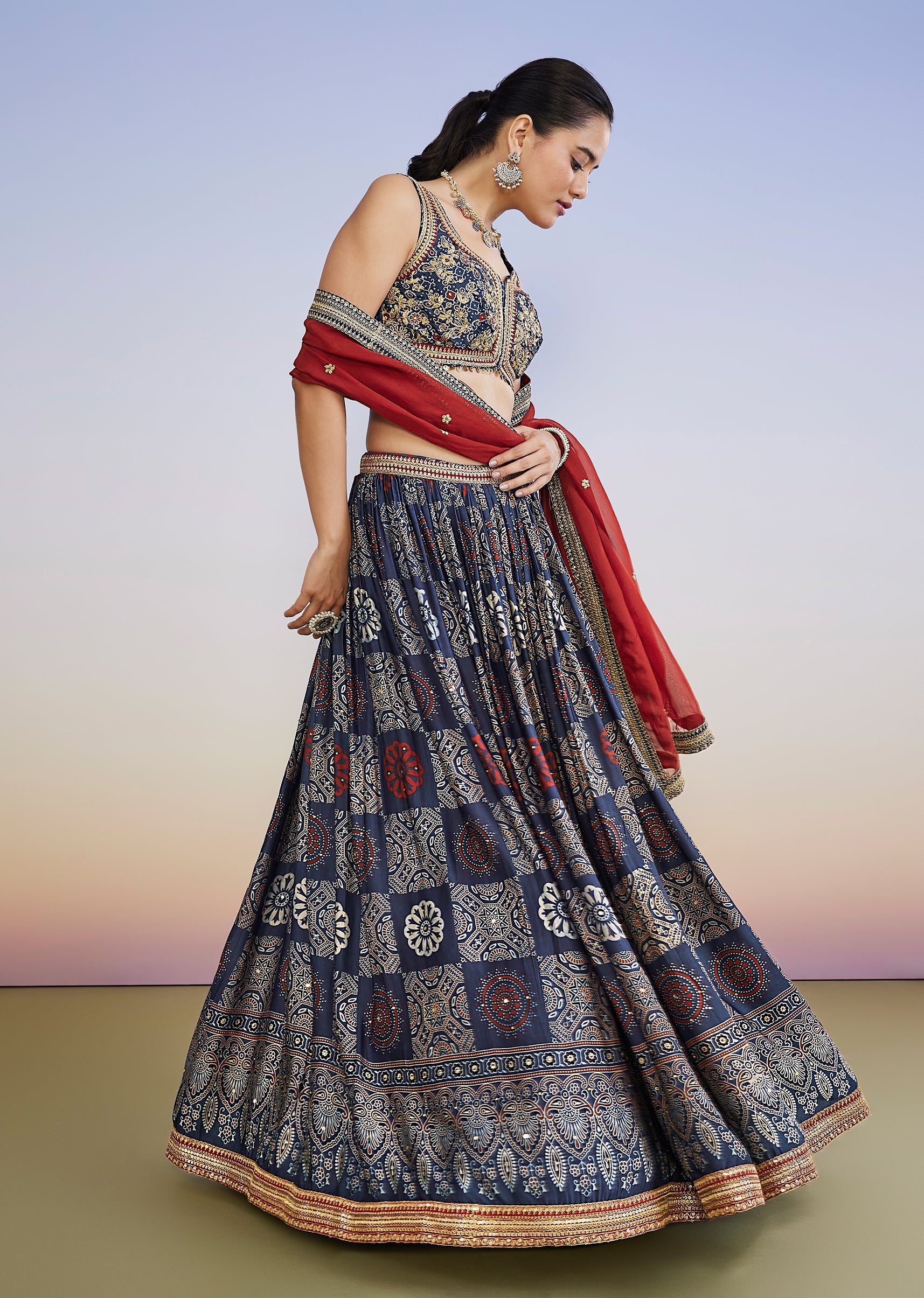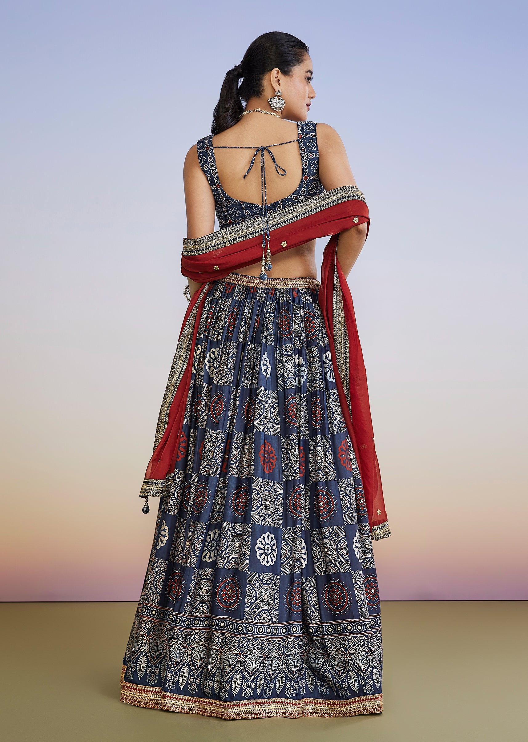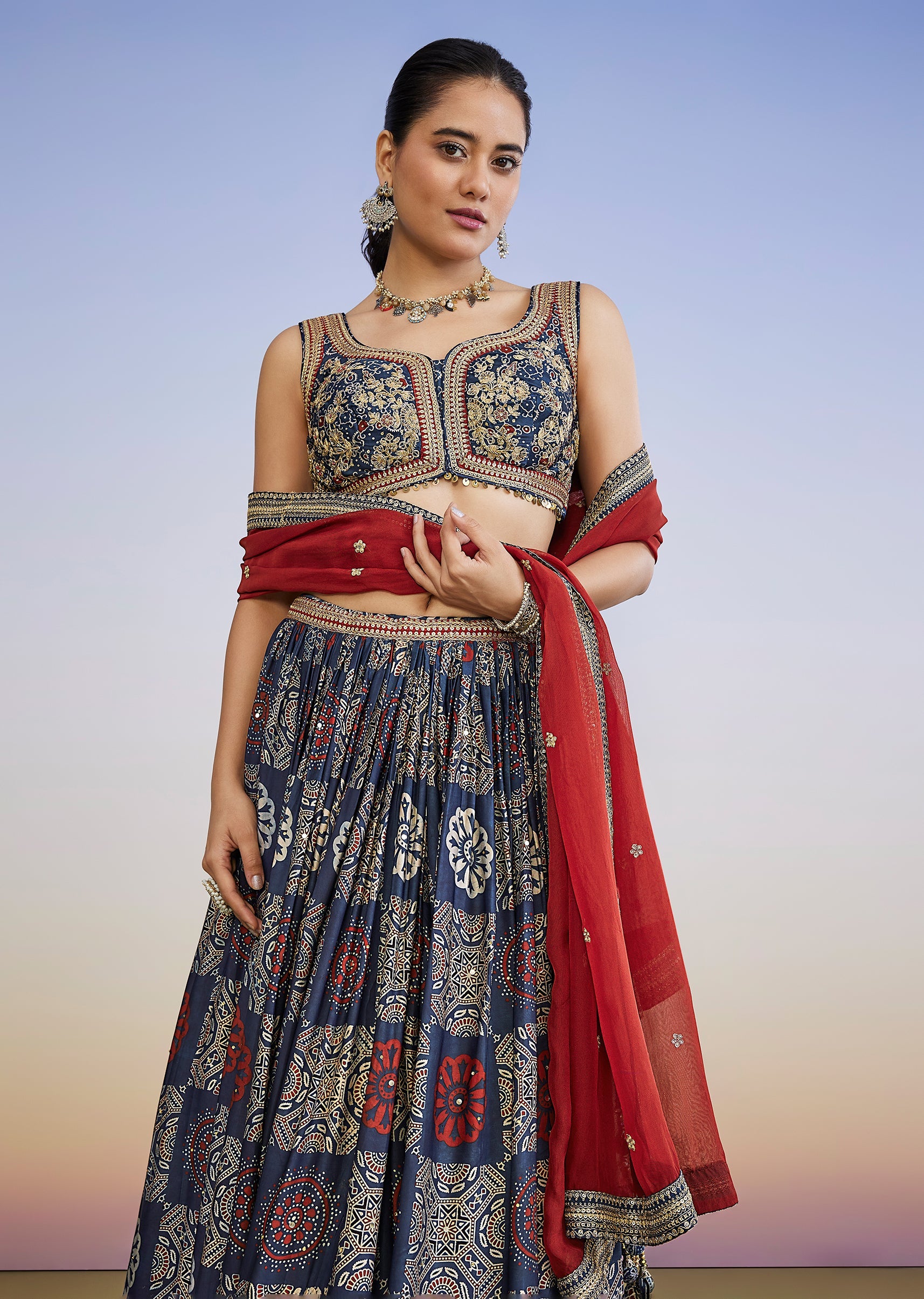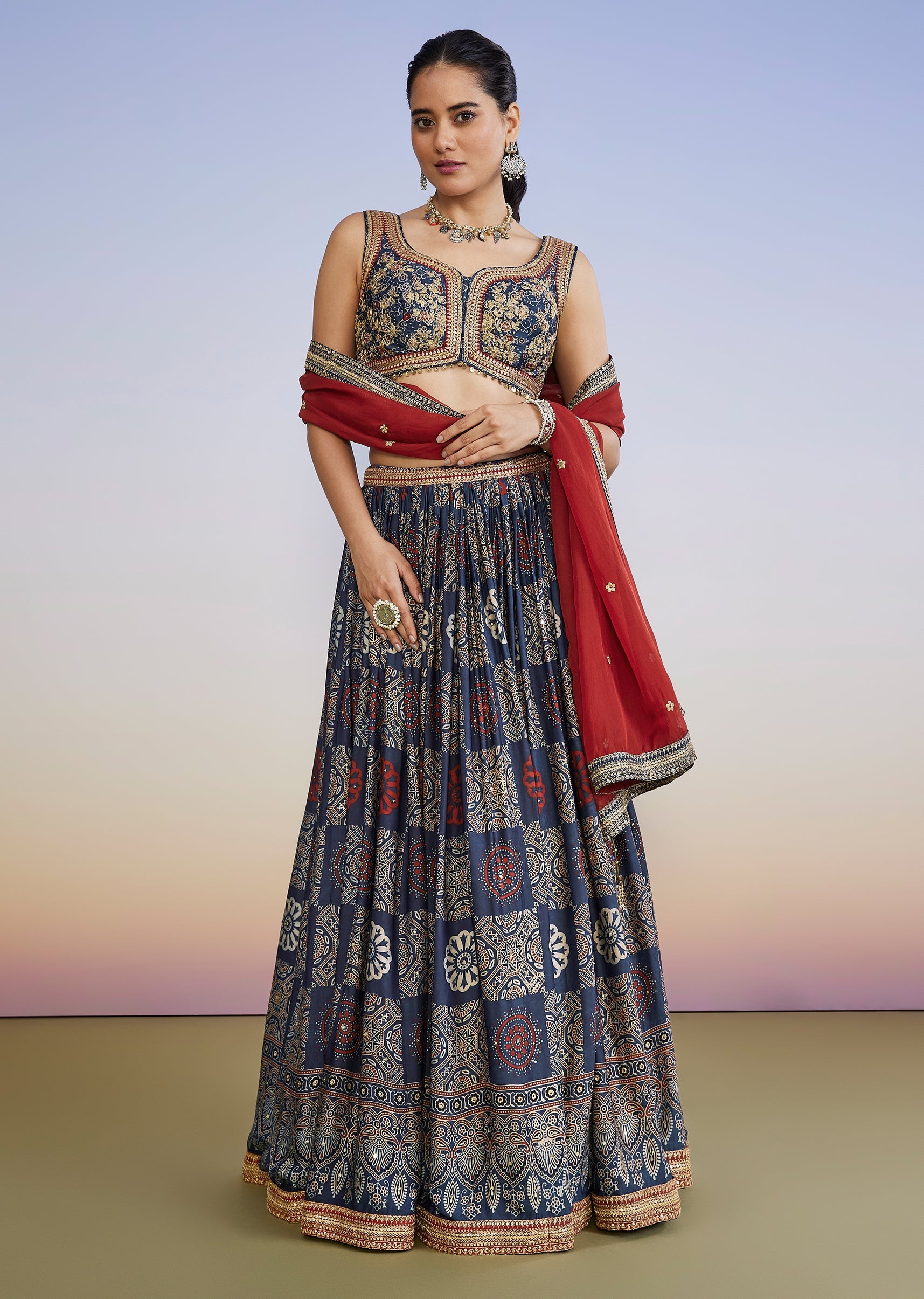 Bring a striking bridesmaid look to mehendi and sangeet celebrations with this blue printed lehenga set featuring pure hand-dyed Ajrakh craft. The sleeveless sweetheart-neck choli is paired with a circular-flare... More Product Details