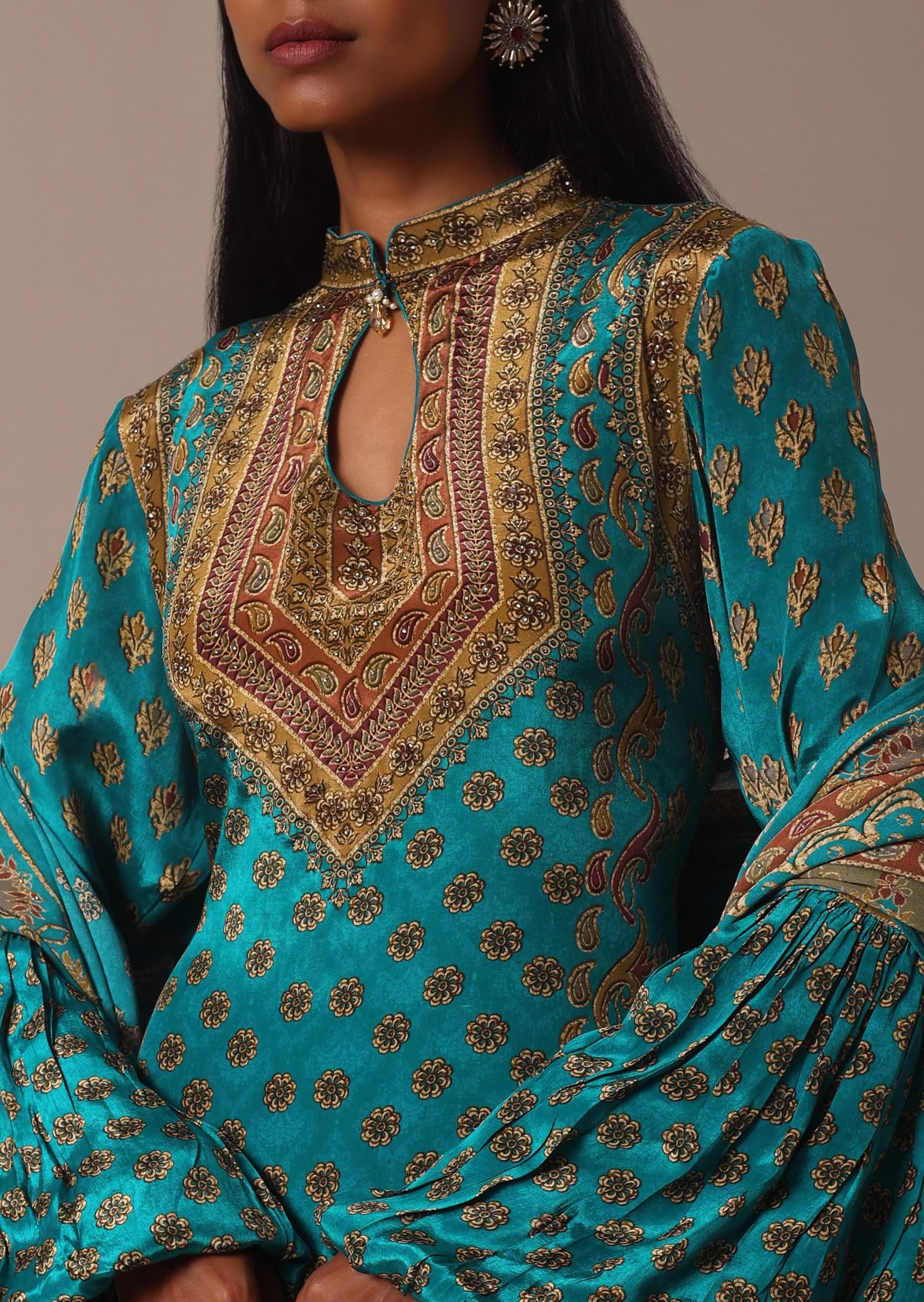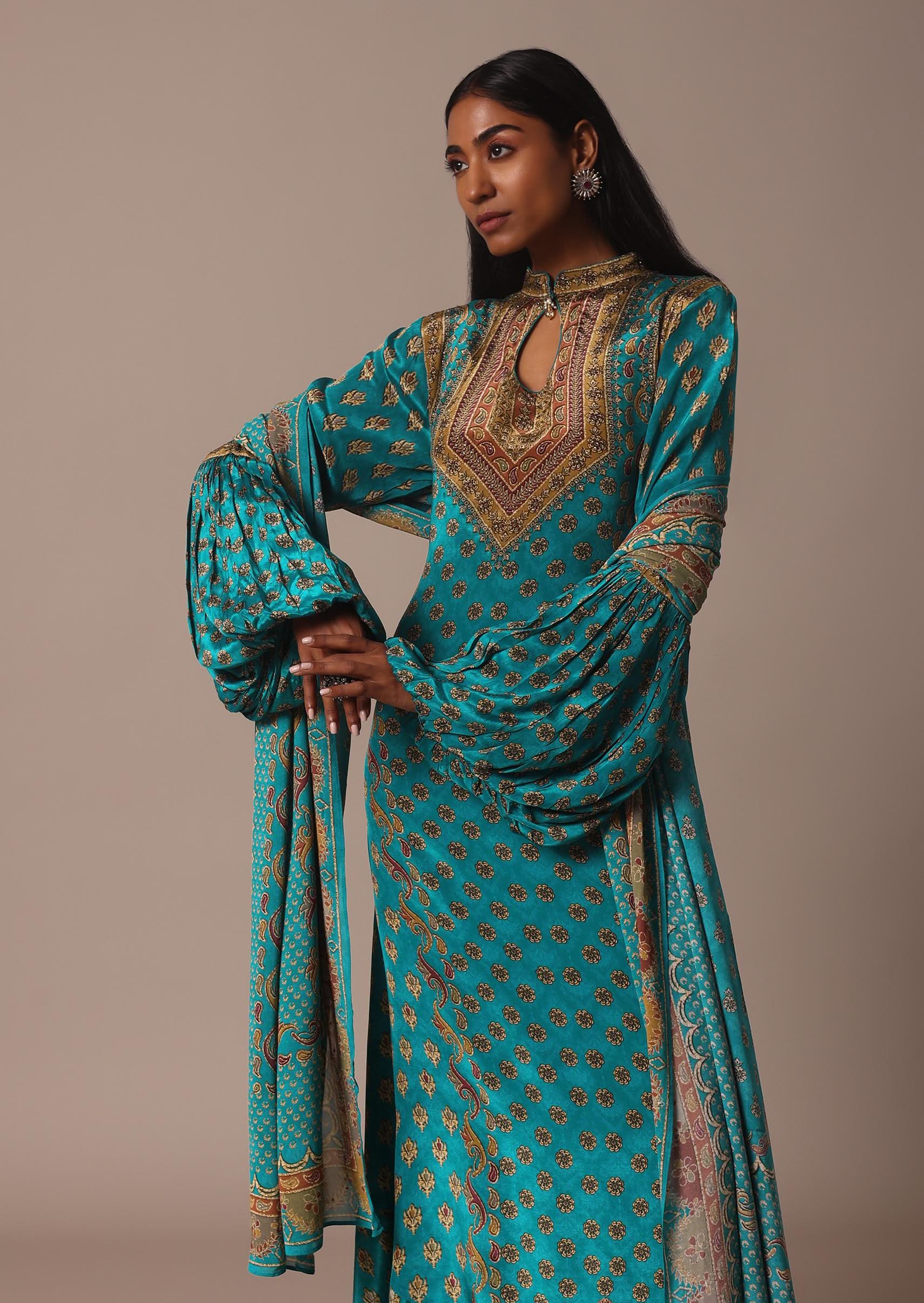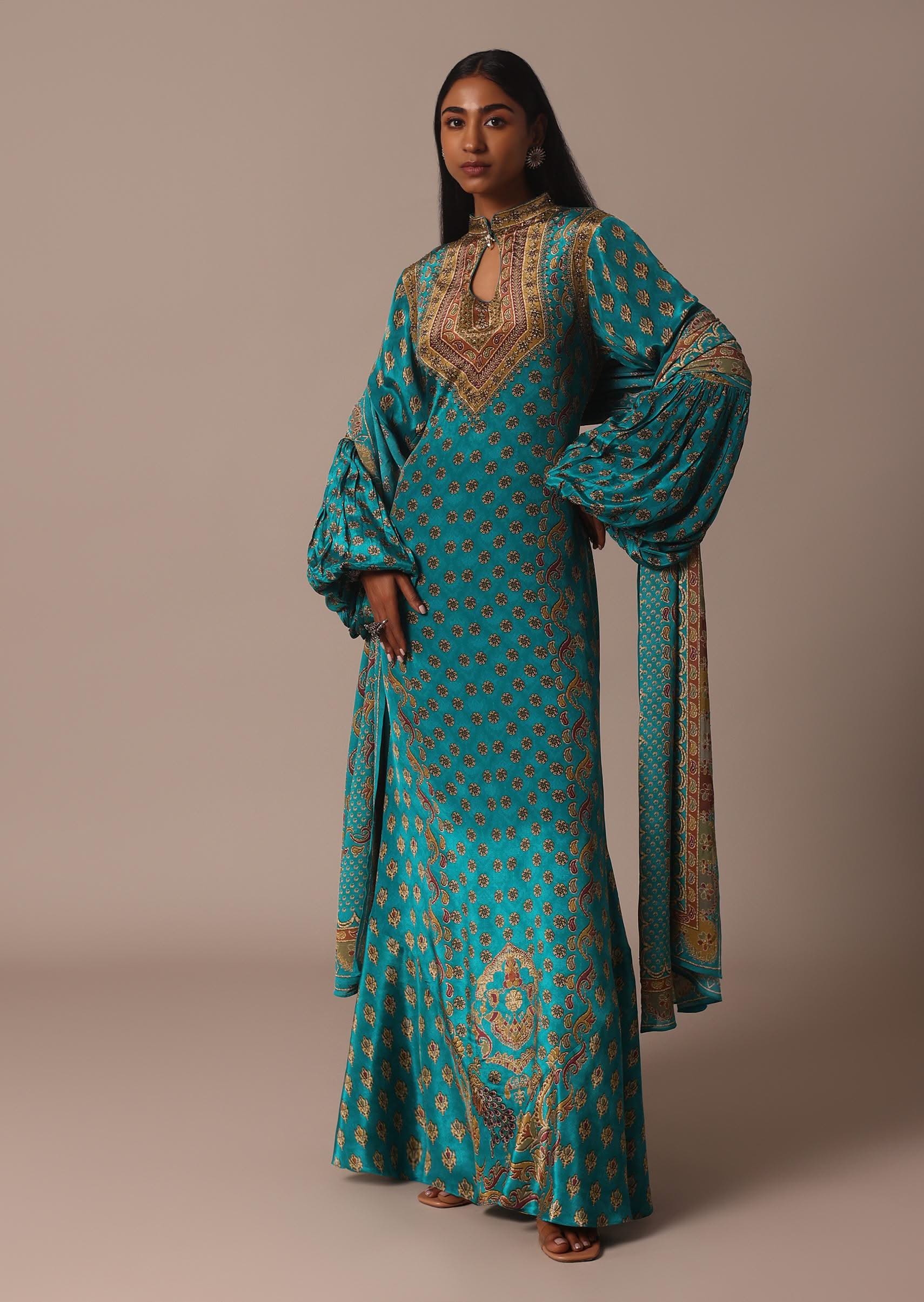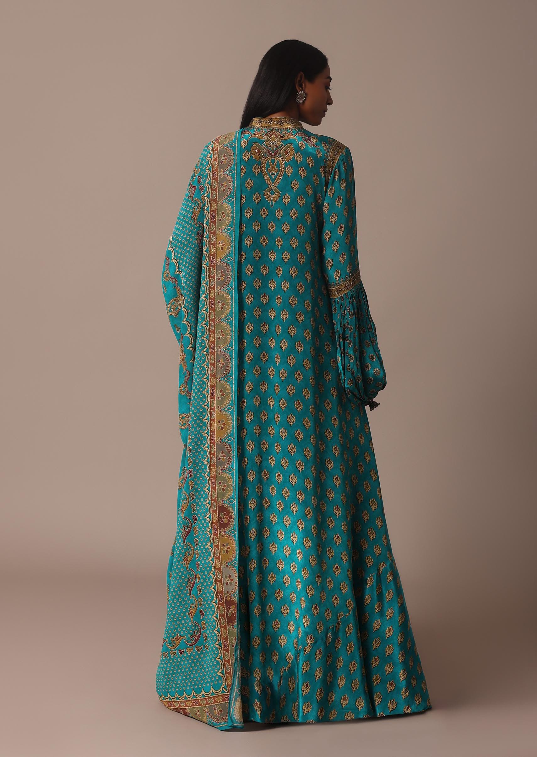 An eye catching ensemble that will hearts and endless compliments is this beautiful anarkali set will. Set on a soothing blue hue it is crafted from crepe fabric. Elevated with... More Product Details